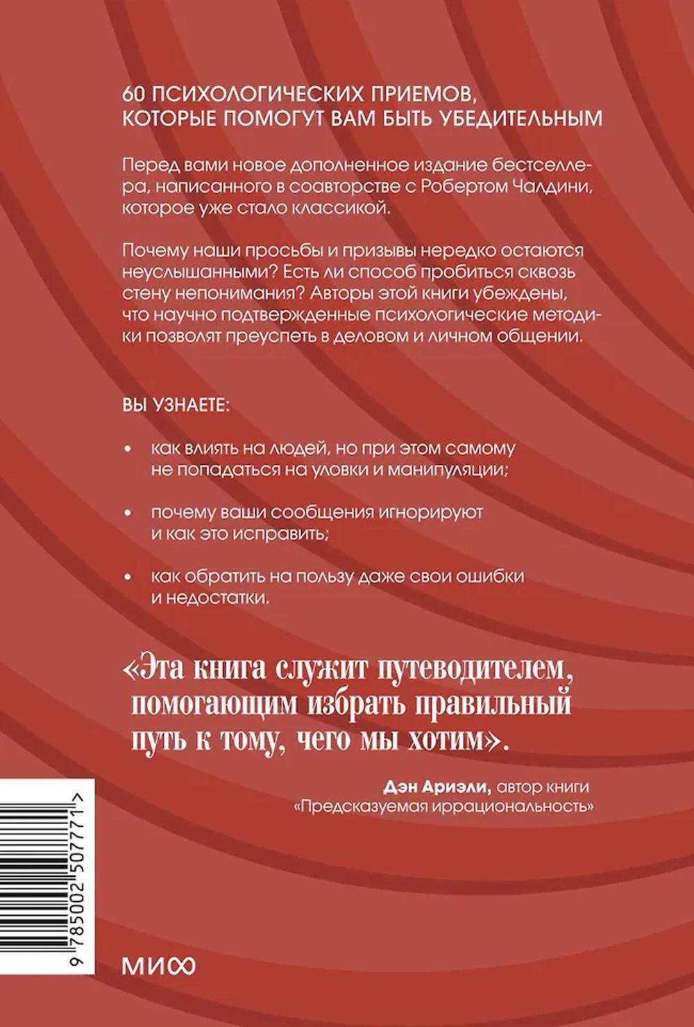 Обновленное и дополненное издание мирового бестселлера «Психология убеждения», где раскрываются приемы, помогающие эффективно общаться и этично выстраивать отношения с окружающими. Почему наши просьбы и призывы нередко остаются неуслышанными? Есть ли способ пробиться сквозь стену непонимания? Конечно. На помощь приходит наука. Авторы книги предлагают 60 научно подтвержденных психологических методик, которые помогут и в деловом, и в личном общении.| Издательство | Манн, Иванов и Фербер |