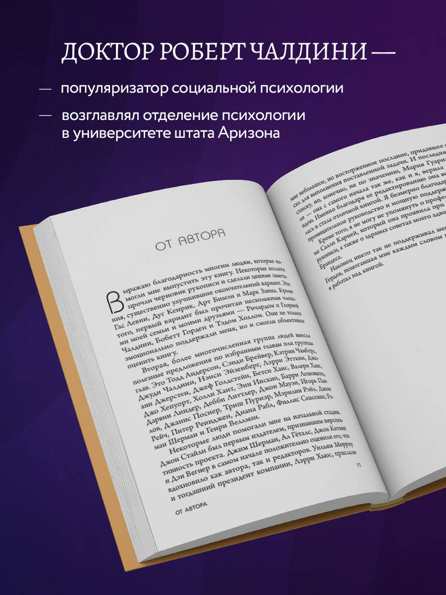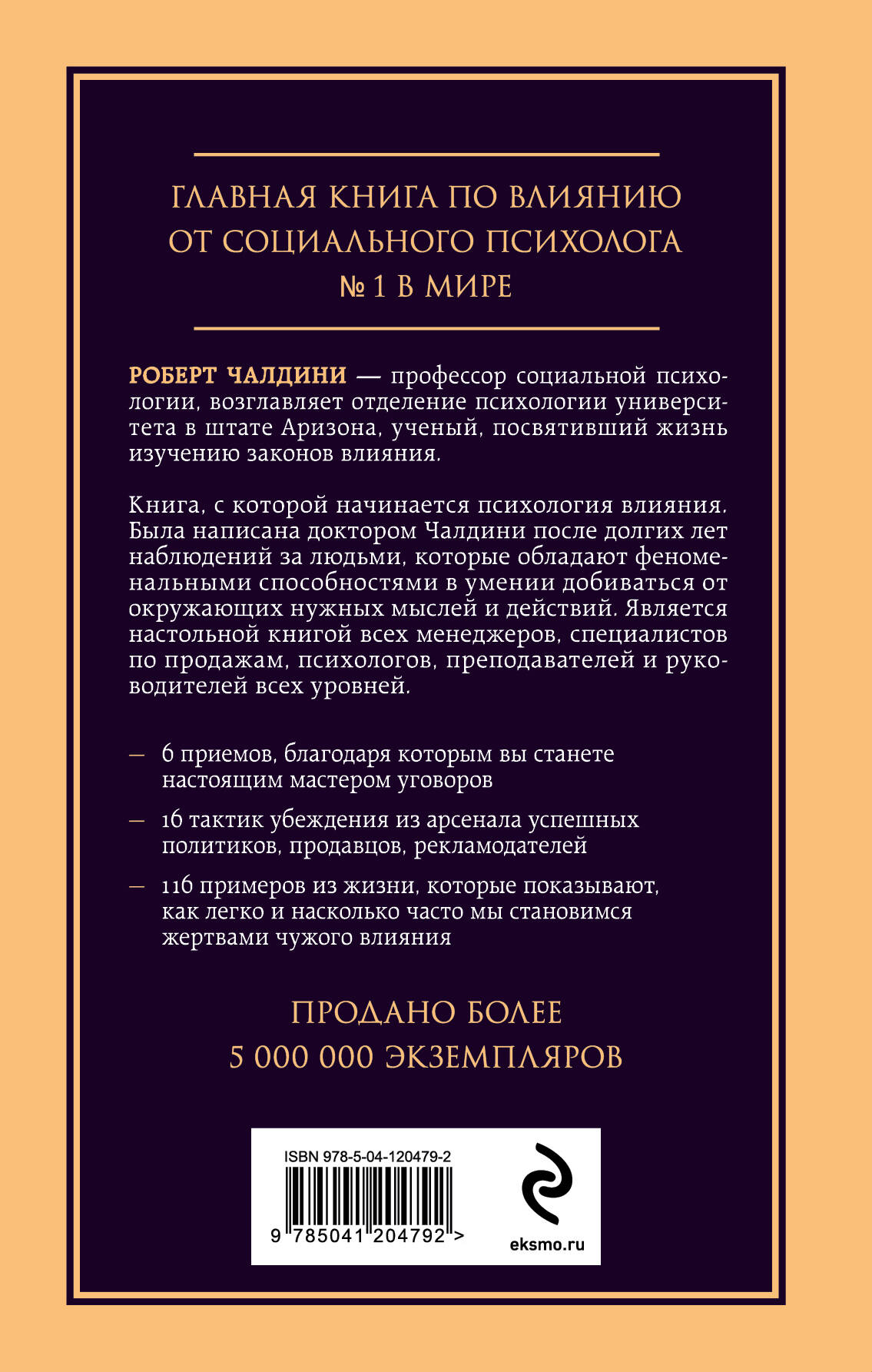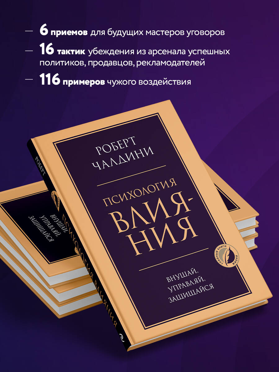 «Главные книги жизни» - это лучшие книги по психологии и саморазвитию, которые признал весь мир и успели оценить десятки и сотни тысяч читателей в России. Вдохновляйтесь, меняйтесь, действуйте - вы на верном пути! Ведь книги, как и люди, приходят в нашу жизнь не случайно! ГЛАВНАЯ КНИГА ПО ВЛИЯНИЮ ОТ СОЦИАЛЬНОГО ПСИХОЛОГА № 1 В МИРЕ! Доктор Роберт Чалдини - популяризатор социальной психологии, возглавлял отделение психологии в университете штата Аризона. Р. Чалдини много лет изучал принципы успешных продаж. На основе своих исследований он написал руководство по мотивации, ставшее мировым бестселлером и настольной книгой амбициозных политиков, менеджеров, рекламодателей и всех желающих убеждать и добиваться своего. - 6 приемов, благодаря которым вы станете настоящим мастером уговоров. - 16 тактик убеждения из арсенала успешных политиков, продавцов, рекламодателей. - 116 примеров из жизни, которые показывают, как легко и насколько часто мы становимся жертвами чужого влияния. ПРОДАНО БОЛЕЕ 5 000 000 ЭКЗЕМПЛЯРОВ.| Издательство | ООО "Издательство "Эксмо" |