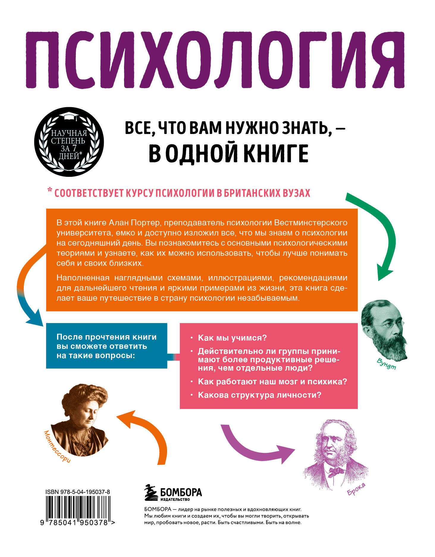 В этой книге Алан Портер, преподаватель психологии Вестминстерского университета, емко и доступно изложил все, что мы знаем о психологии на сегодняшний день. Вы познакомитесь с основными психологическими теориями и узнаете, как их можно использовать, чтобы лучше понимать себя и своих близких. Наполненная наглядными схемами, иллюстрациями, рекомендациями для дальнейшего чтения и яркими примерами из жизни, эта книга сделает ваше путешествие в страну психологии незабываемым. Из этой книги вы узнаете: - Как человек учится. - Настолько же продуктивны решения группы, нежели частные. - Как ученые исследуют функции мозга. - Какова структура личности.| Издательство | ООО "Издательство "Эксмо" |