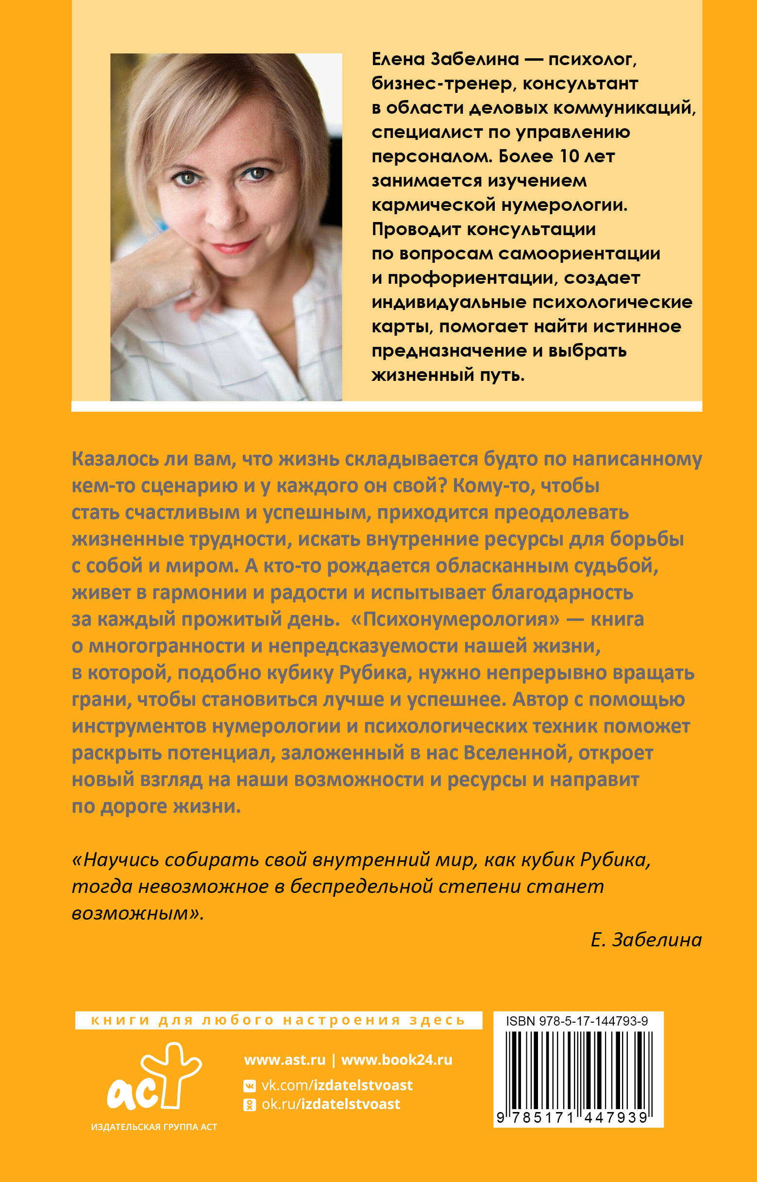 Елена Забелина - психолог, бизнес-тренер, консультант в области деловых коммуникаций, специалист по управлению персоналом. Более 10 лет занимается изучением кармической нумерологии. Проводит консультации по вопросам самоориентации и профориентации, создает индивидуальные психологические карты, помогает найти истинное предназначение и выбрать жизненный путь. Казалось ли вам, что жизнь складывается будто по написанному кем-то сценарию и у каждого он свой? Кому-то, чтобы стать счастливым и успешным приходится преодолевать жизненные трудности, искать внутренние ресурсы для борьбы с собой и миром. А кто-то рождается обласканным судьбой, живет в гармонии и радости и испытывает благодарность за каждый прожитый день. "Психонумерология" - книга о многогранности и непредсказуемости нашей жизни, в которой, подобно кубику Рубика, нужно непрерывно вращать грани, чтобы становиться лучше и успешнее. Автор с помощью инструментов нумерологии и психологических техник поможет раскрыть потенциал, заложенный в нас Вселенной, откроет новый взгляд на наши возможности и ресурсы и направит по дороге жизни. "Научись собирать свой внутренний мир, как кубик Рубика, тогда невозможное в беспредельной степени станет возможным". Е. Забелина| Издательство | Издательство "АСТ" |