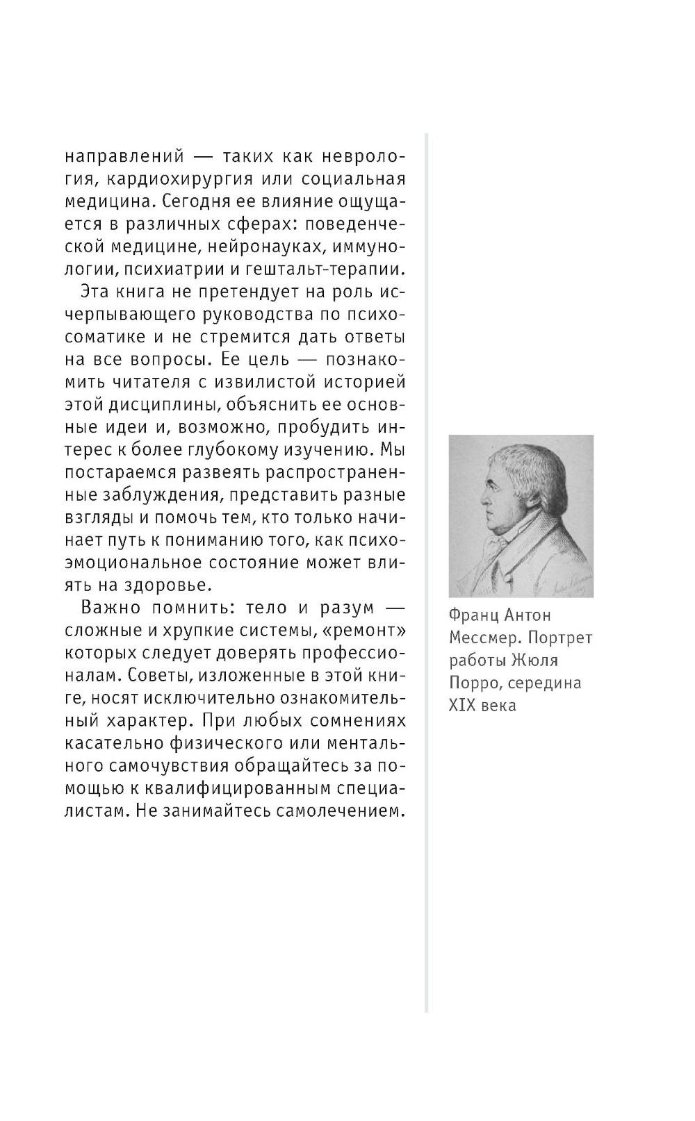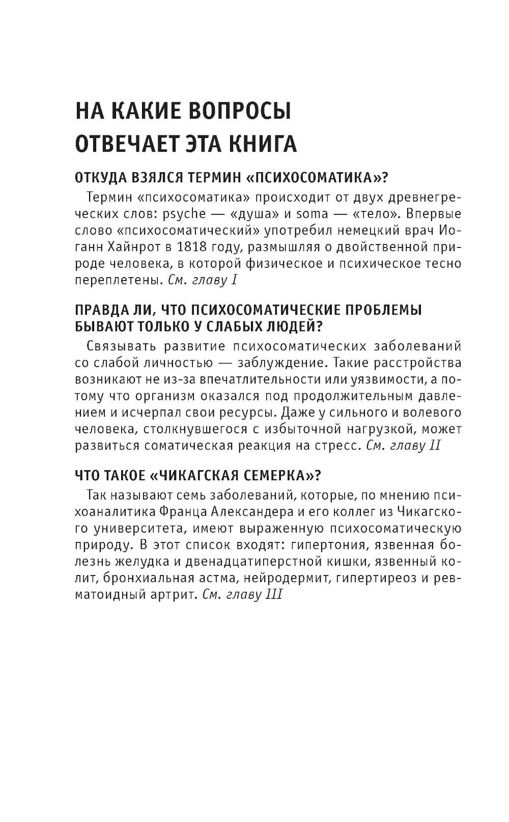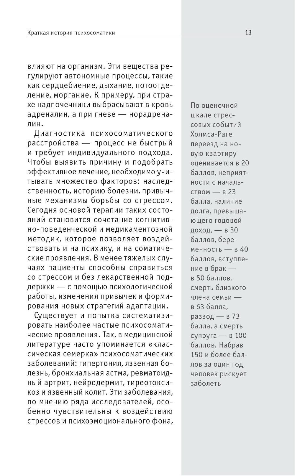 Вам кажется, что вы уже давно привыкли к стрессу и он на вас не влияет? Или же вас мучает хроническое недомогание, но причин ему не найти? Хотите понять, почему кто-то легко переносит большие нагрузки, а кто-то ломается под давлением? В конце концов, вам интересно узнать, что на самом деле скрывается за популярными мифами о психосоматике? Эта книга поможет разобраться в том, как связаны ваше тело и психика. В ней вы найдете краткую историю развития психосоматики, узнаете о связанных с ней мифах и заблуждениях, научитесь прислушиваться к своему телу. Особое внимание в книге уделено стрессу - главному врагу современного человека. Ведь от того, как вы с ним справляетесь, зависит ваше здоровье, энергия и качество жизни. Также в книге можно найти доказательные практические подходы, помогающие справиться со стрессом и наладить более гармоничные отношения между собой и своим телом. Внимание! Информация, содержащаяся в книге, не может служить заменой консультации врача. Необходимо проконсультироваться со специалистом перед совершением любых рекомендуемых действий.| Издательство | Эксмо |