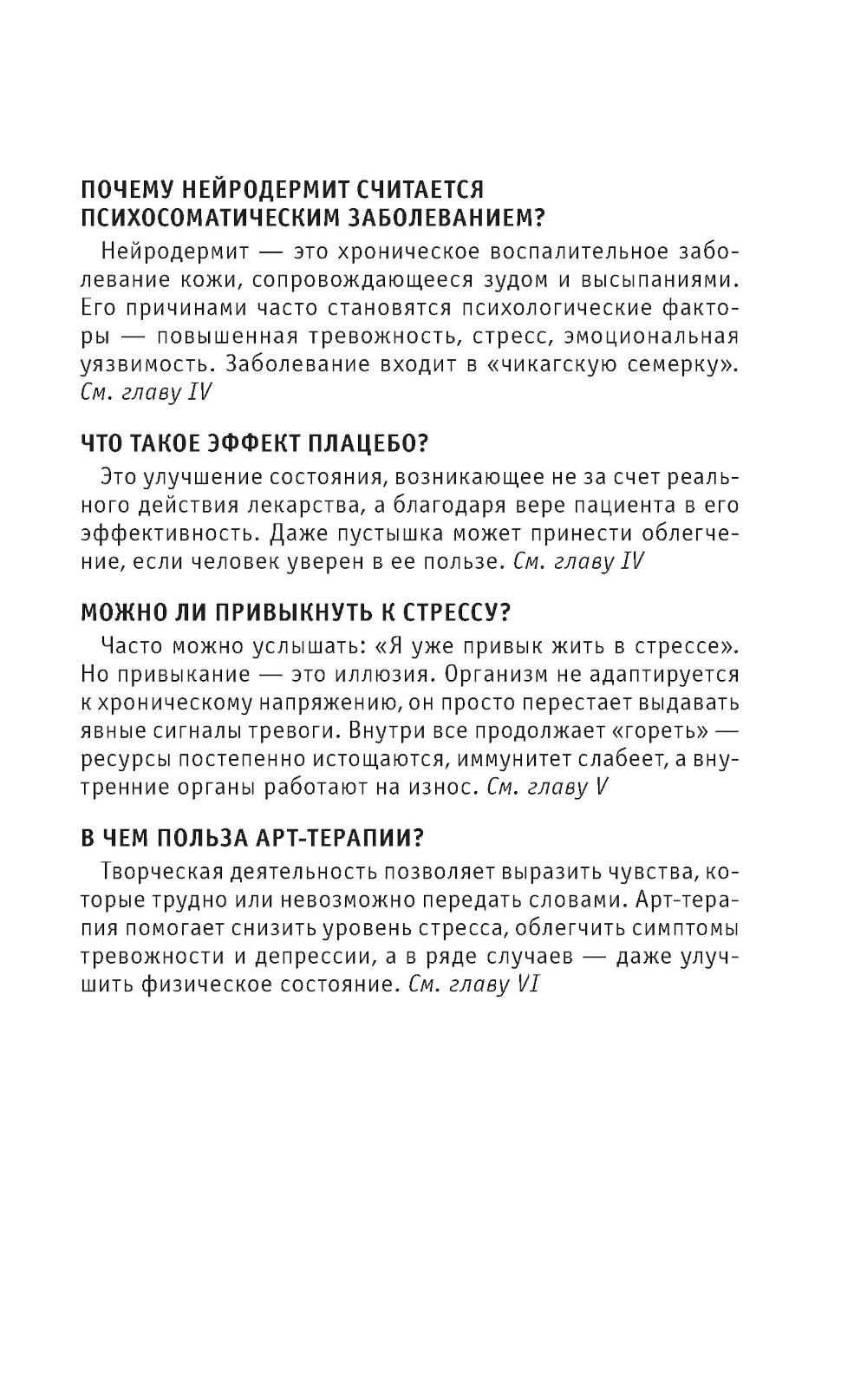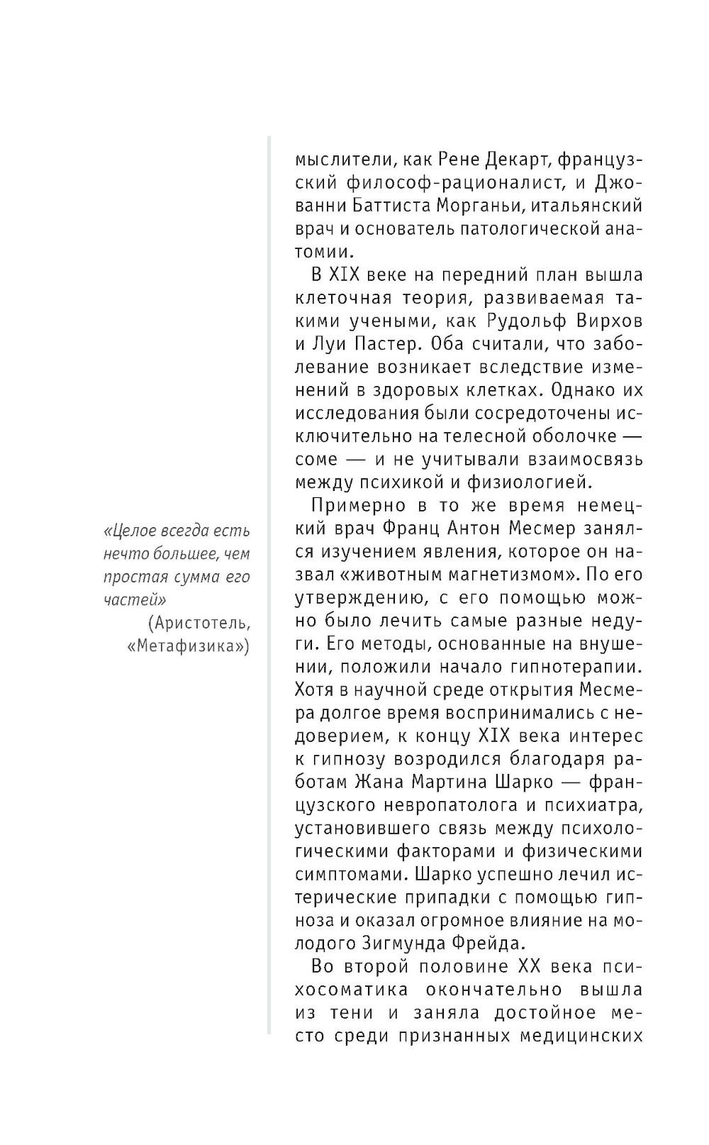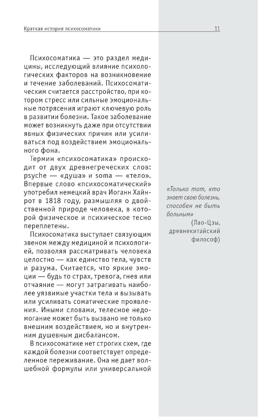 Вам кажется, что вы уже давно привыкли к стрессу и он на вас не влияет? Или же вас мучает хроническое недомогание, но причин ему не найти? Хотите понять, почему кто-то легко переносит большие нагрузки, а кто-то ломается под давлением? В конце концов, вам интересно узнать, что на самом деле скрывается за популярными мифами о психосоматике? Эта книга поможет разобраться в том, как связаны ваше тело и психика. В ней вы найдете краткую историю развития психосоматики, узнаете о связанных с ней мифах и заблуждениях, научитесь прислушиваться к своему телу. Особое внимание в книге уделено стрессу - главному врагу современного человека. Ведь от того, как вы с ним справляетесь, зависит ваше здоровье, энергия и качество жизни. Также в книге можно найти доказательные практические подходы, помогающие справиться со стрессом и наладить более гармоничные отношения между собой и своим телом. Внимание! Информация, содержащаяся в книге, не может служить заменой консультации врача. Необходимо проконсультироваться со специалистом перед совершением любых рекомендуемых действий.| Издательство | Эксмо |