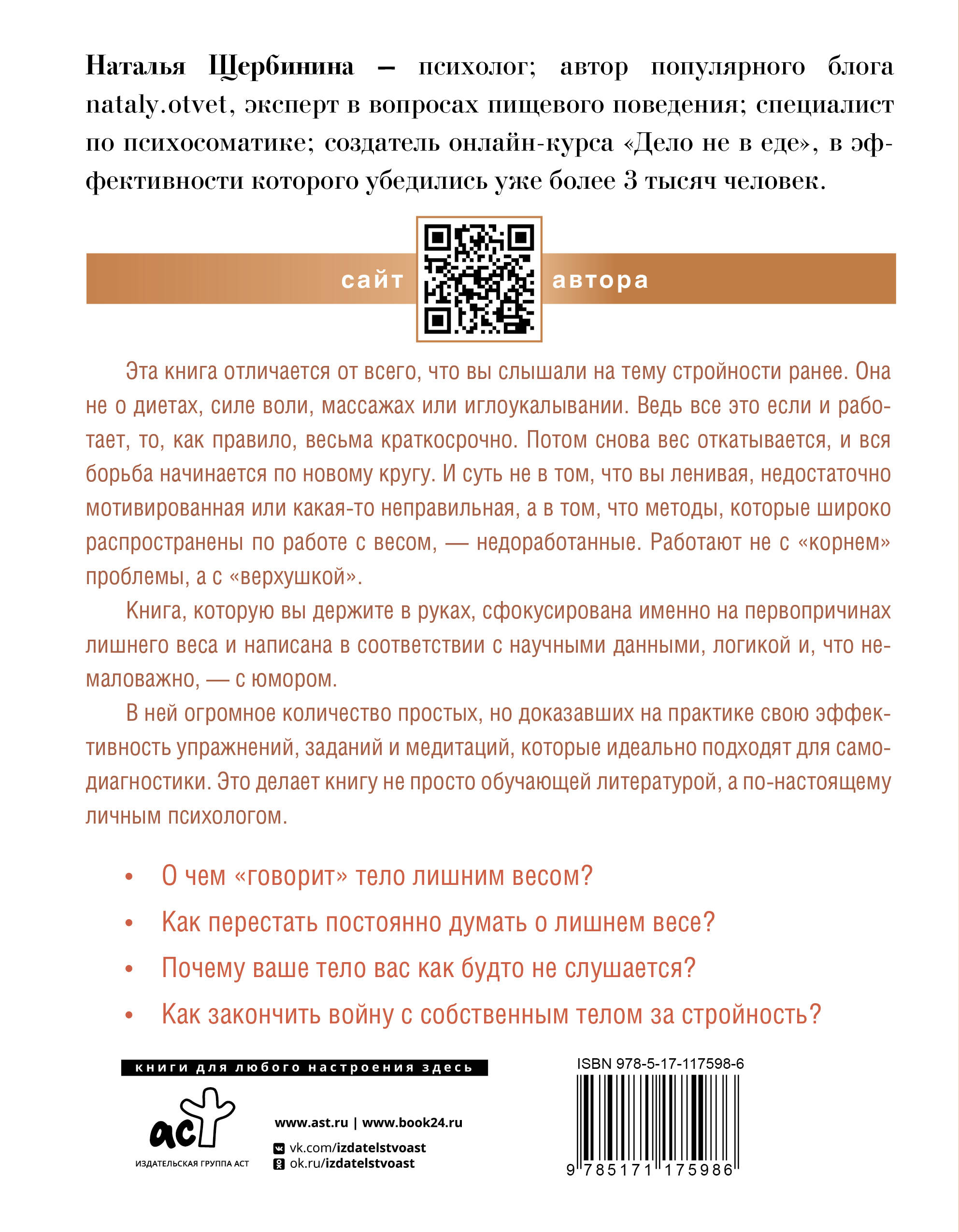 Наталья Щербинина - психолог, автор популярного блога @nataly.otvet (225 000 подписчиков), эксперт в вопросах пищевого поведения. Специалист по психосоматике, создатель онлайн-курса «Дело не в еде», в эффективности которого убедились уже более 3 тысяч человек. dnve.natalyotvet.ru| Издательство | ИЗДАТЕЛЬСТВО "АСТ" |