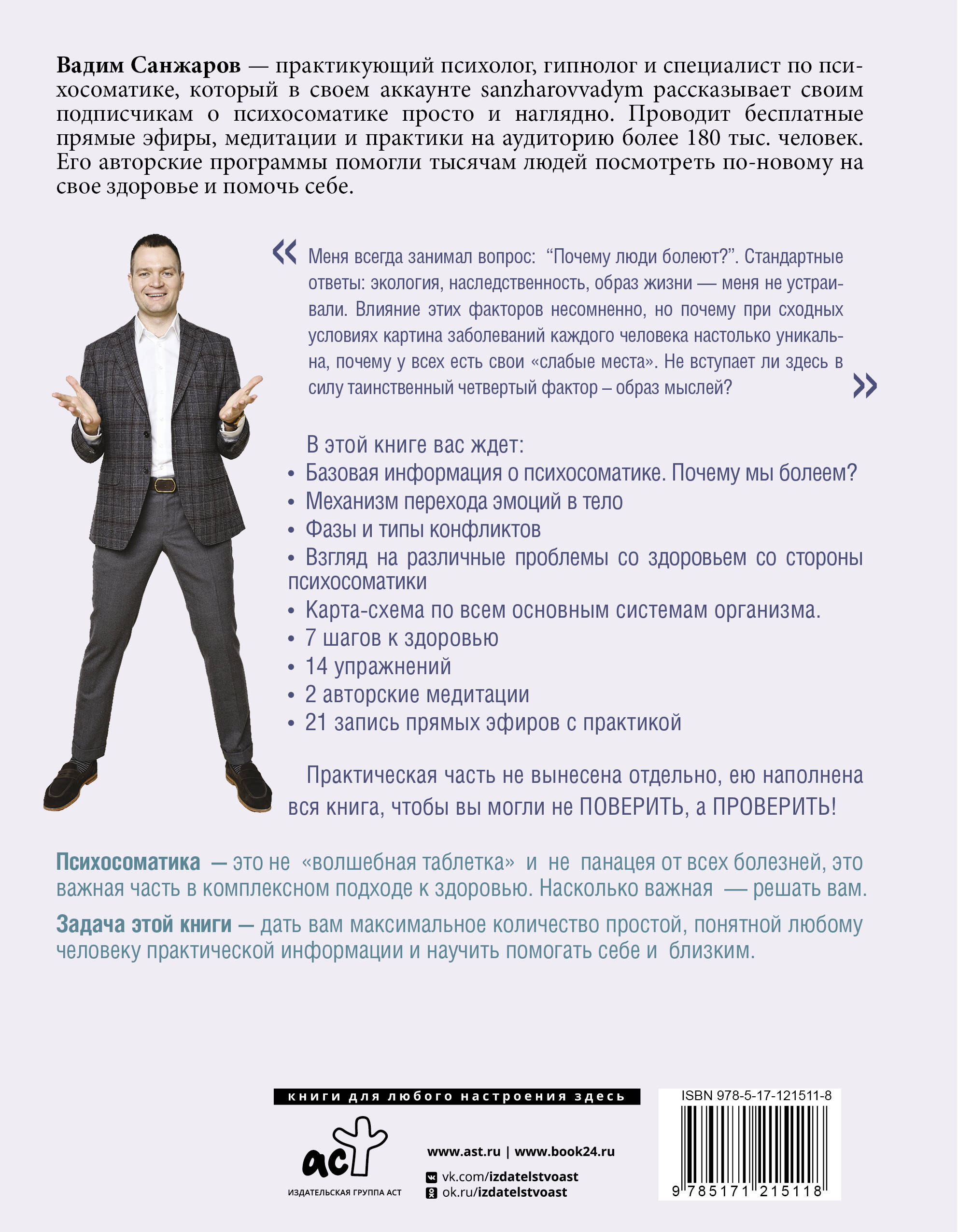 Авторские программы Вадима Санжарова помогли тысячам людей посмотреть по-новому на свое здоровье и помочь себе; В книге вы узнаете о причинах болезней со стороны психосоматики; С помощью универсальных упражнений научитесь искать корень проблем и работать с симптомами; Сможете проработать вторичные выгоды, внушения о здоровье, аллергии, послеоперационные рубцы и т.д.; Научитесь "быть в моменте" и отпустите ситуации из прошлого.| Издательство | ИЗДАТЕЛЬСТВО "АСТ" |