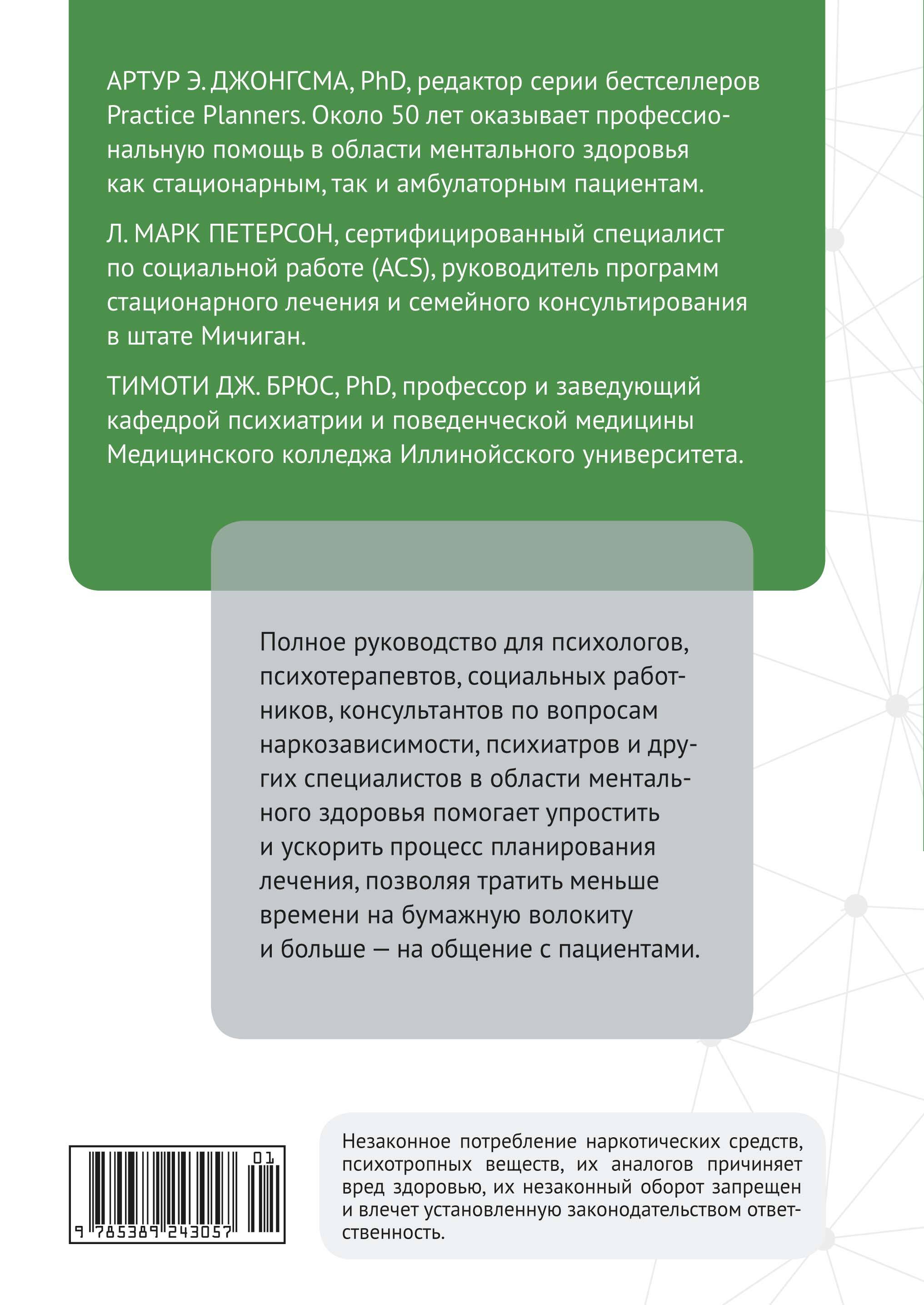 АРТУР Э. ДЖОНГСМА, PhD, редактор серии бестселлеров Practice Planners. Оказывает профессиональную помощь в области ментального здоровья как стационарным, так и амбулаторным пациентам около 50 лет. Л. МАРК ПЕТЕРСОН, сертифицированный специалист по социальной работе (ACS), руководитель программ стационарного лечения и семейного консультирования в штате Мичиган. ТИМОТИ ДЖ. БРЮС, PhD, профессор и заведующий кафедрой психиатрии и поведенческой медицины Медицинского колледжа Иллинойсского университета. Книга выдержала шесть изданий Базовый планер психотерапевтов всего мира