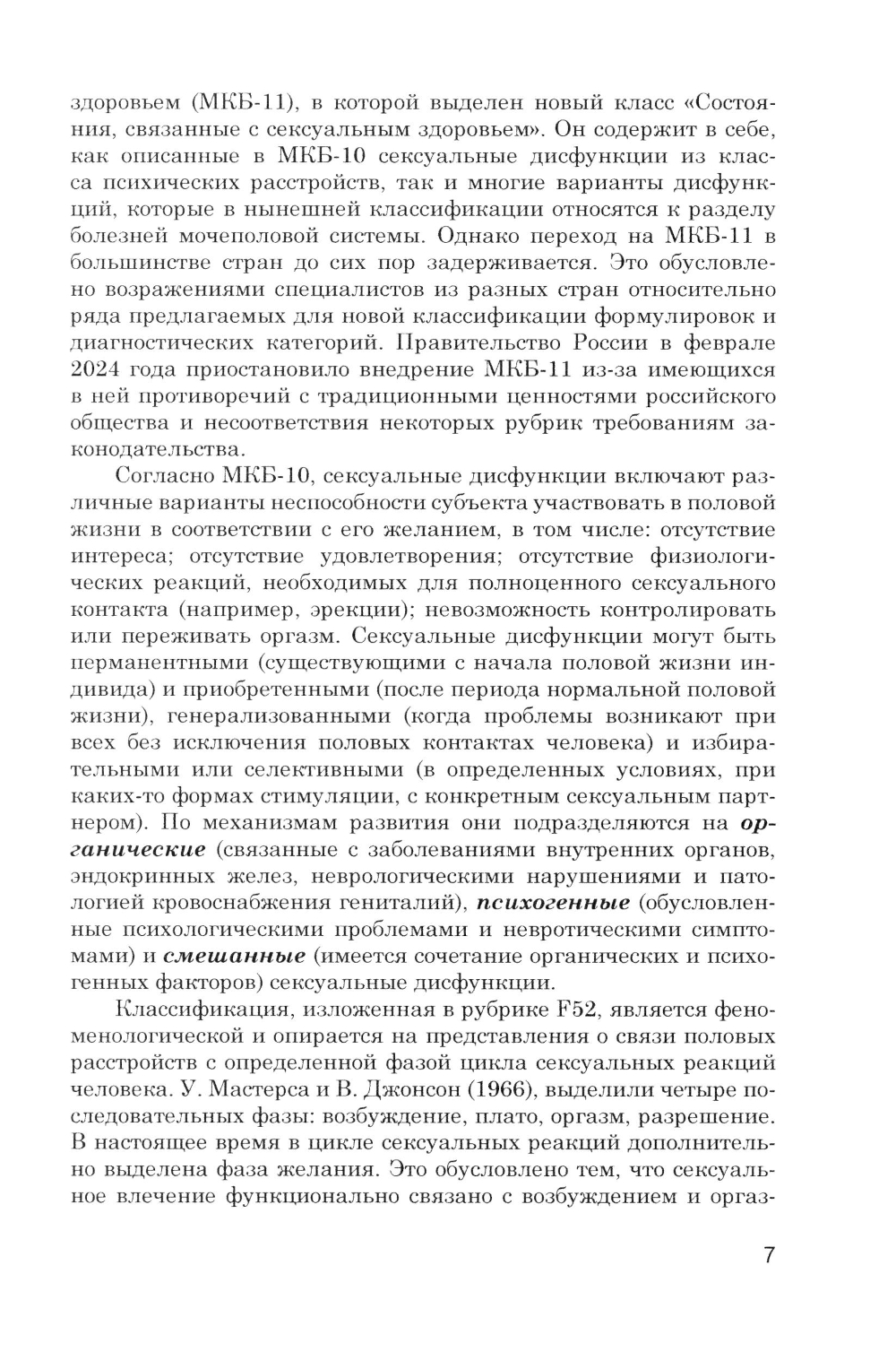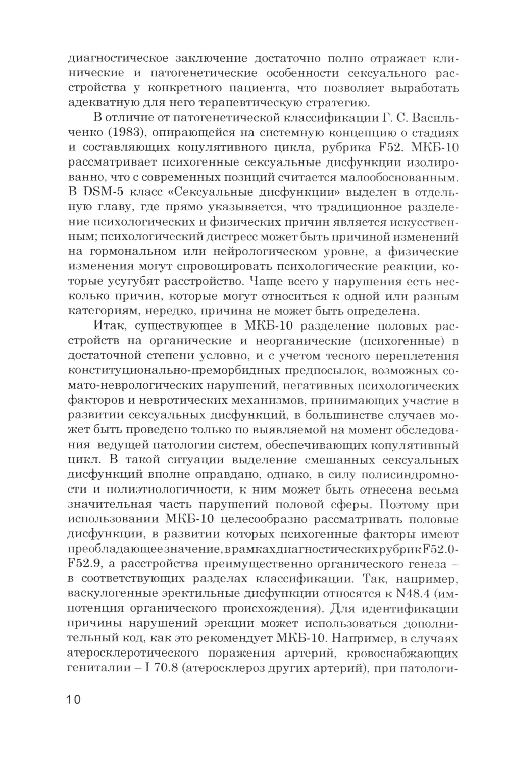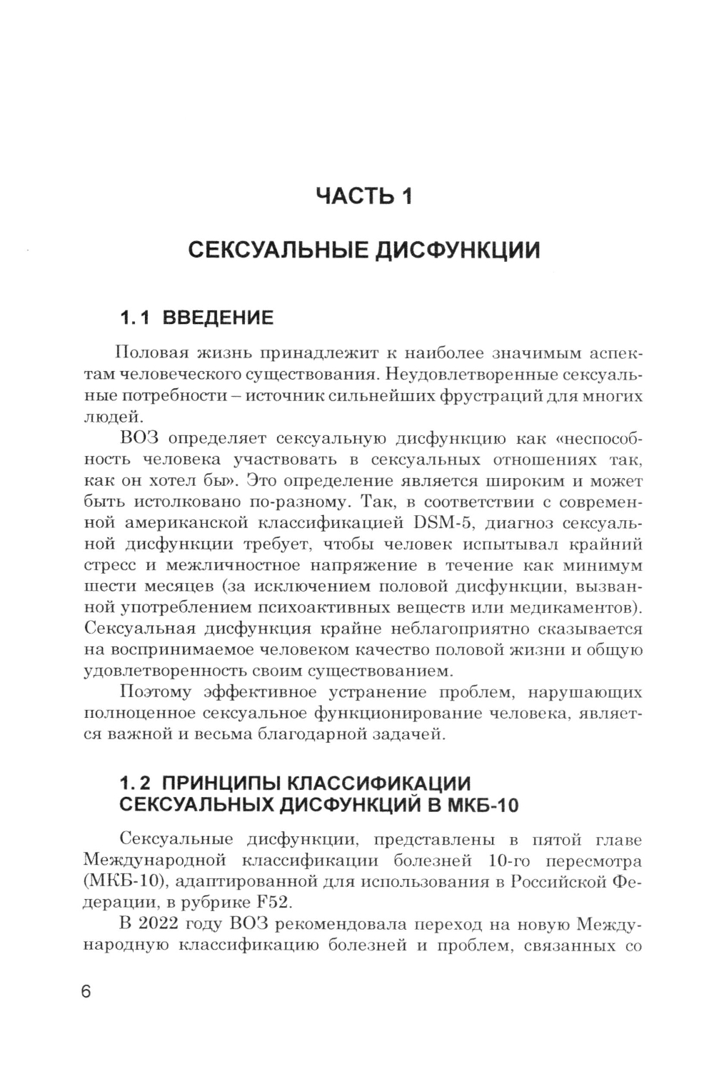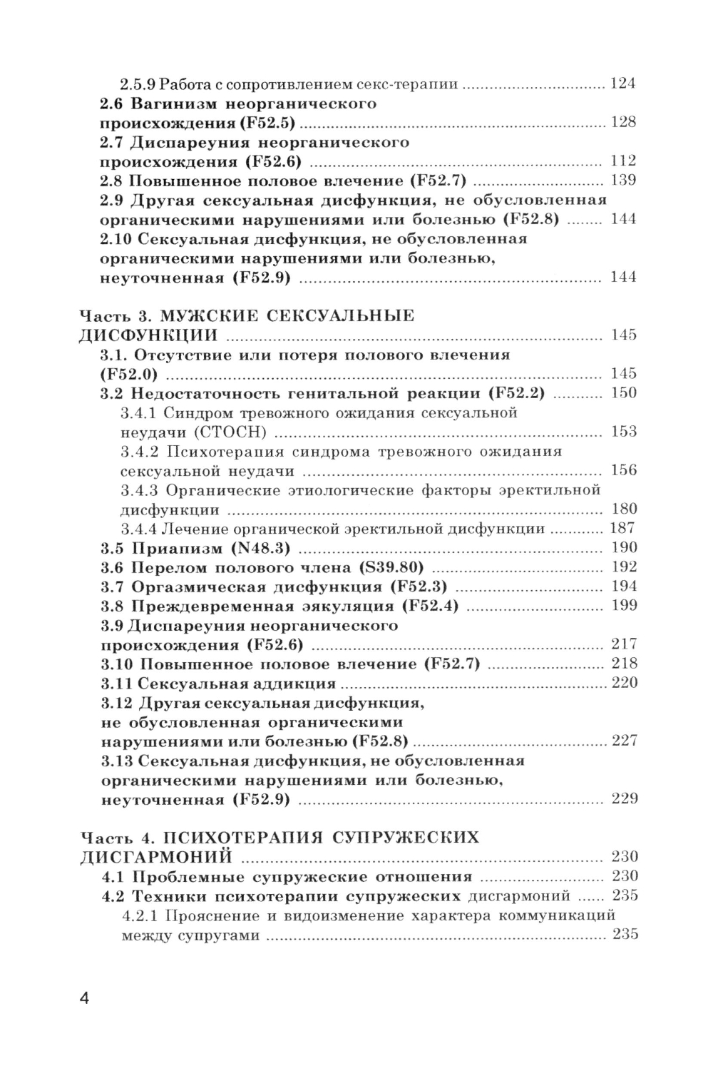 Данная книга задумана, как практическое руководство по диагностике и лечению сексуальных дисфункций у лиц обоего пола, а также коррекции супружеских дисгармоний. Все нарушения половых функций рассмотрены исходя из действующей в настоящее время в Российской Федерации Международной классификации болезней 10-го пересмотра (МКБ-10). Освещены вопросы этиопатогенеза, клиники, диагностики и лечение с акцентом на психотерапии. Для полноты раскрытия материала, автор не ограничился рамками рубрики F52 и включил ряд других расстройств половой сферы, в том числе, некоторые сексуальные дисфункции, обусловленные органическими нарушениями или болезнями и методы их лечения. Книга предназначена, в первую очередь для сексологов, психотерапевтов, психиатров, клинических психологов, психологов-сексологов, но может быть полезной и другим специалистам. Она ориентирована на читателей, знакомых с основами сексологии и сосредоточена на последовательном изложении мужских и женских сексуальных дисфункций, с которыми сталкиваются специалисты при консультировании лиц, обращающихся за сексологической помощью. Уделено внимание проблемным супружеским отношениям и их психотерапевтической коррекции.| Издательство | Психотерапия |