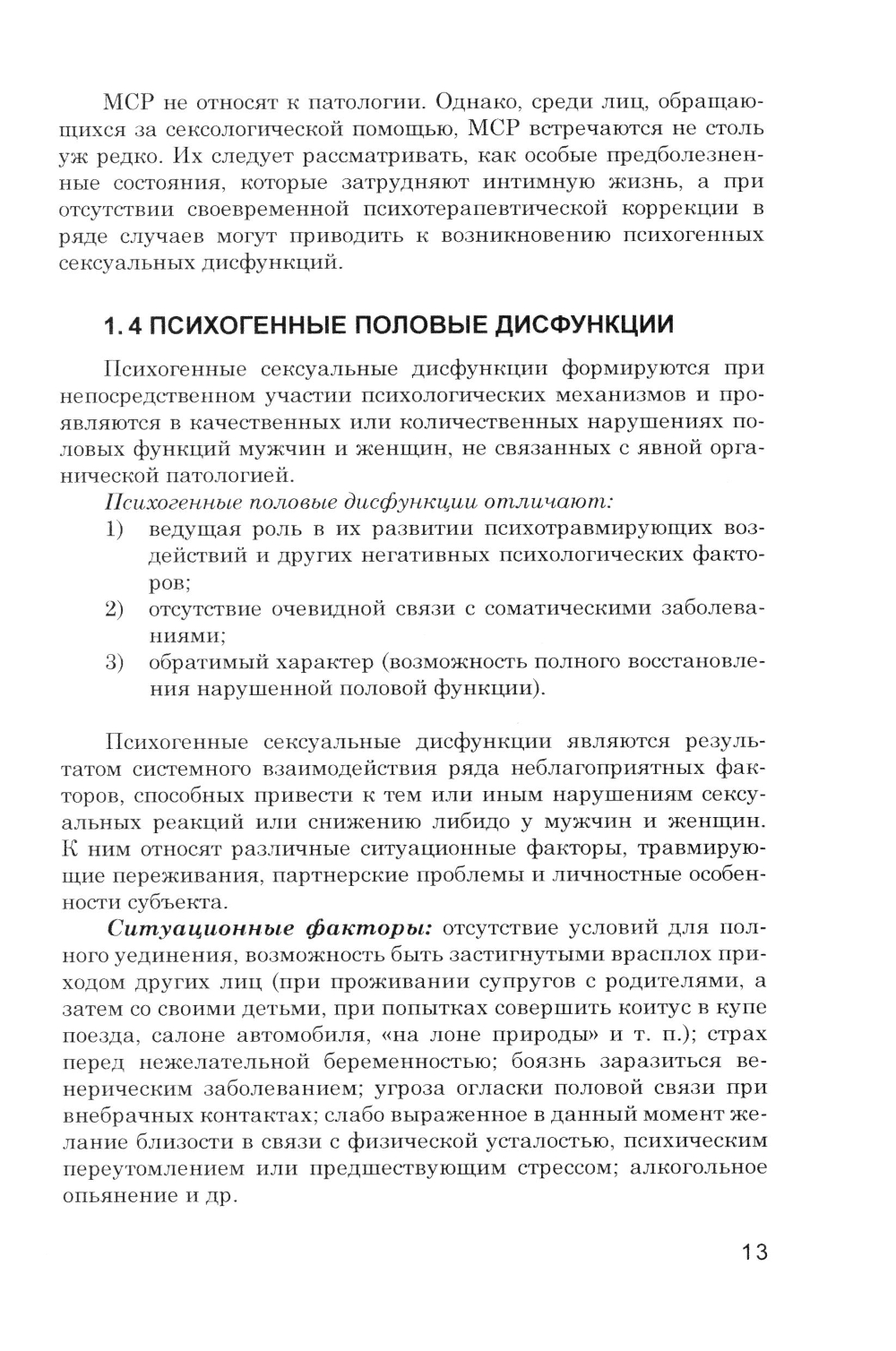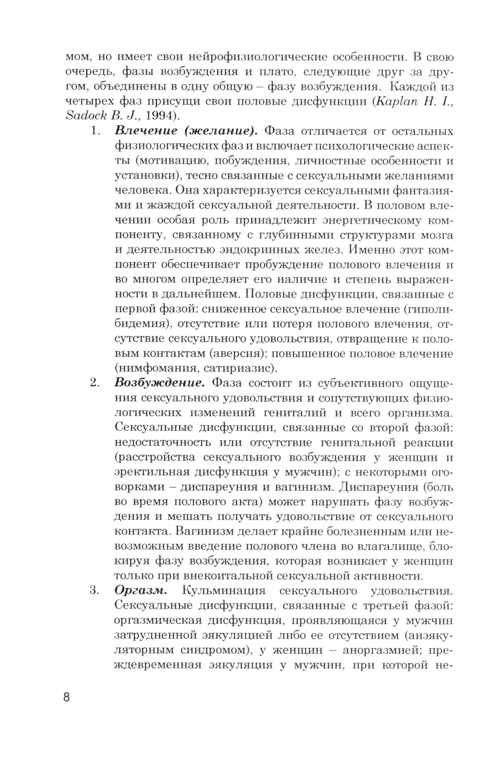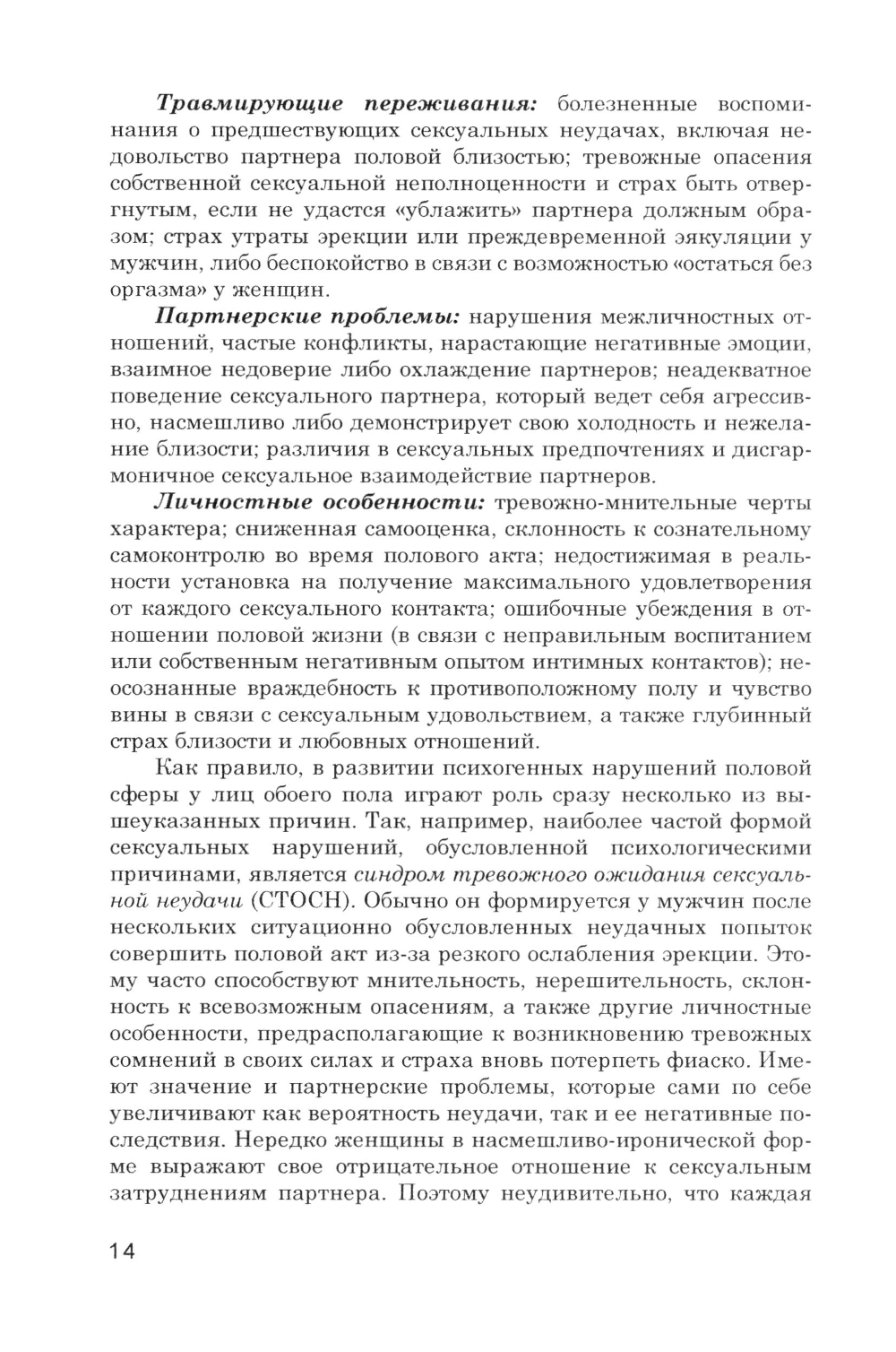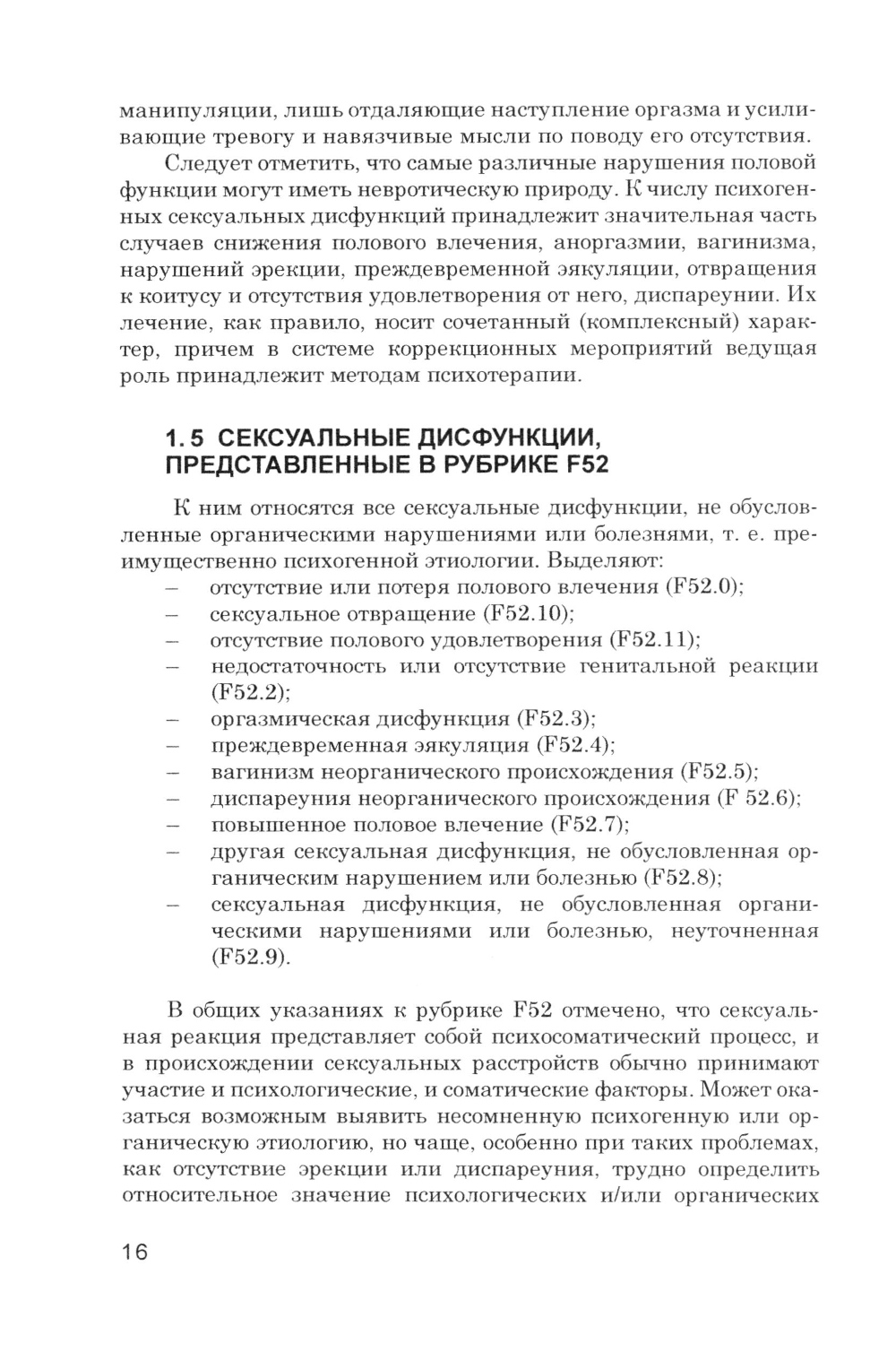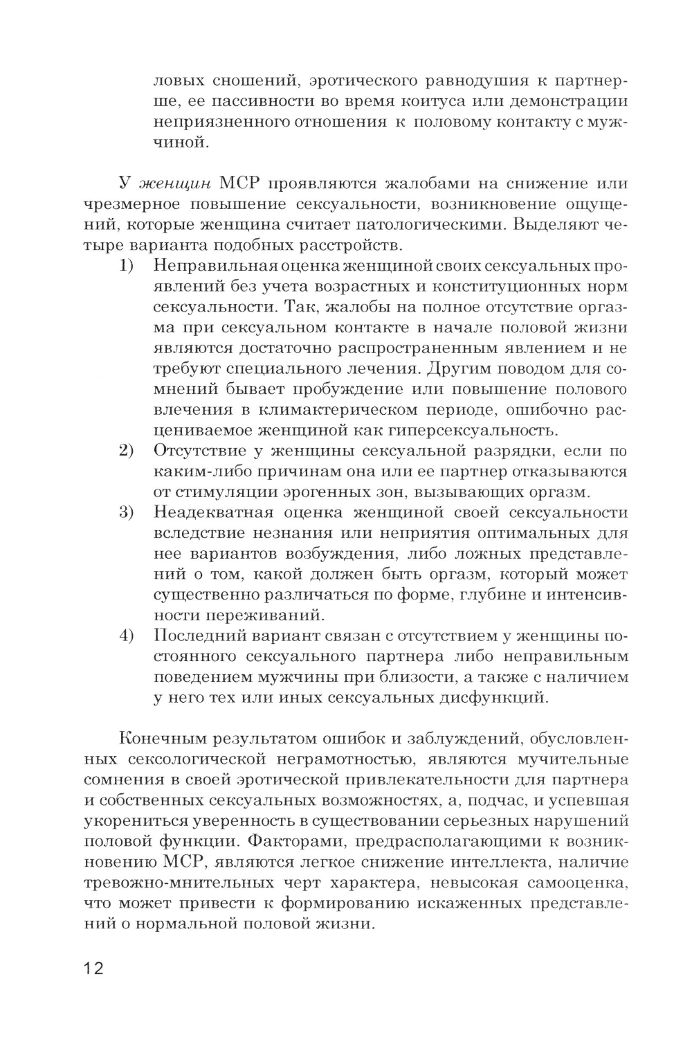 Данная книга задумана, как практическое руководство по диагностике и лечению сексуальных дисфункций у лиц обоего пола, а также коррекции супружеских дисгармоний. Все нарушения половых функций рассмотрены исходя из действующей в настоящее время в Российской Федерации Международной классификации болезней 10-го пересмотра (МКБ-10). Освещены вопросы этиопатогенеза, клиники, диагностики и лечение с акцентом на психотерапии. Для полноты раскрытия материала, автор не ограничился рамками рубрики F52 и включил ряд других расстройств половой сферы, в том числе, некоторые сексуальные дисфункции, обусловленные органическими нарушениями или болезнями и методы их лечения. Книга предназначена, в первую очередь для сексологов, психотерапевтов, психиатров, клинических психологов, психологов-сексологов, но может быть полезной и другим специалистам. Она ориентирована на читателей, знакомых с основами сексологии и сосредоточена на последовательном изложении мужских и женских сексуальных дисфункций, с которыми сталкиваются специалисты при консультировании лиц, обращающихся за сексологической помощью. Уделено внимание проблемным супружеским отношениям и их психотерапевтической коррекции.| Издательство | Психотерапия |