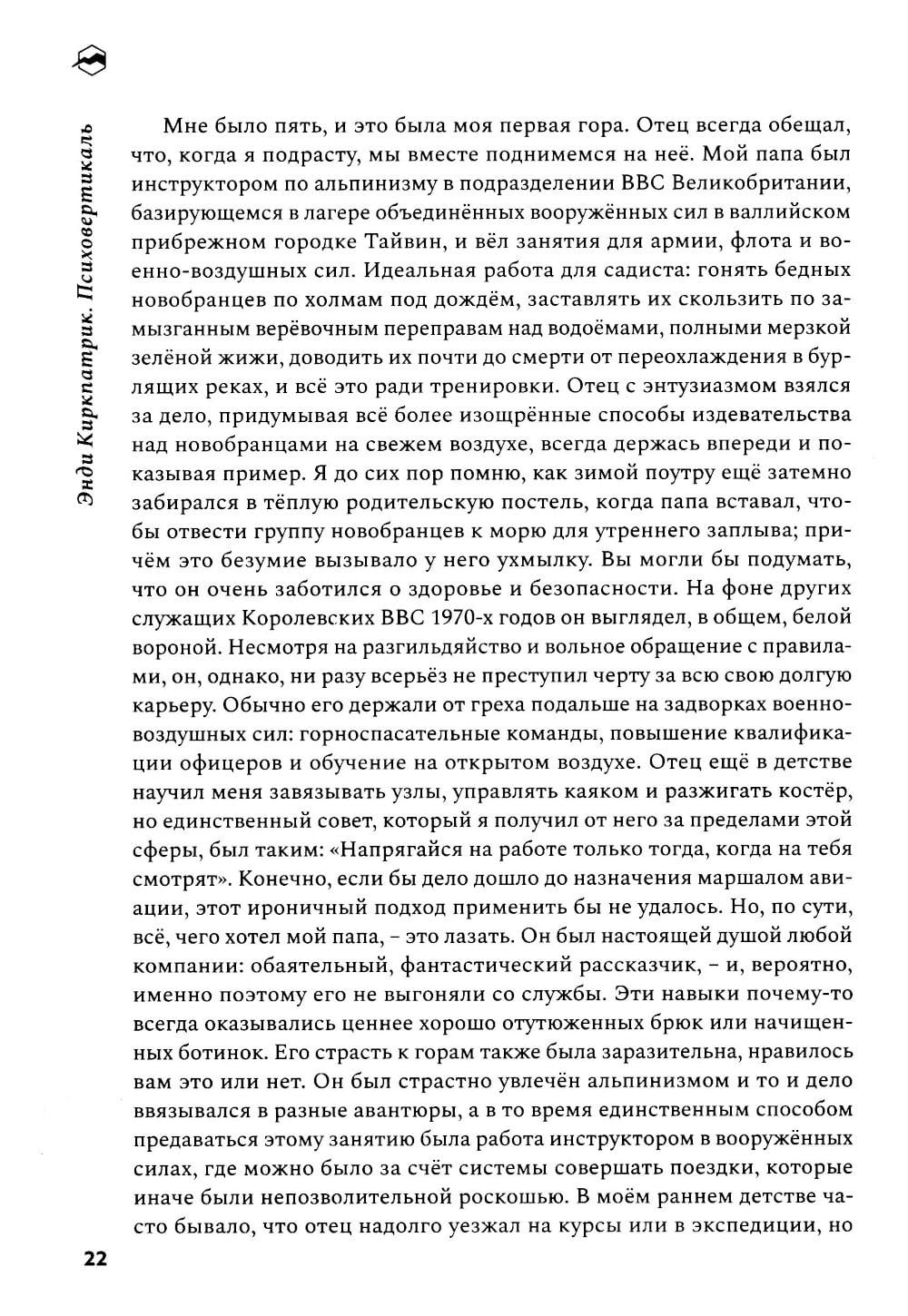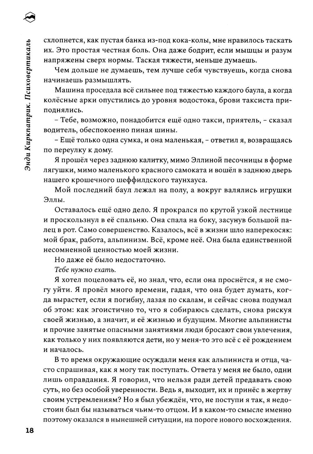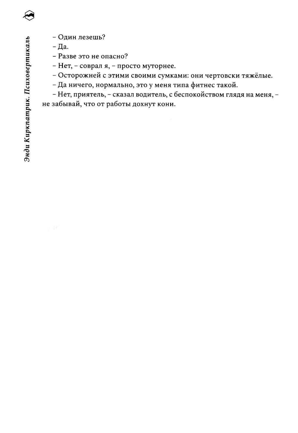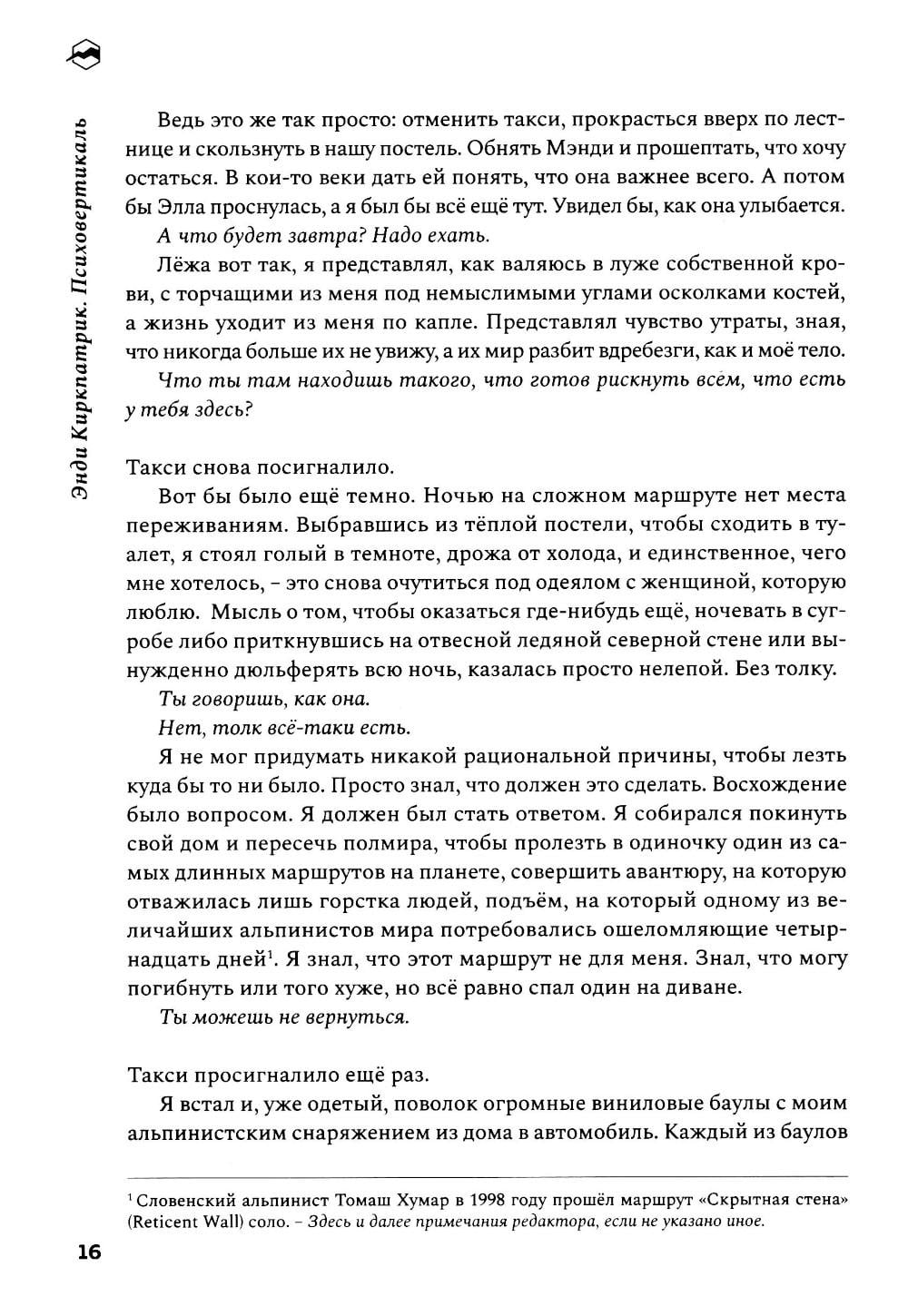 «Психовертикаль» - это история о страдающем дислексией мальчугане из низов, обретающем контроль над обстоятельствами и выбравшем для этой цели весьма опасное занятие. Энди Киркпатрик использует свое 12-дневное одиночное восхождение на Эль-Капитан в качестве опыта, который помогает ему понять, как детство в нужде, борьба с дислексией и нехватка уверенности в себе вывели его на путь экстремальных приключений. Киркпатрик пишет захватывающе и очень увлекательно. Не нужно быть альпинистом, чтобы полюбить его непринужденность, черный юмор и честный, самоуничижительный стиль повествования. Эта книга - лауреат премии Бордмана - Таскера, которую присуждают выдающимся произведениям о горах.| Издательство | Библиотека Спорт-Марафон |