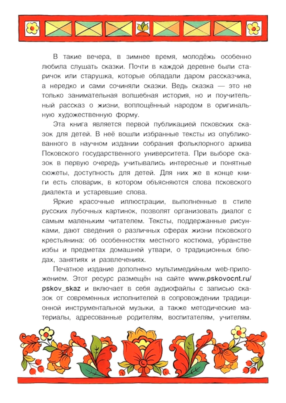 Псковская земля хранит множество старинных песен, легенд, преданий и, конечно, сказок. В этот сборник сказок вошли самые интересные и понятные детям. Сказочные герои - знаменитый Бычок - смоляной бочок, Медведь на липовой ноге, Лутонька, ленивая и работящая сестры широко известны. Для самых маленьких читателей в конце книги есть словарик, в котором объясняются устаревшие и диалектные слова. Красочные иллюстрации расскажут о местных народных костюмах, убранстве избы и предметах домашней утвари, а также о традиционных блюдах, занятиях и развлечениях.| Издательство | BHV(БХВ) |