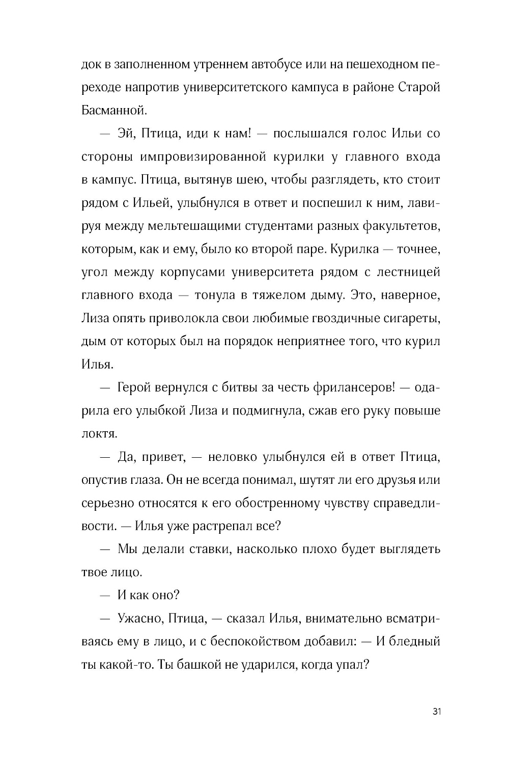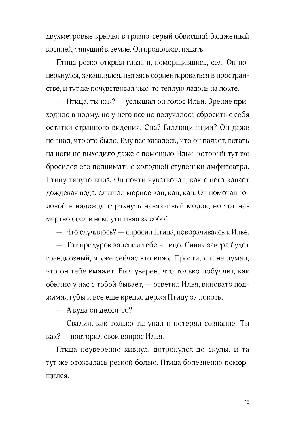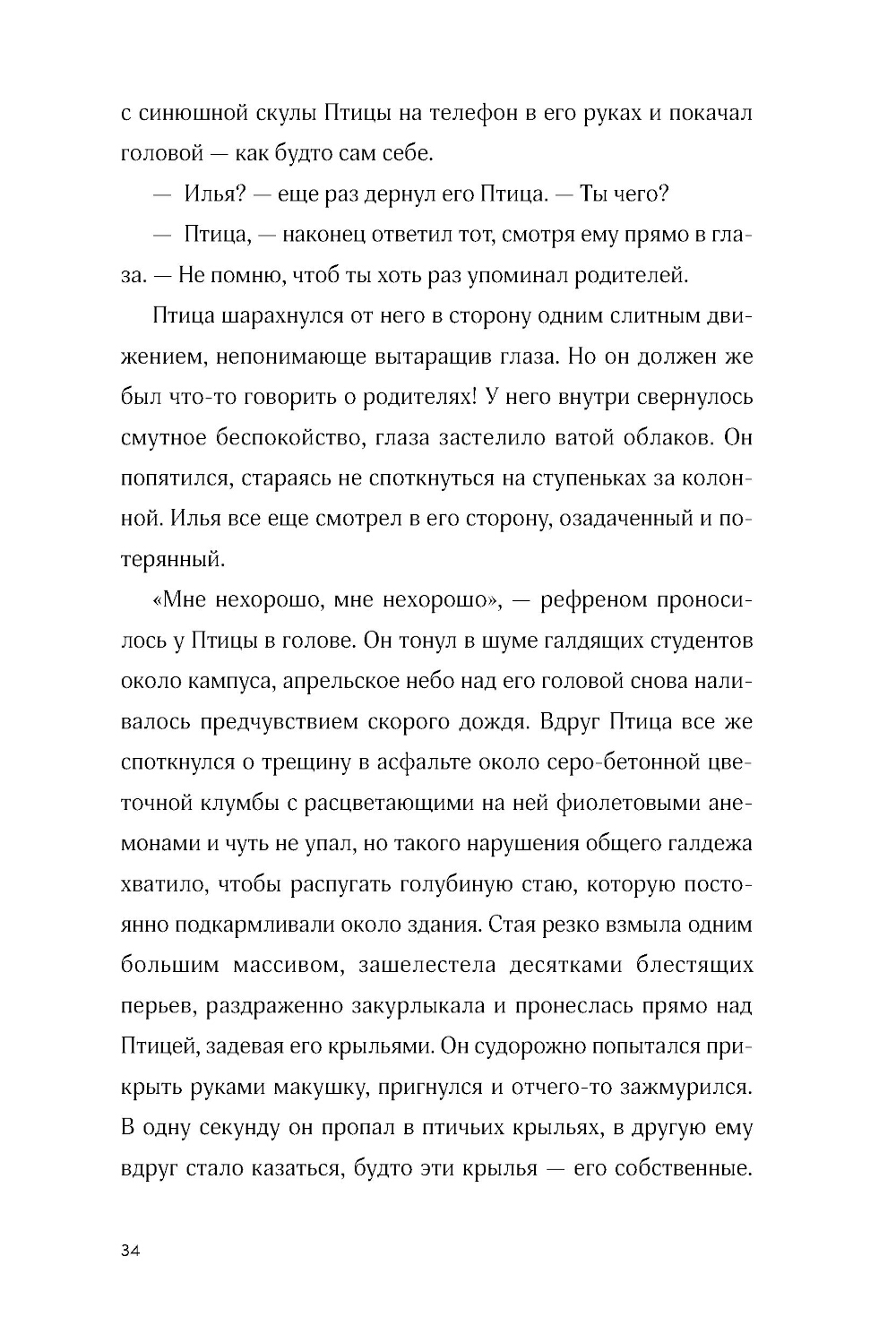Птица - студент философского факультета и ценитель йогуртов из «Пятерочки», живет в съемной квартирке и тусуется с друзьями после пар. Но однажды во время прогулки он ввязывается в драку, и с ним начинает твориться что-то странное. Загадочные сны, зуд между лопаток, тщетные попытки понять, кто он и откуда. Наконец буквы в паспорте рассыпаются в пыль у него на глазах и Птица вспоминает, что на самом деле он... ангел. Небо даровало ему завесу, которая скрывала его крылья и происхождение. А теперь, когда она почти исчезла, перед Птицей встает выбор: вернуться на небо или остаться с друзьями, которых он обрел за годы жизни на земле.| Издательство | Marshmallow Books |