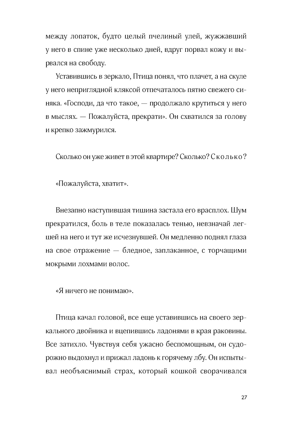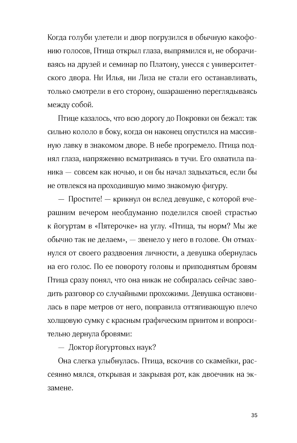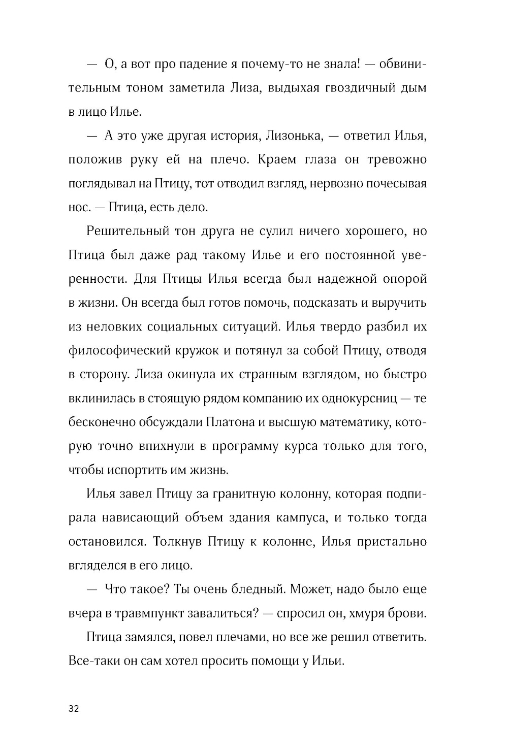 Птица - студент философского факультета и ценитель йогуртов из «Пятерочки», живет в съемной квартирке и тусуется с друзьями после пар. Но однажды во время прогулки он ввязывается в драку, и с ним начинает твориться что-то странное. Загадочные сны, зуд между лопаток, тщетные попытки понять, кто он и откуда. Наконец буквы в паспорте рассыпаются в пыль у него на глазах и Птица вспоминает, что на самом деле он... ангел. Небо даровало ему завесу, которая скрывала его крылья и происхождение. А теперь, когда она почти исчезла, перед Птицей встает выбор: вернуться на небо или остаться с друзьями, которых он обрел за годы жизни на земле.| Издательство | Marshmallow Books |