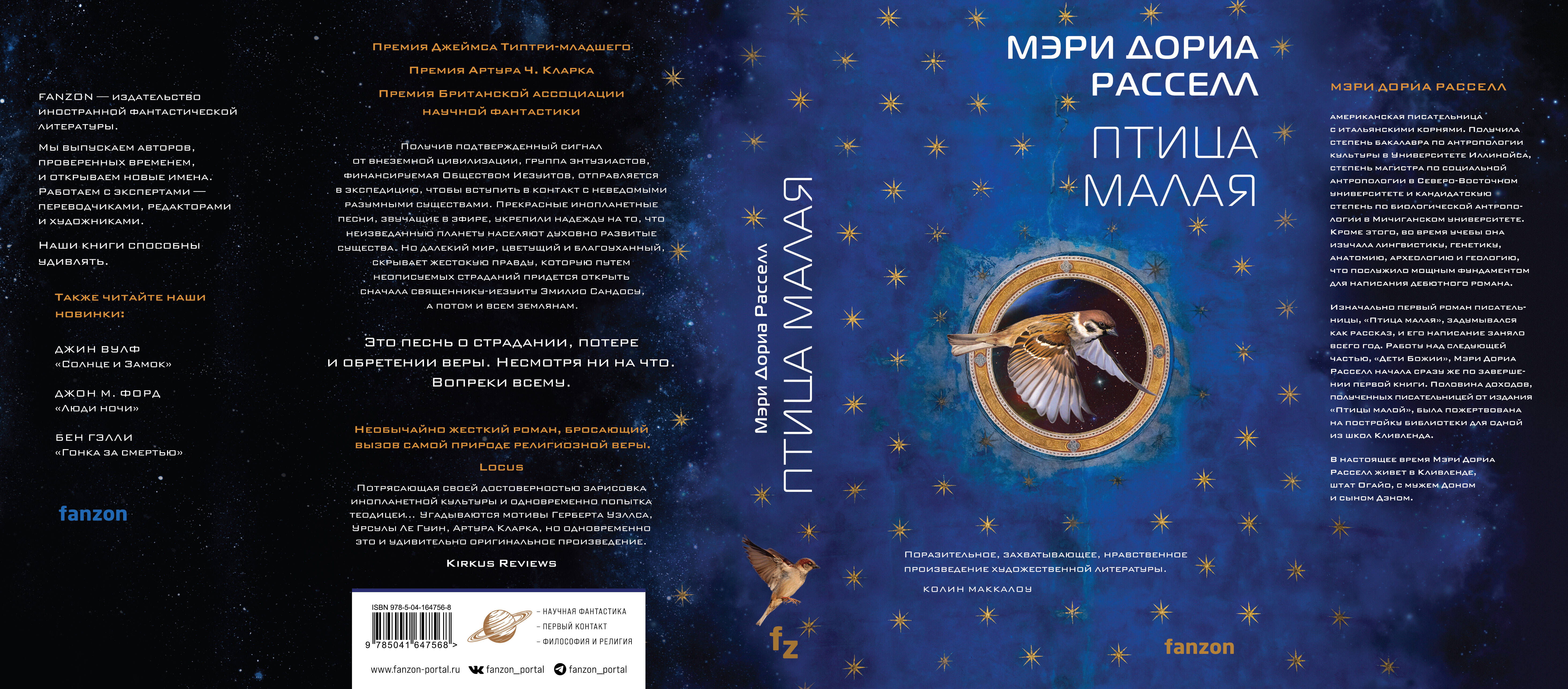 Готово ли человечество к встрече с обитателями иных миров? И что ждет нас там, в космической пустоте? Лингвист Эмилио Сандос стремился найти ответы на эти вопросы. Вместе с экипажем из самых разных специалистов он отправился к далекой планете Ракхат. Именно оттуда человечество получило загадочный сигнал - чарующую песнь. И люди полетели навстречу этой песне, словно мотыльки на свет пламени. Как же глупы они были! Если бы Эмилио мог вернуться в прошлое, изменить свой выбор, предотвратить катастрофу… Кто знает, сколько жизней удалось бы спасти? Но его ждала иная судьба. Лингвист вернулся на Землю спустя полвека в одиночестве. Он сломлен и разбит. Его рассказ о том, что произошло на Ракхате, наполнен страхом и болью. Хватит ли вам смелости дослушать до конца? «Миссия, по его мнению, пошла не так, как надо, благодаря целой последовательности логичных, разумных, тщательно продуманных решений, казавшихся великолепными в то время. Как бывает при самых колоссальных катастрофах». «Птица малая» - захватывающий и необычайно глубокий научно-фантастический роман в лучших традициях жанра и лауреат престижных премий. В разработке сериал по мотивам книги от создателей хитов «Во все тяжкие» и «Ход королевы». «Поразительное, захватывающее, нравственное произведение художественной литературы». - Колин Маккалоу («Поющие в терновнике», «Горькая радость»)| Издательство | ООО "Издательство "Эксмо" |