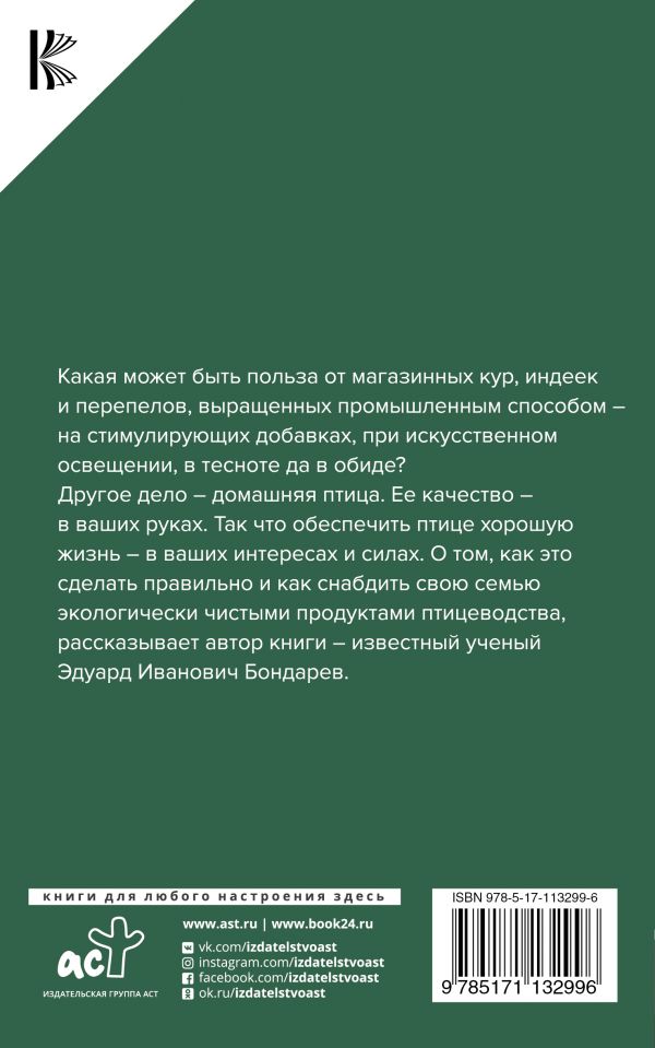 Другое дело - домашняя птица. Ее качество - в ваших руках. Так что обеспечить птице хорошую жизнь - в ваших интересах и силах. О том, как это сделать правильно и как снабдить свою семью экологически чистыми продуктами птицеводства, рассказывает автор книги - известный ученый Эдуард Иванович Бондарев.
