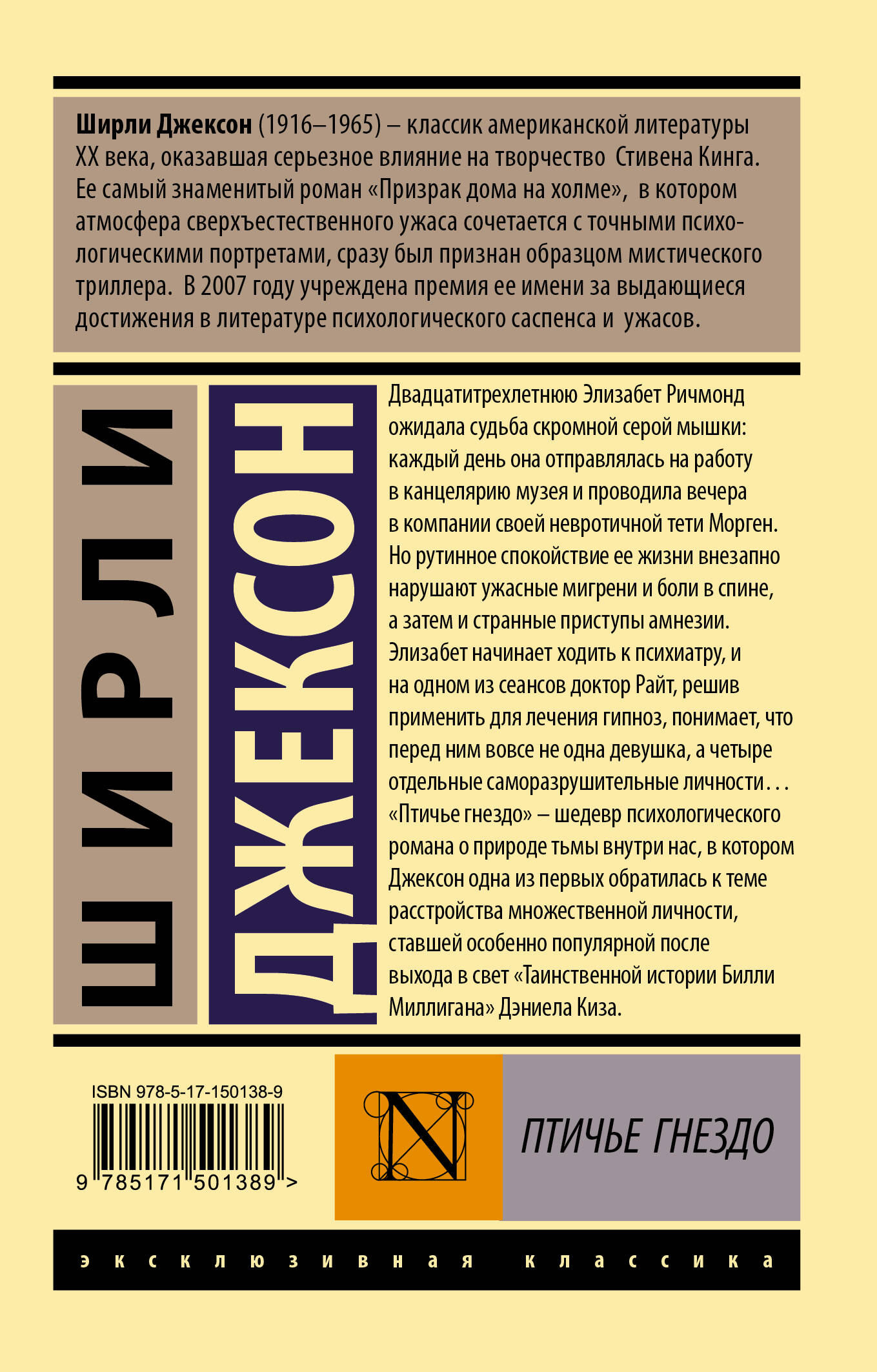 Двадцатитрехлетнюю Элизабет Ричмонд ожидала судьба скромной серой мышки: каждый день она отправлялась на работу в канцелярию музея и проводила вечера в компании своей невротичной тети Морген. Но рутинное спокойствие ее жизни внезапно нарушают ужасные мигрени и боли в спине, а затем и странные приступы амнезии. Элизабет начинает ходить к психиатру, и на одном из сеансов доктор Райт, решив применить для лечения гипноз, понимает, что перед ним вовсе не одна девушка, а четыре отдельные саморазрушительные личности… "Птичье гнездо" - шедевр психологического романа о природе тьмы внутри нас, в котором Джексон одна из первых обратилась к теме расстройства множественной личности, ставшей особенно популярной после выхода в свет "Таинственной истории Билли Миллигана" Дэниела Киза.| Издательство | ИЗДАТЕЛЬСТВО "АСТ" |