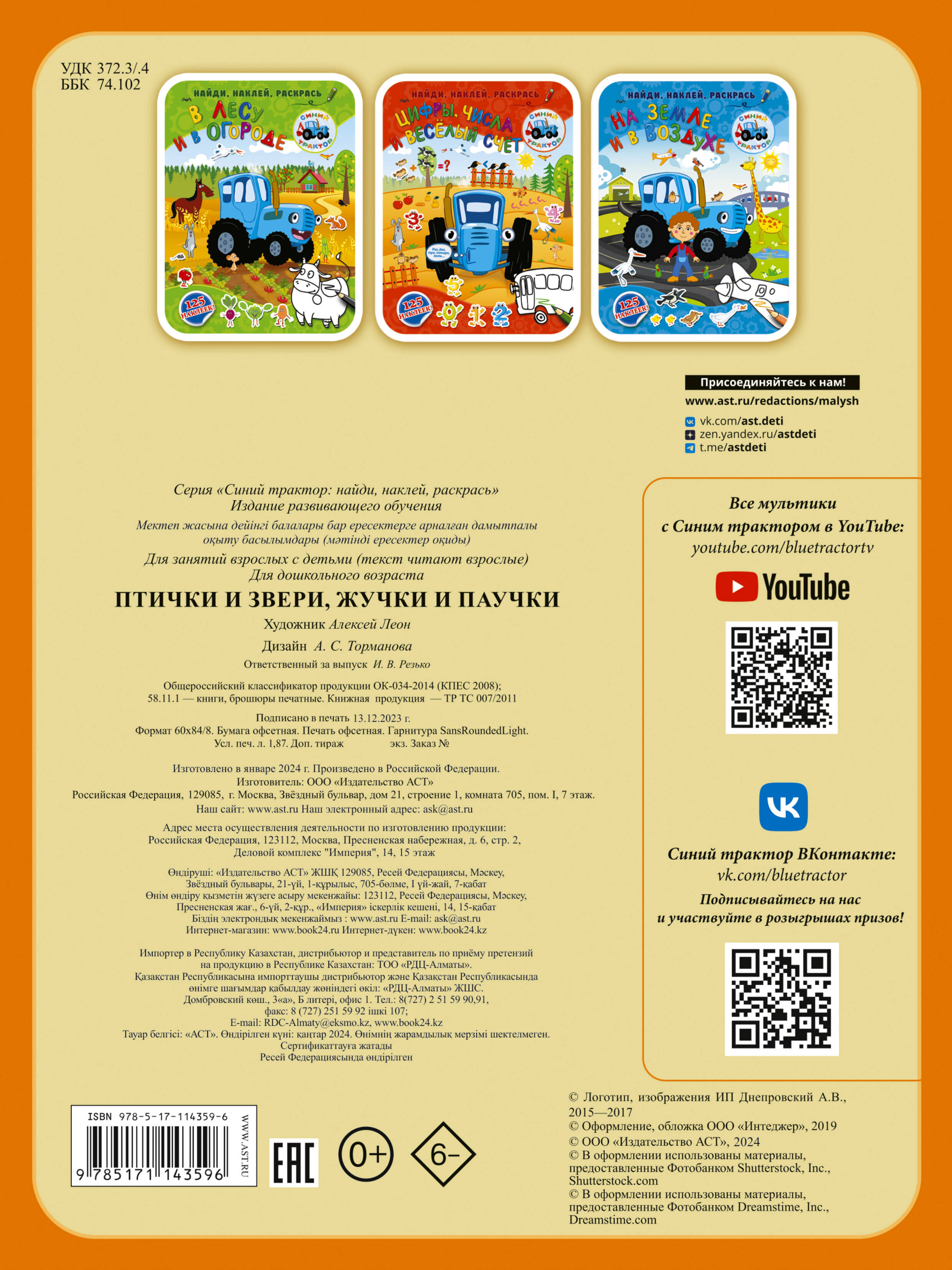 Синий трактор - известный персонаж развивающего мультпроекта, собравшего миллионы просмотров и подписчиков в сети Интернет. На страницах книги "Птички и звери, жучки и паучки" малыши встретят героев полюбившихся мультфильмов, поиграют с наклейками, выполнят увлекательные задания. А ещё здесь есть раскраски, которые нравятся абсолютно всем детям. Для дошкольного возраста.| Издательство | Издательство "АСТ" |