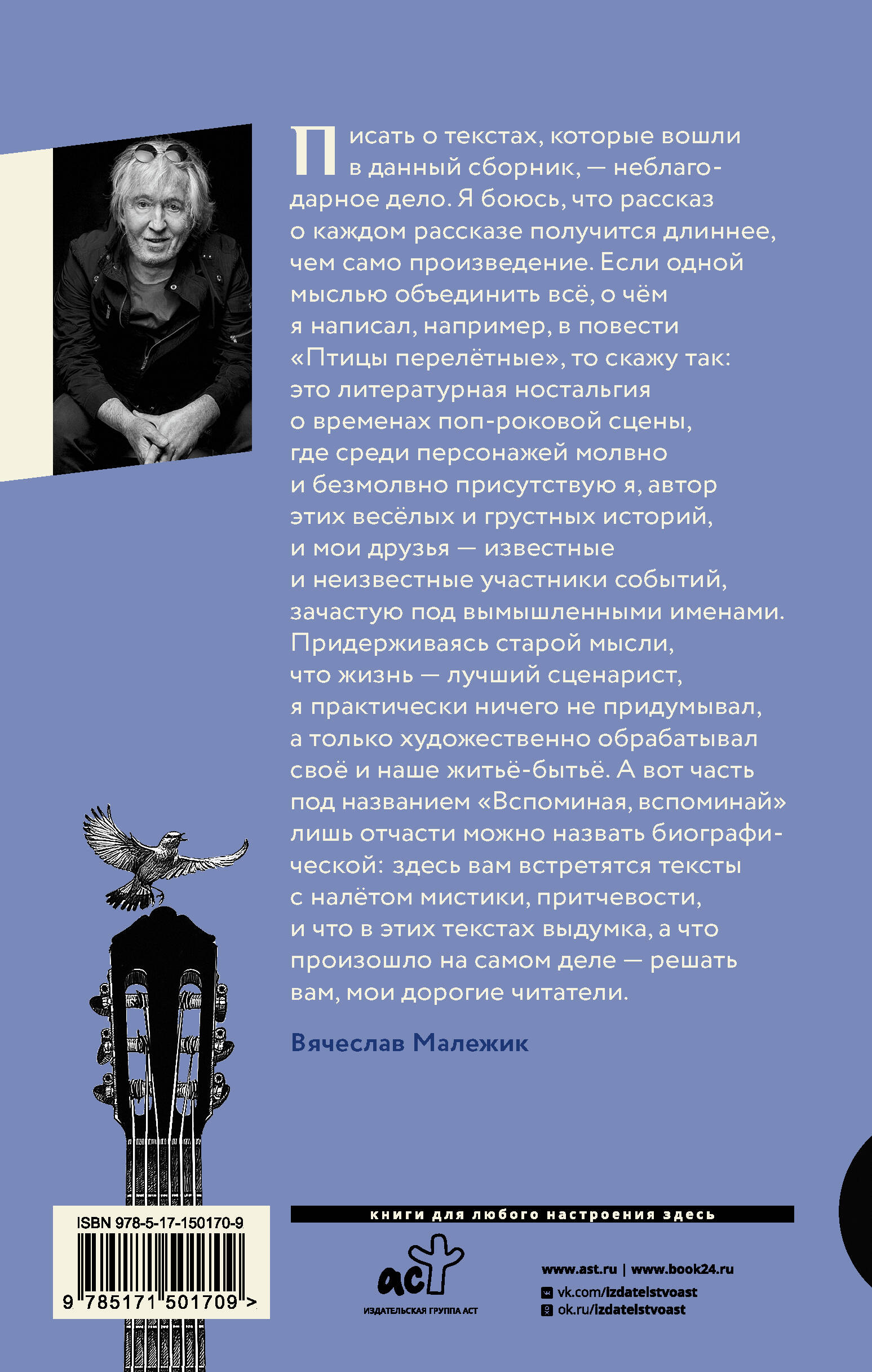 Сборник художественной прозы Вячеслава Малежика содержит живые и занимательные рассказы на самые разные темы и в самых разных жанрах, а также повесть "Птицы перелётные" - историю о московских подростках, которые в середине 60-х годов открывают для себя рок-н-ролл и учатся играть эту непривычную для советского человека музыку. Среди персонажей без труда угадываются известные люди, знакомые читателям буквально с детства. Часть, озаглавленная "Альбом", включает в себя интересные факты о создании одноимённой пластинки Вячеслава Малежика. Каждой песне посвящена отдельная глава, и каждая глава - это полноценный рассказ: иногда смешной, иногда лирический, иногда поучительный, но неизменно увлекательный. Размещённые в главах QR-коды и ссылки позволяют прослушивать онлайн песни, о которых идёт речь. Завершает книгу подборка стихов, написанных Вячеславом Малежиком с 2016 по 2022 год и публикуемых впервые.| Издательство | ИЗДАТЕЛЬСТВО "АСТ" |