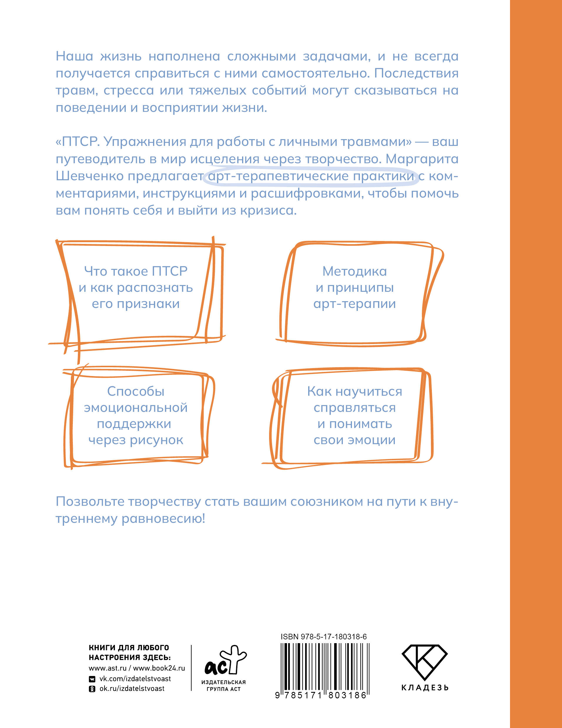 Наша жизнь наполнена сложными задачами, и не всегда получается справиться с ними самостоятельно. Последствия травм, стресса или тяжелых событий могут сказываться на поведении и восприятии жизни. "ПТСР. Упражнения для работы с личными травмами" - ваш путеводитель в мир исцеления через творчество. Маргарита Шевченко предлагает арт-терапевтические практики с комментариями, инструкциями и расшифровками, чтобы помочь вам понять себя и выйти из кризиса. • Что такое ПТСР и как распознать его признаки • Способы эмоциональной поддержки через рисунок • Методика и принципы арт-терапии • Как научиться справляться и понимать свои эмоции Позвольте творчеству стать вашим союзником на пути к внутреннему равновесию!| Издательство | Издательство "АСТ" |