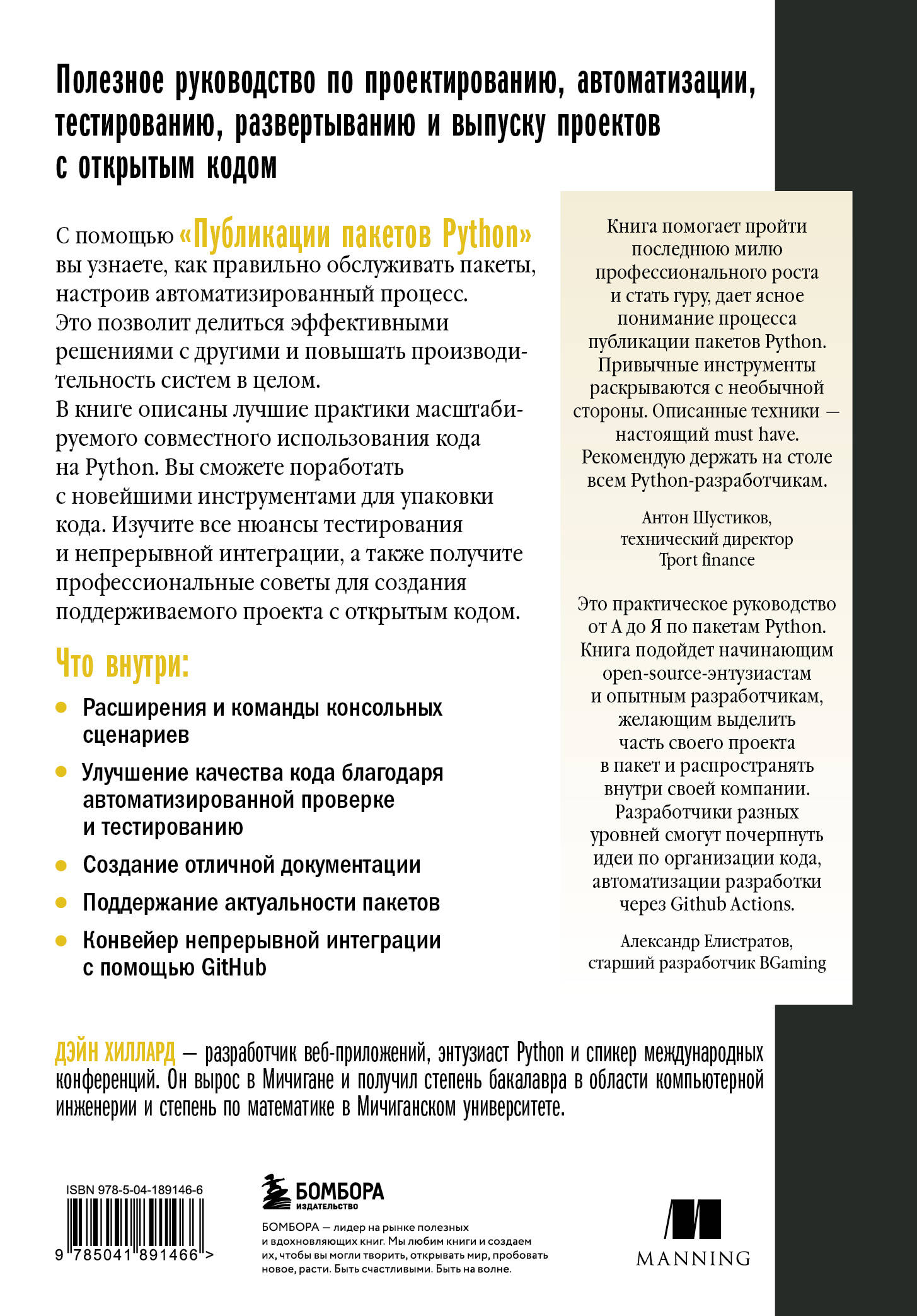 Полезное руководство по проектированию, автоматизации, тестированию, развертыванию и выпуску проектов с открытым кодом. С помощью «Публикации пакетов Python» вы узнаете, как правильно обслуживать пакеты, настроив автоматизированный процесс. Это позволит делиться эффективными решениями с другими и повышать производительность систем в целом. В книге описаны лучшие практики масштабируемого совместного использования кода на Python. Вы сможете поработать с новейшими инструментами для упаковки кода. Изучите все нюансы тестирования и непрерывной интеграции, а также получите профессиональные советы для создания поддерживаемого проекта с открытым кодом. Что внутри: • Расширения и команды консольных сценариев. • Улучшение качества кода благодаря автоматизированной проверке и тестированию. • Создание отличной документации. • Поддержание актуальности пакетов. • Конвейер непрерывной интеграции с помощью GitHub. Об авторе ДЭЙН ХИЛЛАРД - разработчик веб-приложений, энтузиаст Python и спикер международных конференций. Он вырос в Мичигане и получил степень бакалавра в области компьютерной инженерии и степень по математике в Мичиганском университете. «Книга помогает пройти последнюю милю профессионального роста и стать гуру, дает ясное понимание процесса публикации пакетов Python. Привычные инструменты раскрываются с необычной стороны. Описанные техники - настоящий must have. Рекомендую держать на столе всем python-разработчикам». - Антон Шустиков, технический директор Tport finance «Это практическое руководство от А до Я по пакетам Python. Книга подойдет начинающим open-source-энтузиастам и опытным разработчикам, желающим выделить часть своего проекта в пакет и распространять внутри своей компании. Разработчики разных уровней смогут почерпнуть идеи по организации кода, автоматизации разработки через Github Actions». - Александр Елистратов, старший разработчик BGaming| Издательство | ООО "Издательство "Эксмо" |