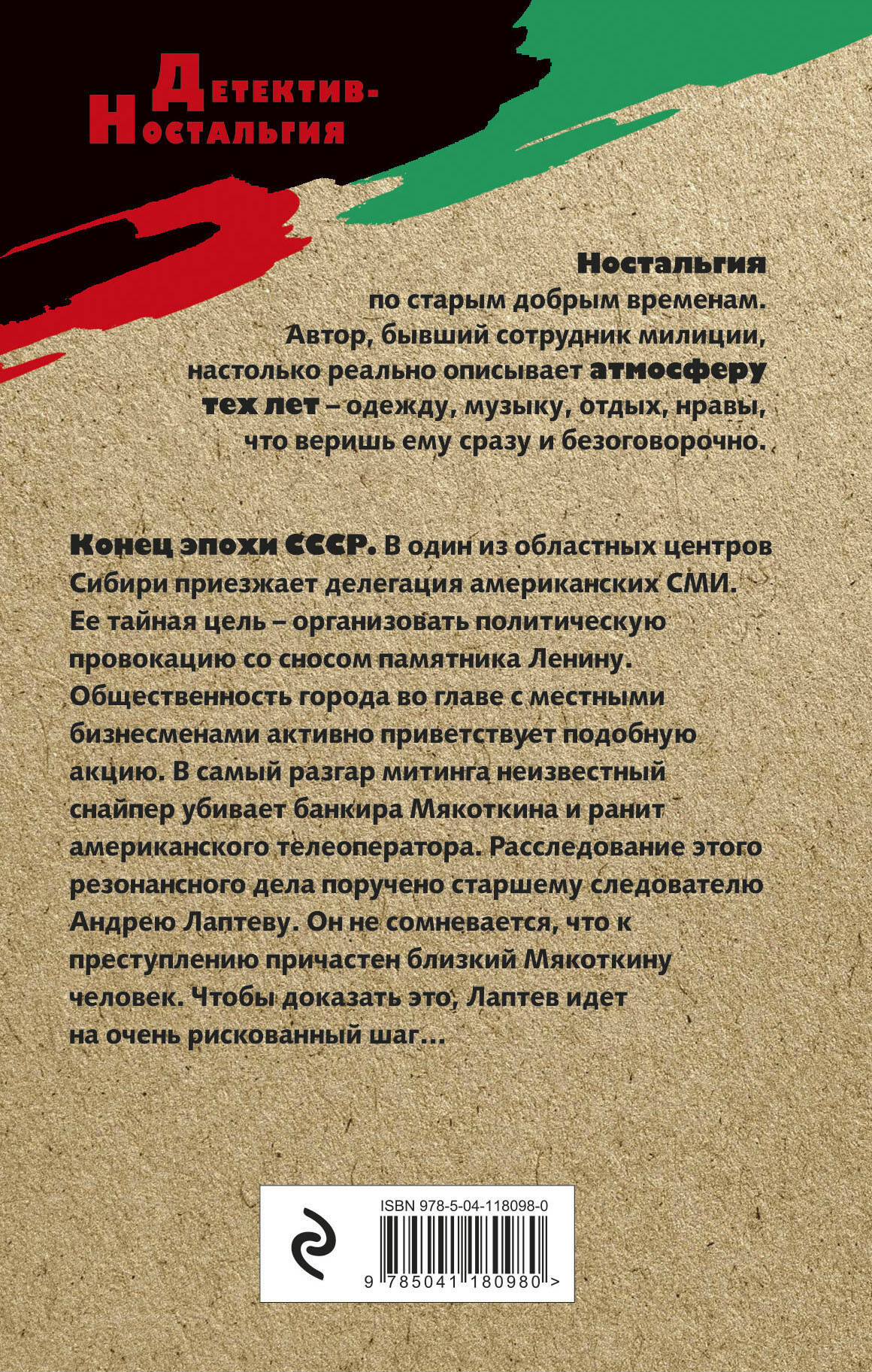 Конец эпохи СССР. В один из областных центров Сибири приезжает делегация американских СМИ. Ее тайная цель - организовать политическую провокацию со сносом памятника Ленину. Общественность города во главе с местными бизнесменами, активно приветствует подобную акцию. В самый разгар митинга неизвестный снайпер убивает банкира Мякоткина и ранит американского телеоператора. Расследование этого резонансного дела поручено старшему следователю Андрею Лаптеву. Он не сомневается, что к преступлению причастен близкий Мякотину человек. Чтобы доказать это, Лаптев идет на очень рискованный шаг…| Издательство | ООО "Издательство "Эксмо" |