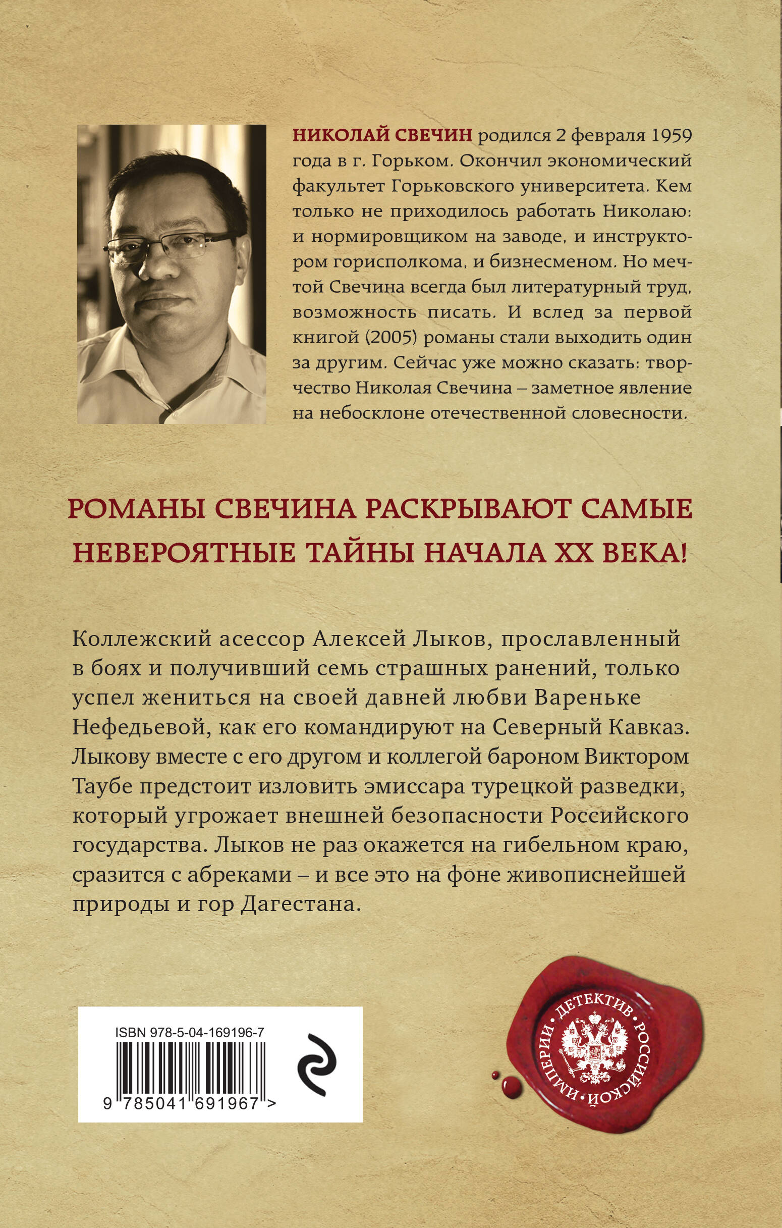 Перед вами серия известного автора исторических детективов Николая Свечина о сыщике Алексее Лыкове. Романы и рассказы о Лыкове издаются уже давно, но только в этой серии вы найдете удобную навигацию по всему циклу (порядок чтения) и историческую хронологию (на каждом переплете указан год, в который происходит действие романа). Читать можно и по хронологии - и без нее, но всегда удобно свериться с датами. Сдержанное оформление под старину уже успело заслужить любовь читателей. Коллежский асессор Алексей Лыков, прославленный в боях и получивший семь страшных ранений, только успел жениться на своей давней любви Вареньке Нефедьевой, как его командируют на Северный Кавказ. Лыкову вместе с его другом и коллегой бароном Виктором Таубе предстоит изловить эмиссара турецкой разведки, который угрожает внешней безопасности Российского Государства. Лыков не раз окажется на гибельном краю, сразится с абреками, и все это - на фоне живописнейшей природы и гор Дагестана.| Издательство | ООО "Издательство "Эксмо" |