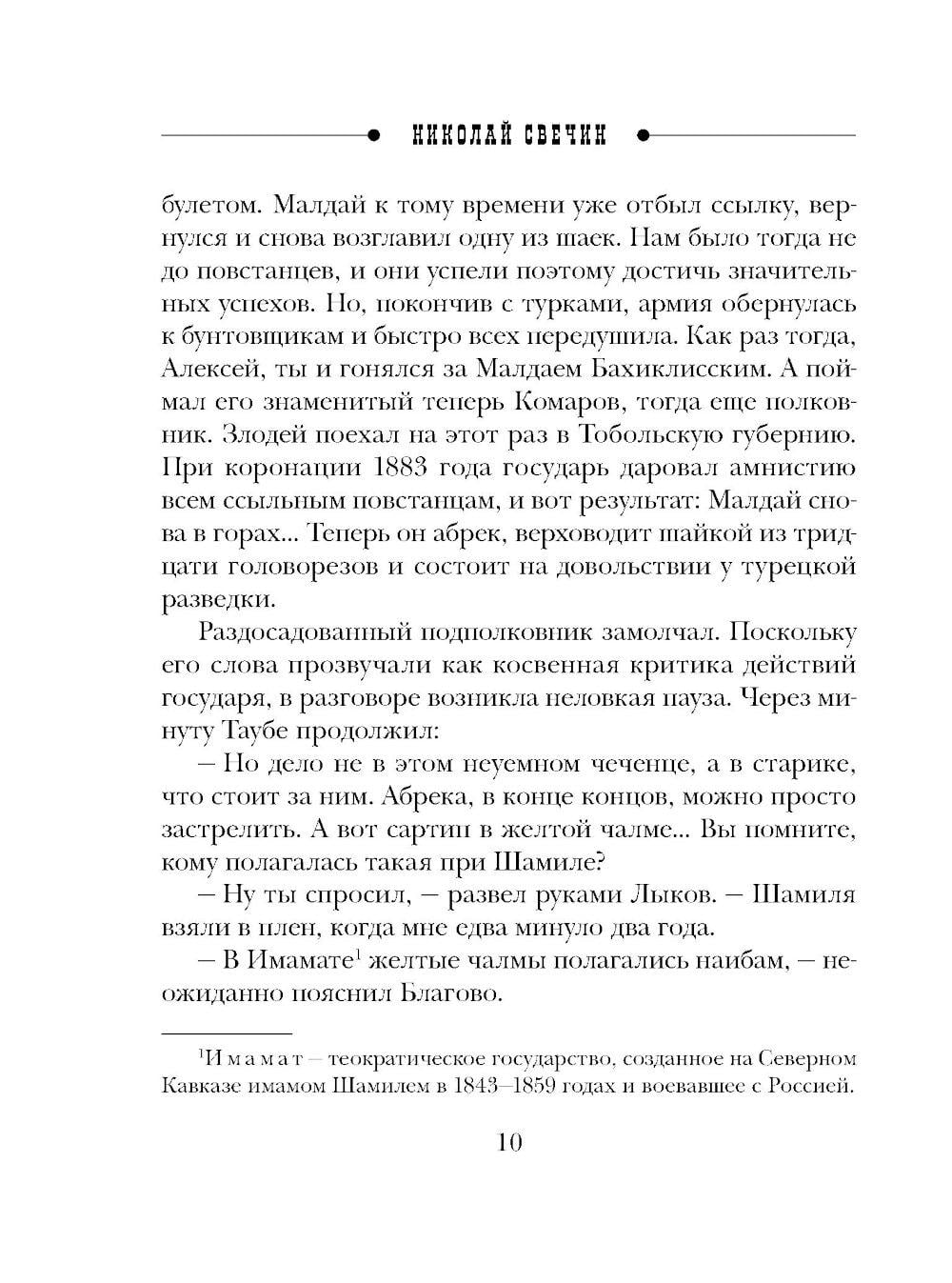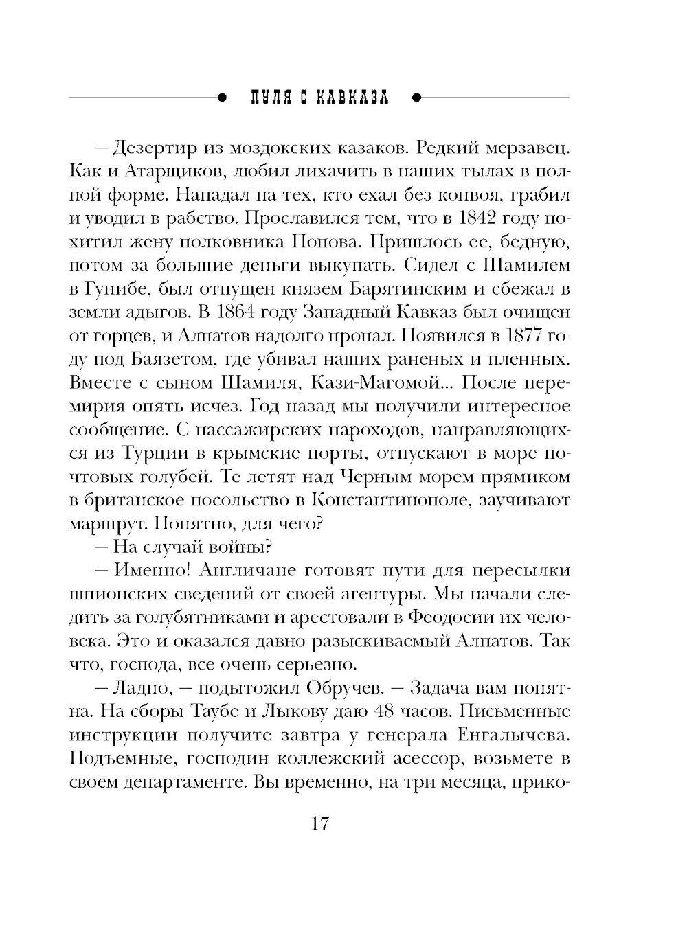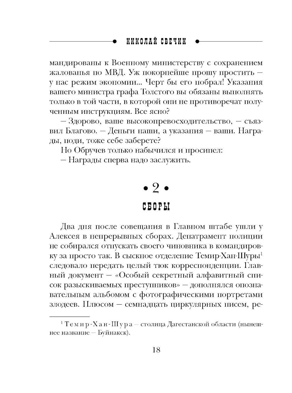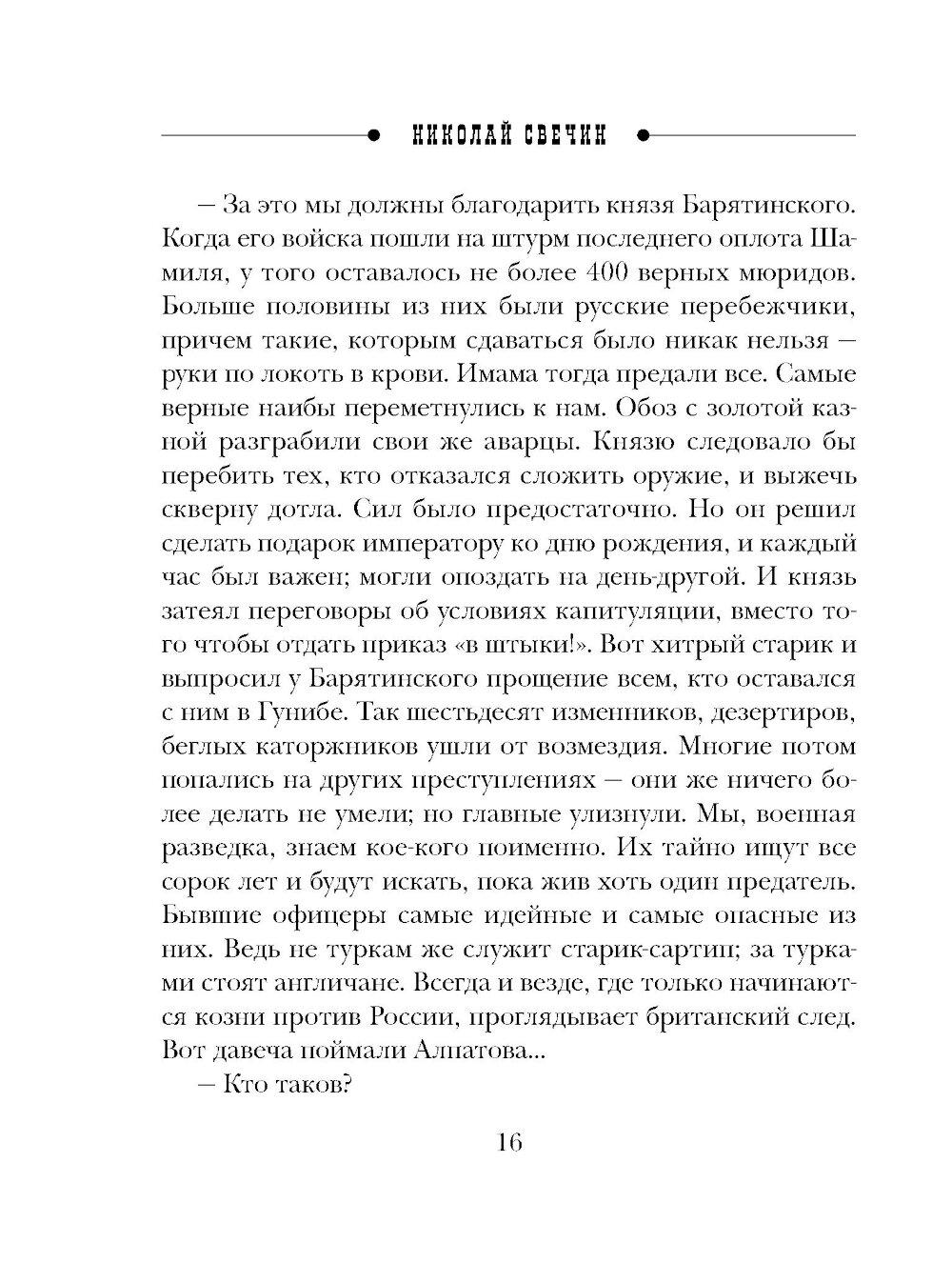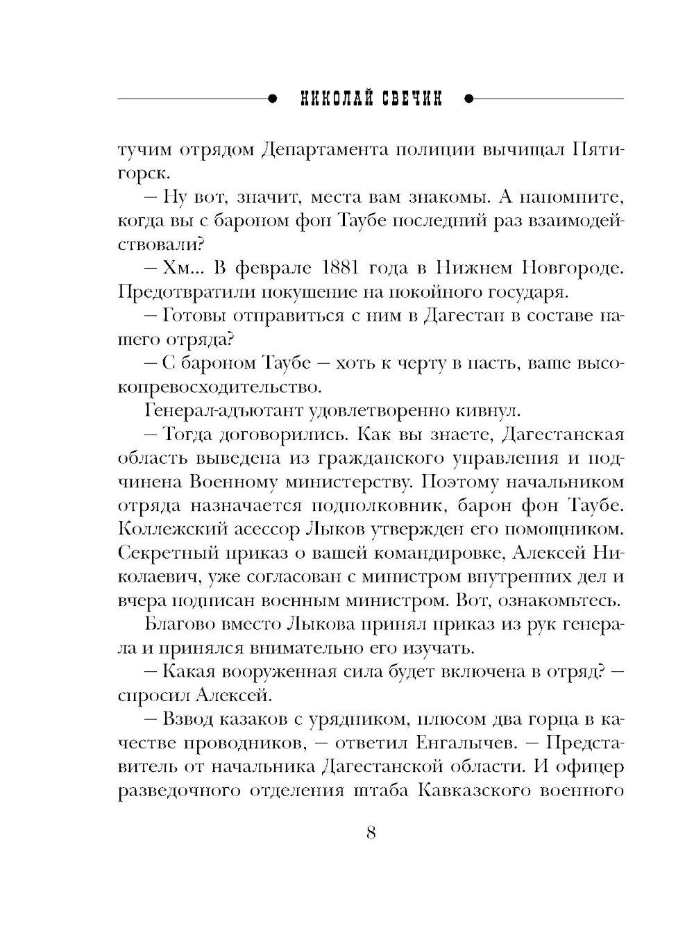 Николай Свечин - один из самых известных авторов исторических детективов, номинант премии «Русский детектив» и лидер в своей нише. Самая знаменитая серия Свечина - серия про расследования Алексея Лыкова. Она насчитывает уже более 30 романов и сборников, в каждом из которых - отдельная история преступлений, но узнаваемые герои. Эффект остросюжетного сериала. Коллежский асессор Алексей Лыков, прославленный в боях и получивший семь страшных ранений, только успел жениться на своей давней любви Вареньке Нефедьевой, как его командируют на Северный Кавказ. Лыкову вместе с его другом и коллегой бароном Виктором Таубе предстоит изловить эмиссара турецкой разведки, который угрожает внешней безопасности Российского Государства. Лыков не раз окажется на гибельном краю, сразится с абреками, и все это - на фоне живописнейшей природы и гор Дагестана.| Издательство | Эксмо |