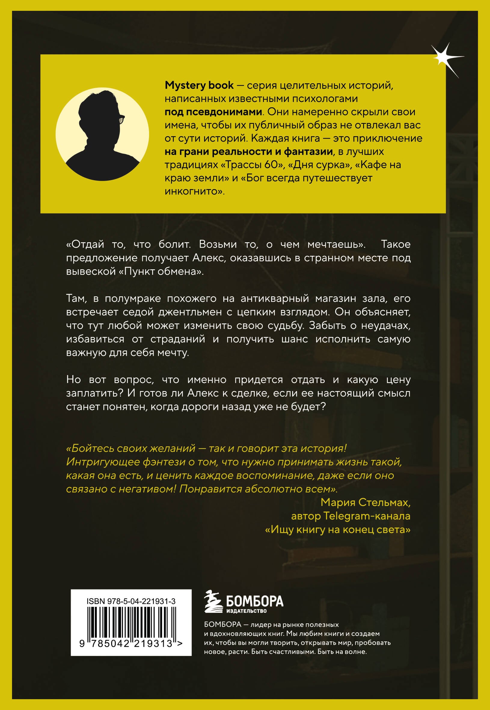 «Отдай то, что болит. Возьми то, о чем мечтаешь». Такое предложение получает Алекс, оказавшись в странном месте под вывеской «Пункт обмена». Там, в полумраке похожего на антикварный магазин зала, его встречает седой джентльмен с цепким взглядом. Он объясняет, что тут любой может изменить свою судьбу. Забыть о неудачах, избавиться от страданий и получить шанс исполнить самую важную для себя мечту. Но вот вопрос, что именно придется отдать и какую цену заплатить? И готов ли Алекс к сделке, если ее настоящий смысл станет понятен, когда дороги назад уже не будет? ОТЗЫВ: «Бойтесь своих желаний - так и говорит эта история! Интригующее фэнтези о том, что нужно принимать жизнь, какой она есть, и ценить каждое воспоминание, даже если оно связано с негативом! Понравится абсолютно всем». - Мария Стельмах, автор Telegram-канала «ищу книгу на конец света»| Издательство | ООО "Издательство "Эксмо" |