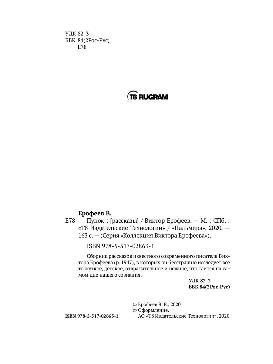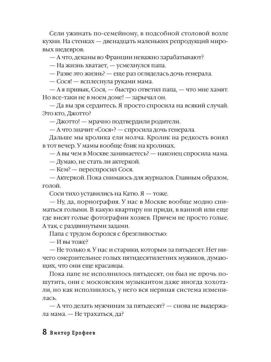 Сборник рассказов известного современного писателя Виктора Ерофеева (р. 1947), в которых он бесстрашно исследует все то жуткое, детское, отвратительное и нежное, что таится на самом дне нашего сознания.| Издательство | Т8 RUGRAM |