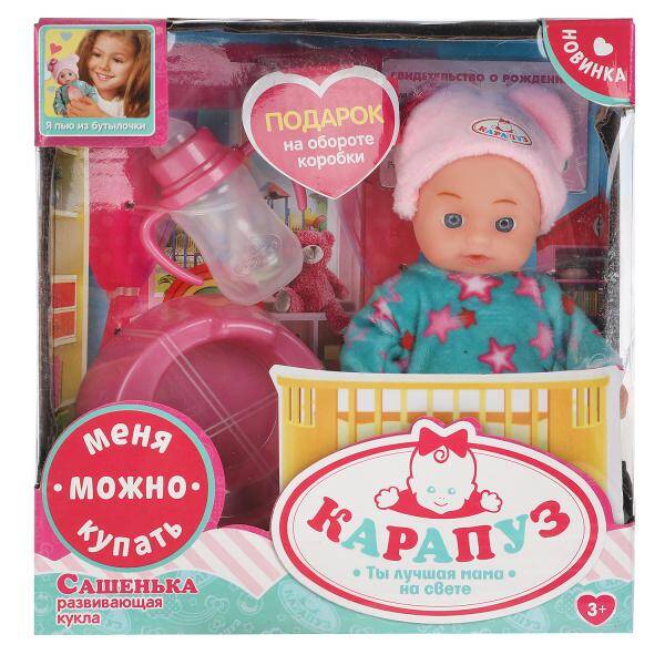 Аннотация: Пупс без озвучки Сашенька 15 см, пьет,писает, 2 акс,кор КАРАПУЗ в кор.84шт