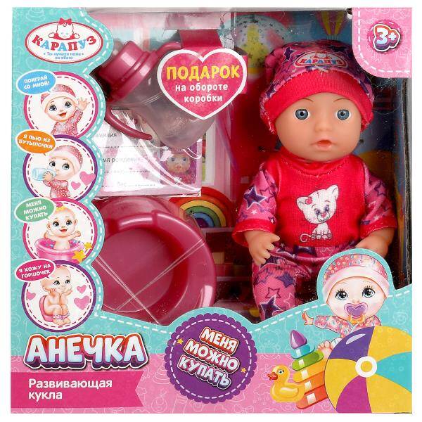 Развивающий пупс "Анечка" ТМ "Карапуз" станет прекрасным подарком для маленькой принцессы: - можно купать - пьёт из бутылочки - ходит на горшок - в комплекте: горшок, бутылочка и свидетельство о рождении Этот милый пупс с детально проработанным личиком обязательно понравится вашей малышке. Куколка одета в красочный комбинезон в розово-фиолетовый цветовой гамме с милым принтом. На голове - шапочка в тон. Одежда легко снимается и надевается. Очаровательный пупс непременно вдохновит девочку на множество интересных сюжетов для игр, тем более его можно купать в воде, кормить и сажать на горшок. Благодаря компактному размеру игрушку можно повсюду брать с собой. Игра с пупсом ТМ "Карапуз" учит ребёнка заботиться об окружающих, быть ответственным и внимательным, а также развивает: - воображение - память - социально-коммуникативные навыки - моторику Рост куклы: 15 см. Материал: пластмасса + текстиль. Рекомендовано детям от 3-х лет.| Издательство | С-Маркет ООО |
