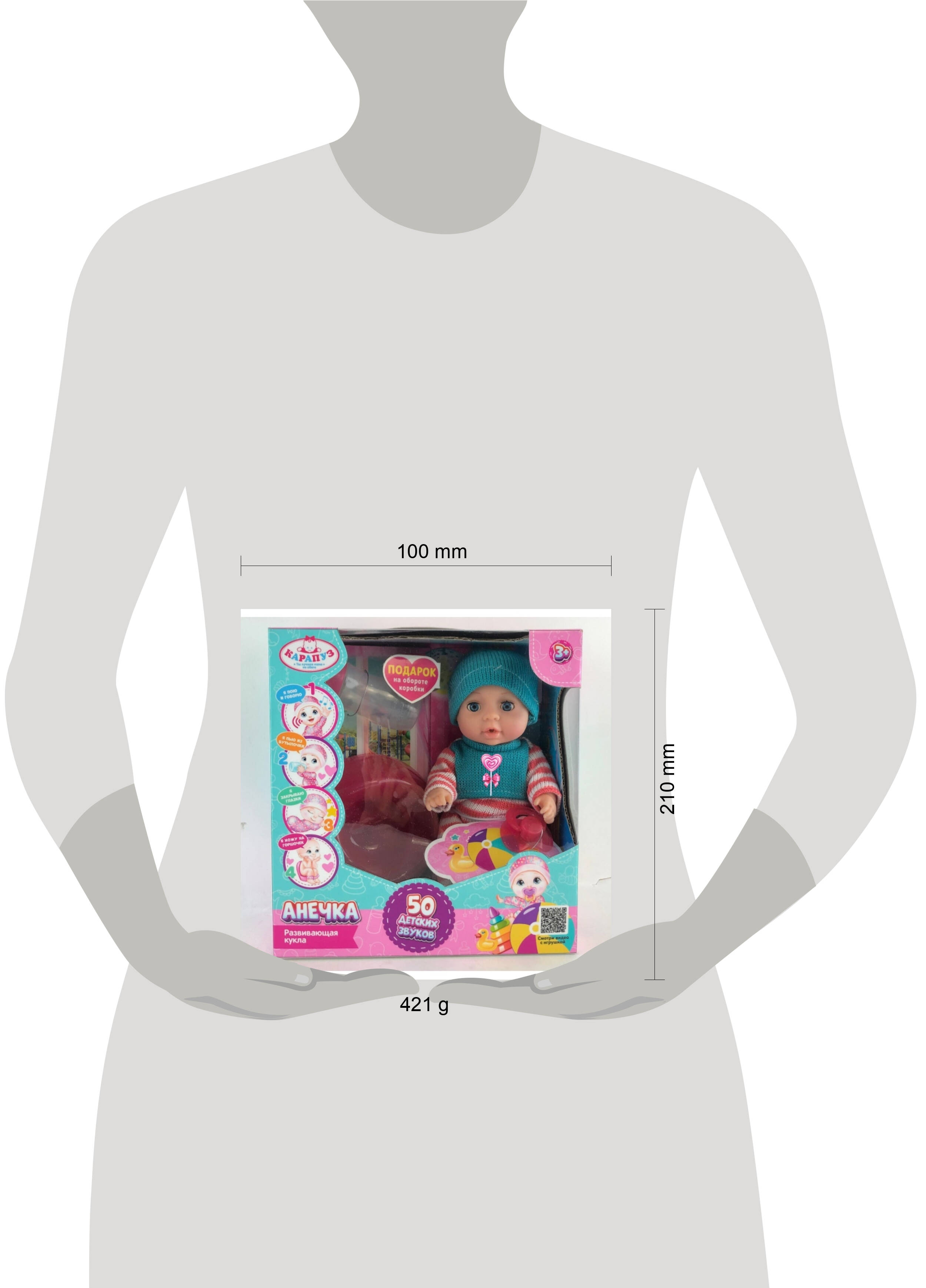 Интерактивный пупс "Анечка" ТМ "Карапуз" станет замечательным подарком для вашей принцессы: - издаёт детские звуки: "смех", "лепет", "гуление", "плач", "кашель", "чихание", "кряхтение", "капризы", "икоты" - произносит 15 фраз: "Спой мне колыбельную песенку", "Расскажи сказку, мамочка", "Покорми меня, мамочка", "Одень меня потеплее, мамочка", "Поменяй мне памперс", "Возьми меня на ручки, мамочка", "Я так люблю с тобой играть!", "Давай поиграем в прятки!", "Ку-ку, мамочка, найди меня!", "Ты - самая лучшая мама на свете!", "Поцелуй меня, мамочка!", "Я тебя люблю!", "Покачай меня на ручках!", "Мама!", "Папа!" - ходит на горшок - пьёт из бутылочки - закрывает глазки - подарок на обороте коробки В комплекте: - горшок - бутылочка - пустышка Милый пупс Анечка с детально проработанным личиком обязательно понравится вашей малышке. Кукла одета в тёплый вязаный костюмчик и бирюзовую шапочку. Одежда легко надевается и снимается. Для более интересной игры в комплекте с пупсом идут разнообразные аксессуары. Игра с интерактивным пупсом ТМ "Карапуз" учит ребёнка заботиться об окружающих, быть ответственным и внимательным, а также развивает: - воображение - память - звуковое восприятие и музыкальный слух - социально-коммуникативные навыки Рост: 20 см. Материал: пластмасса + текстиль. Работает от 3-х батареек типа LR44 (в комплекте). Рекомендовано детям от 3-х лет.| Издательство | С-Маркет ООО |