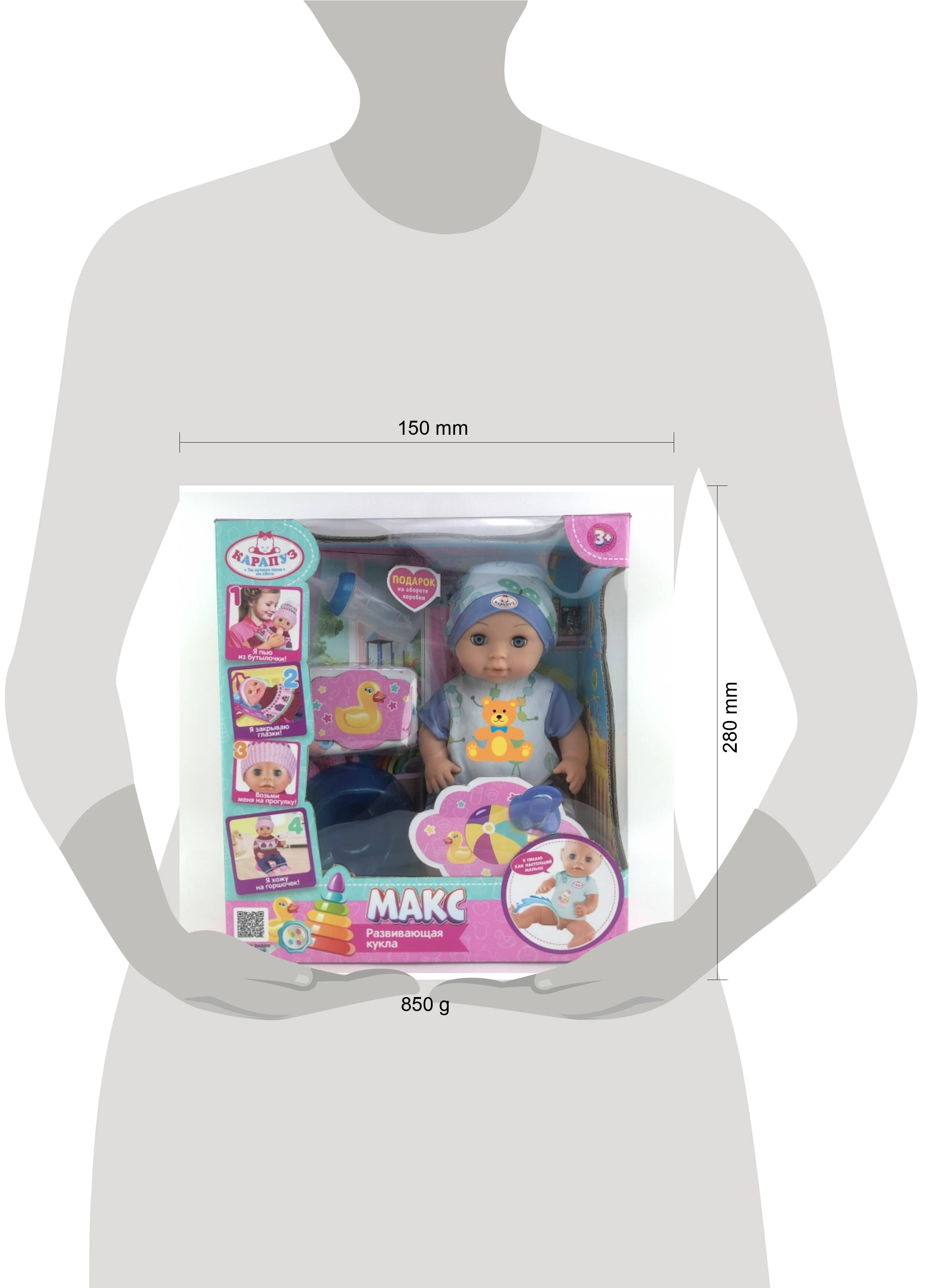 Развивающая интерактивная кукла "Макс" ТМ "Карапуз" станет прекрасным подарком для вашей принцессы: - воспроизводит 50 детских звуков - пьёт из бутылочки - ходит на горшок - закрывает глазки - подарок на обороте упаковки: выдави и играй! В комплекте: - горшок - бутылочка - подгузник - пустышка Этот милый пупс, с детально проработанным личиком, обязательно понравится вашей малышке. Макс одет в красивый наряд в голубой цветовой гамме с аппликацией в виде медвежонка и голубую шапочку. Одежда легко надевается и снимается. С таким пупсом девочка может играть в самые разные игры, гулять с ней, петь песни, кормить, переодевать, рассказывать сказки и укладывать спать. Игра с интерактивным пупсом ТМ "Карапуз" учит ребёнка заботиться об окружающих, быть ответственным и внимательным, а также развивает: - воображение - память - внимание - звуковое восприятие и музыкальный слух - социально-коммуникативные навыки Рост куклы: 30 см. Материал: пластмасса + текстиль. Рекомендовано детям от 3-х лет.| Издательство | С-Маркет ООО |