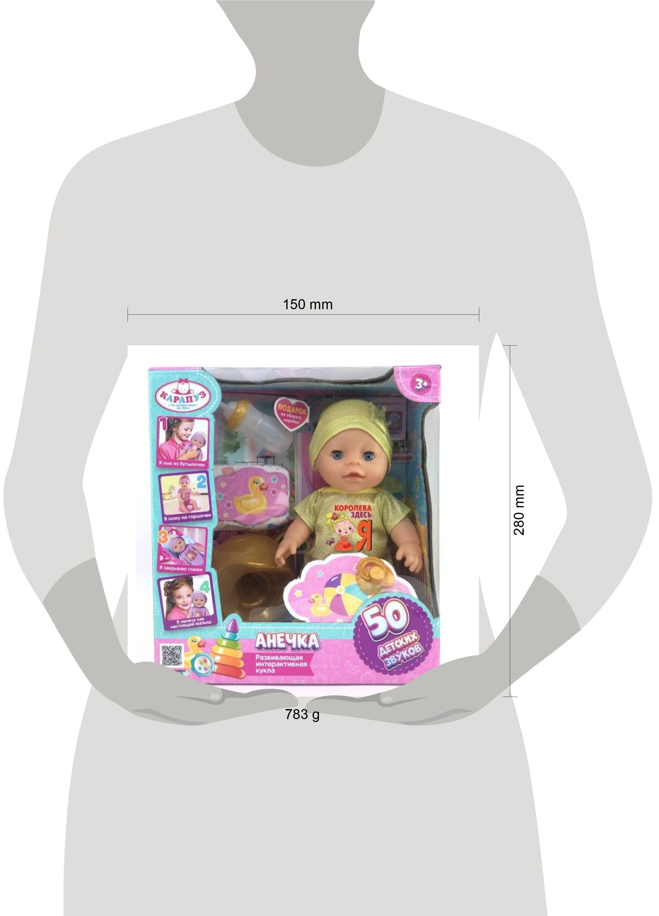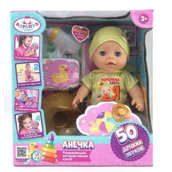 Интерактивный пупс "Анечка" ТМ "Карапуз" станет замечательным подарком для вашей принцессы: - издаёт 50 детских звуков: "смех", "лепет", "гуление", "плач", "кашель", "чихание", "кряхтение", "капризы", "икота" - знает 15 фраз: "Спой мне колыбельную песенку", "Расскажи сказку, мамочка", "Покорми меня, мамочка", "Одень меня потеплее, мамочка", "Поменяй мне памперс", "Возьми меня на ручки, мамочка", "Я так люблю с тобой играть!", "Давай поиграем в прятки!", "Ку-ку, мамочка, найди меня!", "Ты самая лучшая мама на свете!", "Поцелуй меня, мамочка!", "Мама!", "Папа!" - ходит на горшок - пьёт из бутылочки - закрывает глазки - подарок на обороте коробки В комплекте: - горшок - подгузник - бутылочка - пустышка Милый пупс Анечка с детально проработанным личиком, обязательно понравятся вашей малышке. Кукла одета в нарядный костюмчик в золотистой цветовой гамме. Одежда легко надевается и снимается. Для более интересной игры в комплекте с пупсом идут разнообразные аксессуары. Игра с интерактивным пупсом ТМ "Карапуз" учит ребёнка заботиться об окружающих, быть ответственным и внимательным, а также развивает: - воображение - память - звуковое восприятие и музыкальный слух - социально-коммуникативные навыки Рост: 30 см. Материал: пластмасса + текстиль. Работает от 3-х батареек типа LR44 (в комплекте). Рекомендовано детям от 3-х лет.