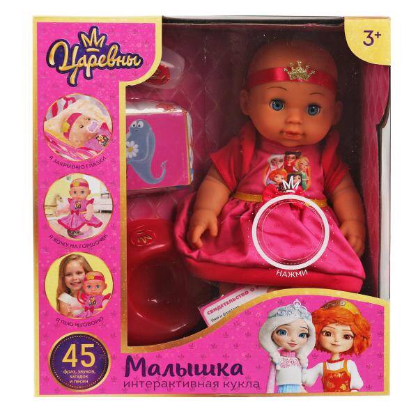 Интерактивная кукла "Царевны" ТМ "Карапуз" станет прекрасным подарком для вашей принцессы: - воспроизводит 45 фраз, звуков, загадок и песен - пьёт из бутылочки - закрывает глазки - ходит на горшок В комплекте: - горшок - бутылочка - пустышка - подгузник Этот милый пупс, с детально проработанным личиком, обязательно понравится вашей малышке. Куколка одета в яркое розовое платьице с изображением героинь мультсериала и повязку на голове в тон. Одежда легко надевается и снимается. С такой куклой девочка может играть в самые разные игры, гулять с ней, петь песни, кормить, переодевать, рассказывать сказки и укладывать спать. Игра с интерактивным пупсом ТМ "Карапуз" учит ребёнка заботиться об окружающих, быть ответственным и внимательным, а также развивает: - воображение - память - внимание - звуковое восприятие и музыкальный слух - социально-коммуникативные навыки Рост куклы: 30 см. Материал: пластмасса + текстиль. Работает от 3-х батареек типа LR44 (в комплекте). Рекомендовано детям от 3-х лет.| Издательство | С-Маркет ООО |