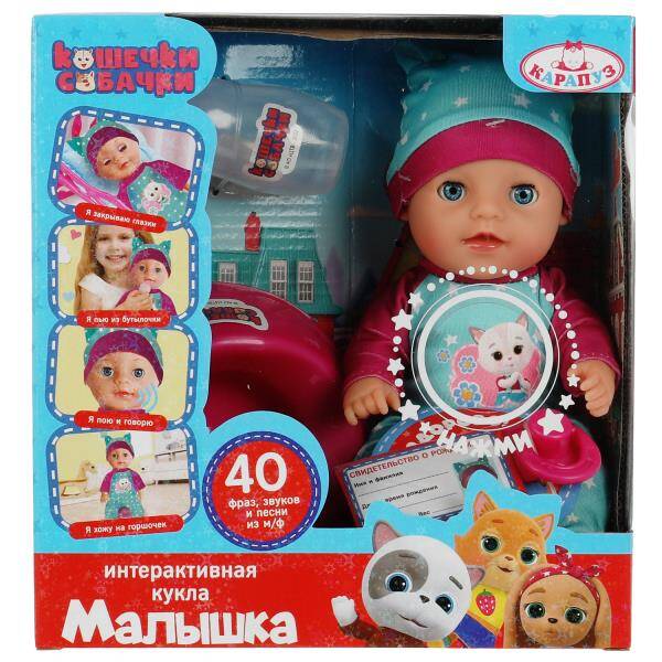 Аннотация: Пупс озвуч КОШЕЧКИ - СОБАЧКИ 20см, пьет, пис, 40 фраз и песен, 3 акс КАРАПУЗ в кор.24шт