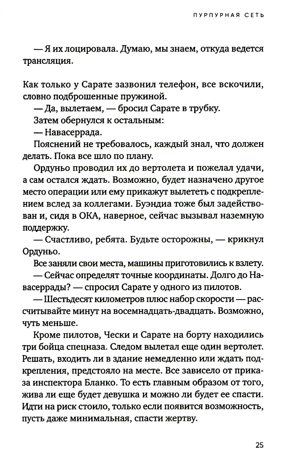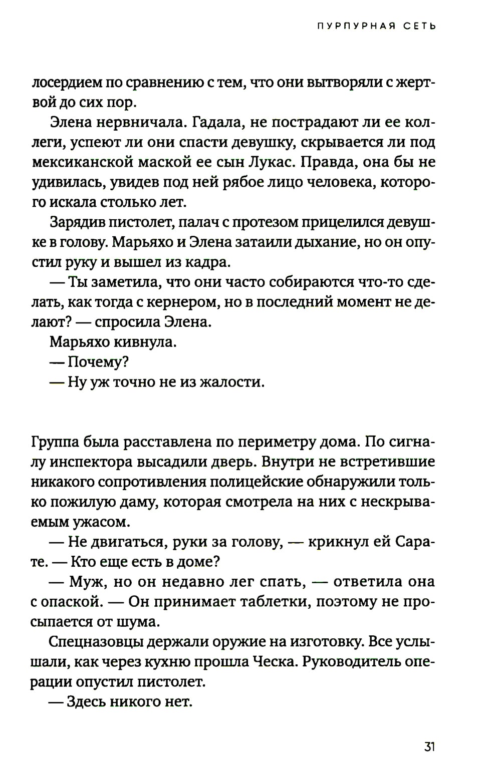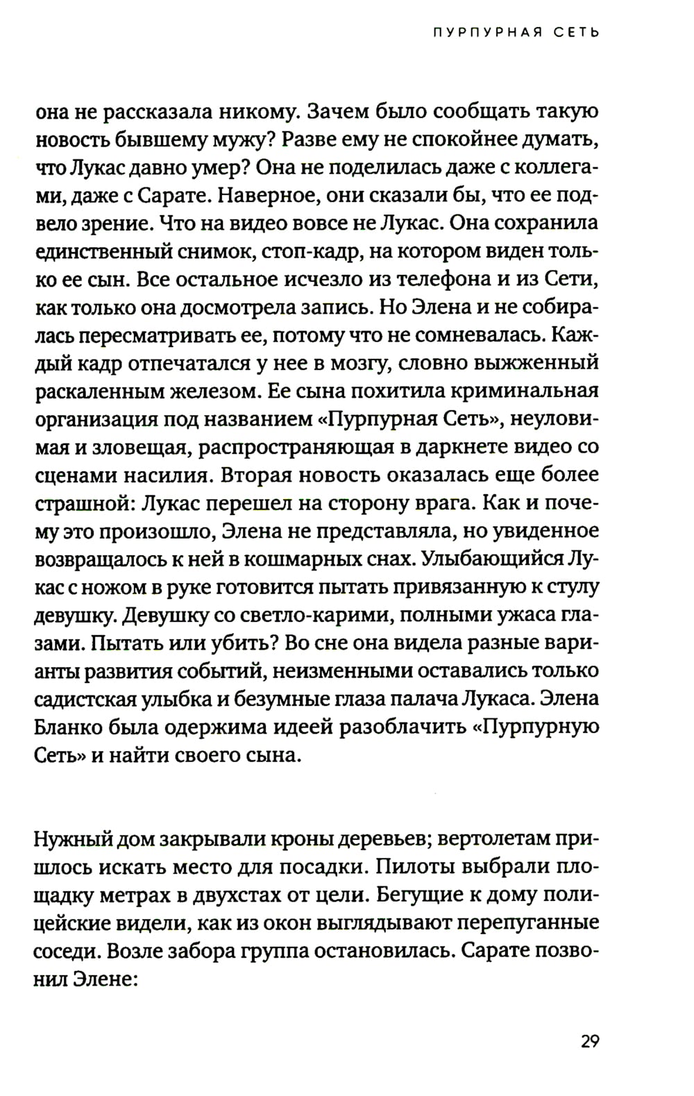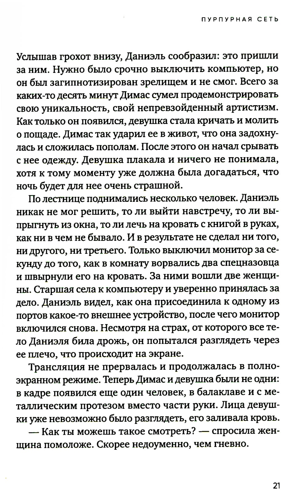 Во второй книге о расследованиях инспектора полиции Мадрида Элены Бланко тихий вечер семьи Роблес нарушает внезапный визит нескольких полицейских. Они направляются прямиком в комнату шестнадцатилетнего Даниэля и застают его за просмотром жуткого «реалити-шоу»: двое парней в балаклавах истязают связанную девушку. Попытки определить, откуда ведется трансляция, не дают результата. Не в силах что-либо предпринять, все наблюдают, как изощренные пытки продолжаются до самой смерти жертвы... Инспектор Элена Бланко давно идет по следу преступной группировки «Пурпурная Сеть», зарабатывающей на онлайн-трансляциях в даркнете жестоких пыток и зверских убийств. Даже из ее коллег никто не догадывается, почему это дело особенно важно для Элены. Ведь никто не знает, что именно «Пурпурная Сеть» когда-то похитила ее сына Лукаса. Возможно, одним из убийц на экране был он.| Издательство | Синдбад |