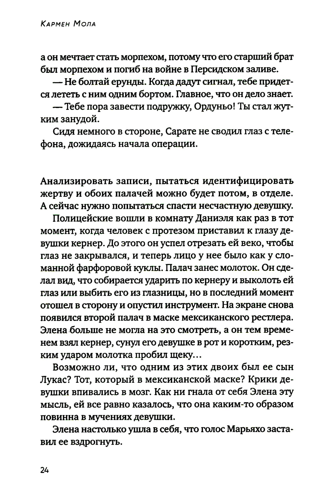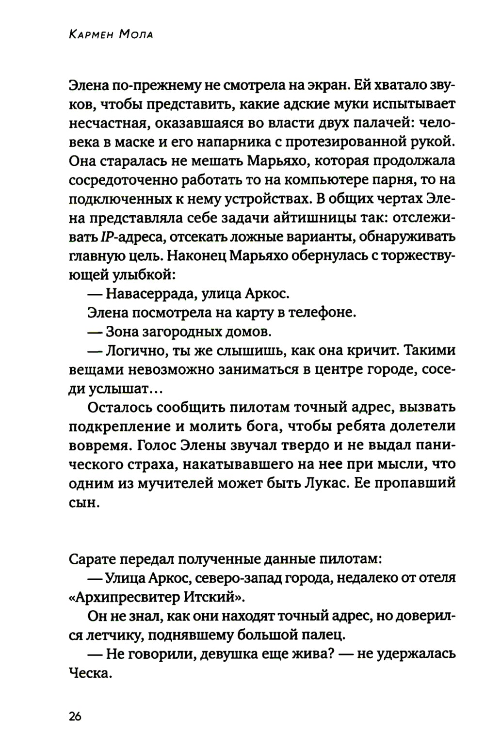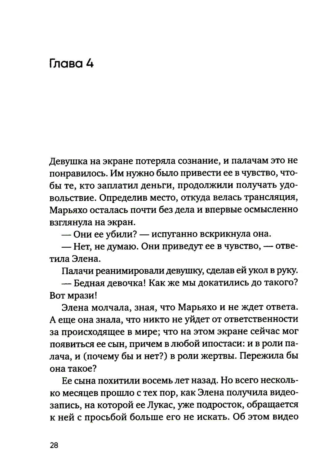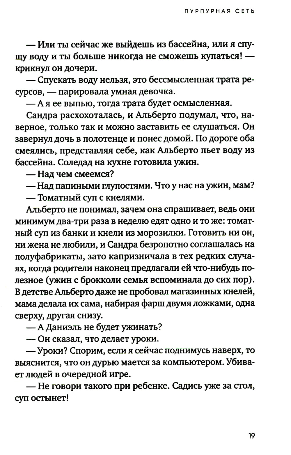 Во второй книге о расследованиях инспектора полиции Мадрида Элены Бланко тихий вечер семьи Роблес нарушает внезапный визит нескольких полицейских. Они направляются прямиком в комнату шестнадцатилетнего Даниэля и застают его за просмотром жуткого «реалити-шоу»: двое парней в балаклавах истязают связанную девушку. Попытки определить, откуда ведется трансляция, не дают результата. Не в силах что-либо предпринять, все наблюдают, как изощренные пытки продолжаются до самой смерти жертвы... Инспектор Элена Бланко давно идет по следу преступной группировки «Пурпурная Сеть», зарабатывающей на онлайн-трансляциях в даркнете жестоких пыток и зверских убийств. Даже из ее коллег никто не догадывается, почему это дело особенно важно для Элены. Ведь никто не знает, что именно «Пурпурная Сеть» когда-то похитила ее сына Лукаса. Возможно, одним из убийц на экране был он.| Издательство | Синдбад |