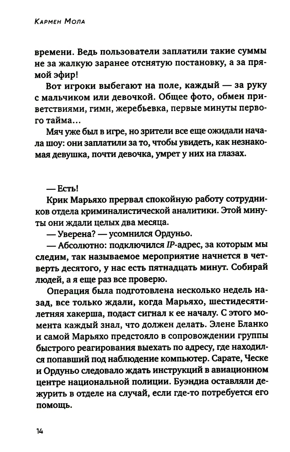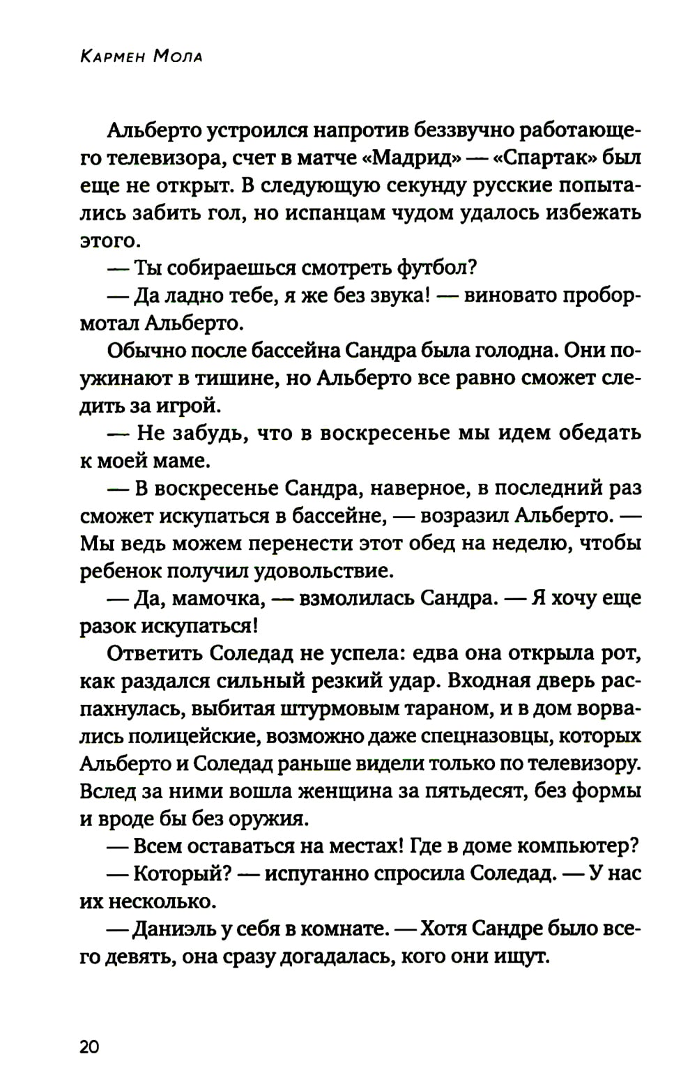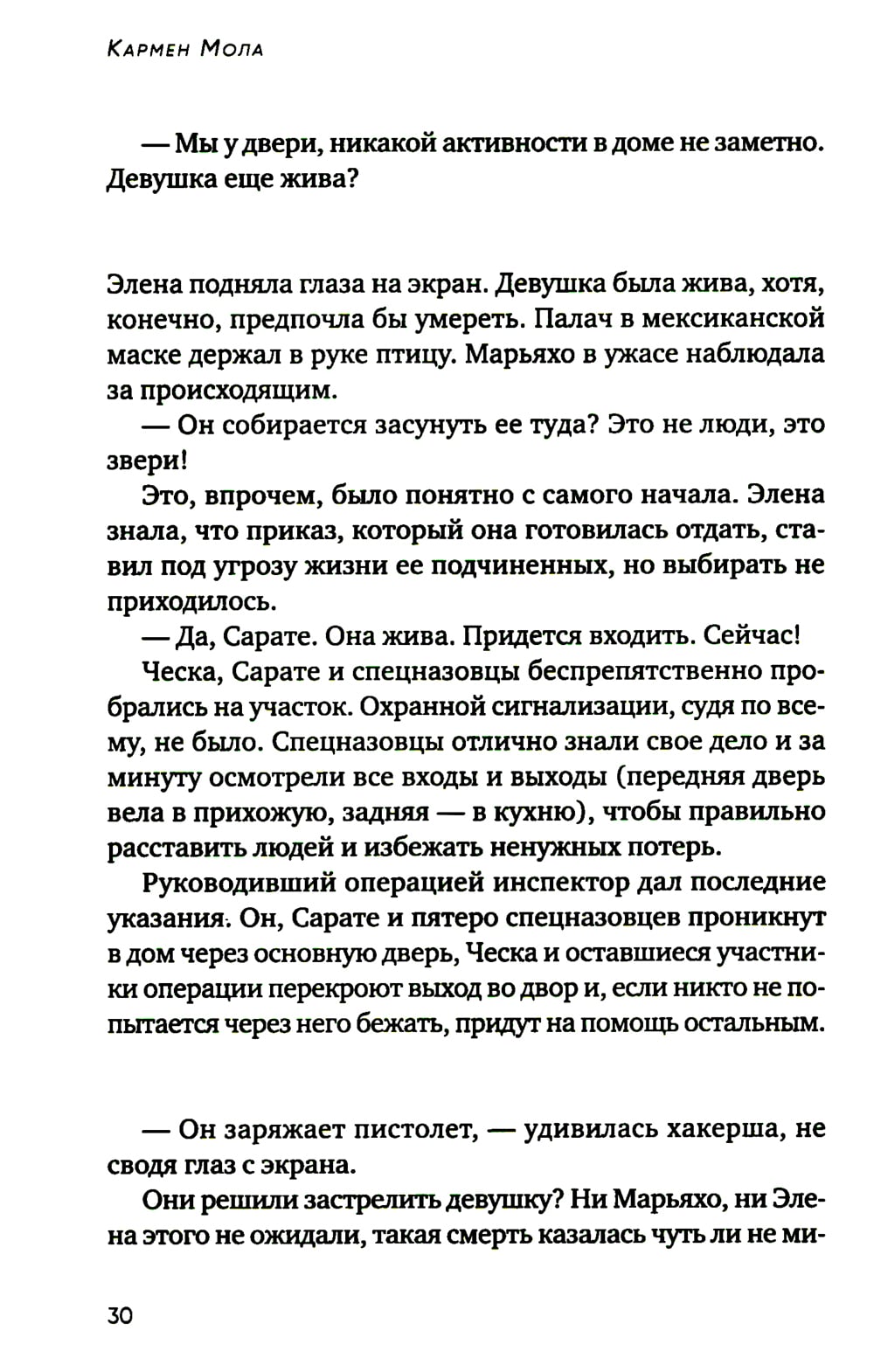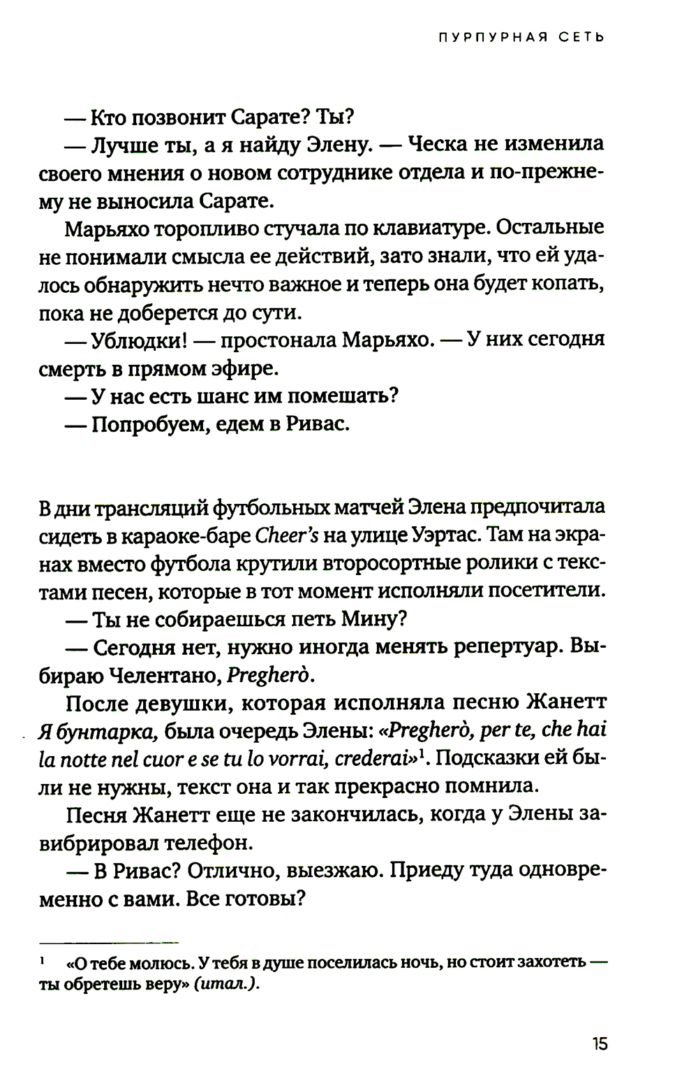 Во второй книге о расследованиях инспектора полиции Мадрида Элены Бланко тихий вечер семьи Роблес нарушает внезапный визит нескольких полицейских. Они направляются прямиком в комнату шестнадцатилетнего Даниэля и застают его за просмотром жуткого «реалити-шоу»: двое парней в балаклавах истязают связанную девушку. Попытки определить, откуда ведется трансляция, не дают результата. Не в силах что-либо предпринять, все наблюдают, как изощренные пытки продолжаются до самой смерти жертвы... Инспектор Элена Бланко давно идет по следу преступной группировки «Пурпурная Сеть», зарабатывающей на онлайн-трансляциях в даркнете жестоких пыток и зверских убийств. Даже из ее коллег никто не догадывается, почему это дело особенно важно для Элены. Ведь никто не знает, что именно «Пурпурная Сеть» когда-то похитила ее сына Лукаса. Возможно, одним из убийц на экране был он.| Издательство | Синдбад |