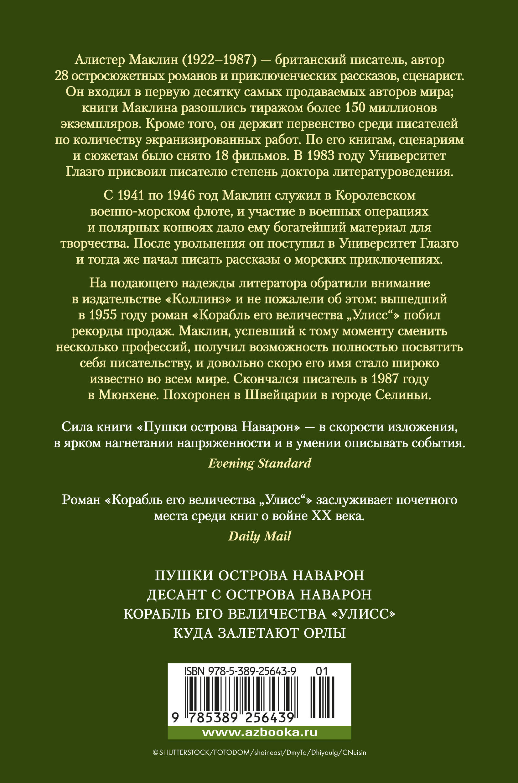 Алистер Маклин (1922-1987) - британский писатель, автор 28 остросюжетных романов и приключенческих рассказов, сценарист. Он входил в первую десятку самых продаваемых авторов мира; книги Маклина разошлись тиражом более 150 миллионов экземпляров, по его романам, сценариям и сюжетам было снято 18 фильмов. В 1983 году Университет Глазго присвоил писателю степень доктора литературоведения. С 1941 по 1946 год Маклин служил на флоте, принимал участие в военных операциях и полярных конвоях, что дало ему богатейший материал для творчества и определило тематику его лучших книг. Настоящий сборник, в который вошли четыре произведения военно-приключенческого жанра, открывает знаменитый роман "Пушки острова Наварон". Группе британских коммандос в кратчайший срок приказано уничтожить береговую батарею гитлеровцев в Эгейском море... "Пушки..." стали бестселлером, а успех одноименной экранизации привел к написанию продолжения. "Десант с острова Наварон" - фактически переделанный сценарий несостоявшегося фильма. Герои Наварона получают новое задание: они должны сорвать немецкую операцию по разгрому партизан в Югославии... Путь в большую литературу открыл Маклину "Корабль его величества "Улисс"" - блестящий дебют и одно из лучших зарубежных произведений о войне. Сюжет основан на истории союзнического конвоя, следовавшего в северные порты Советского Союза. В романе "Куда залетают орлы" Вторая мировая близится к развязке. Похищен генерал, владеющий секретной информацией об открытии второго фронта, и для его спасения в неприступные Альпы направляется спецгруппа...| Издательство | Азбука-Аттикус Издат.группа ООО |