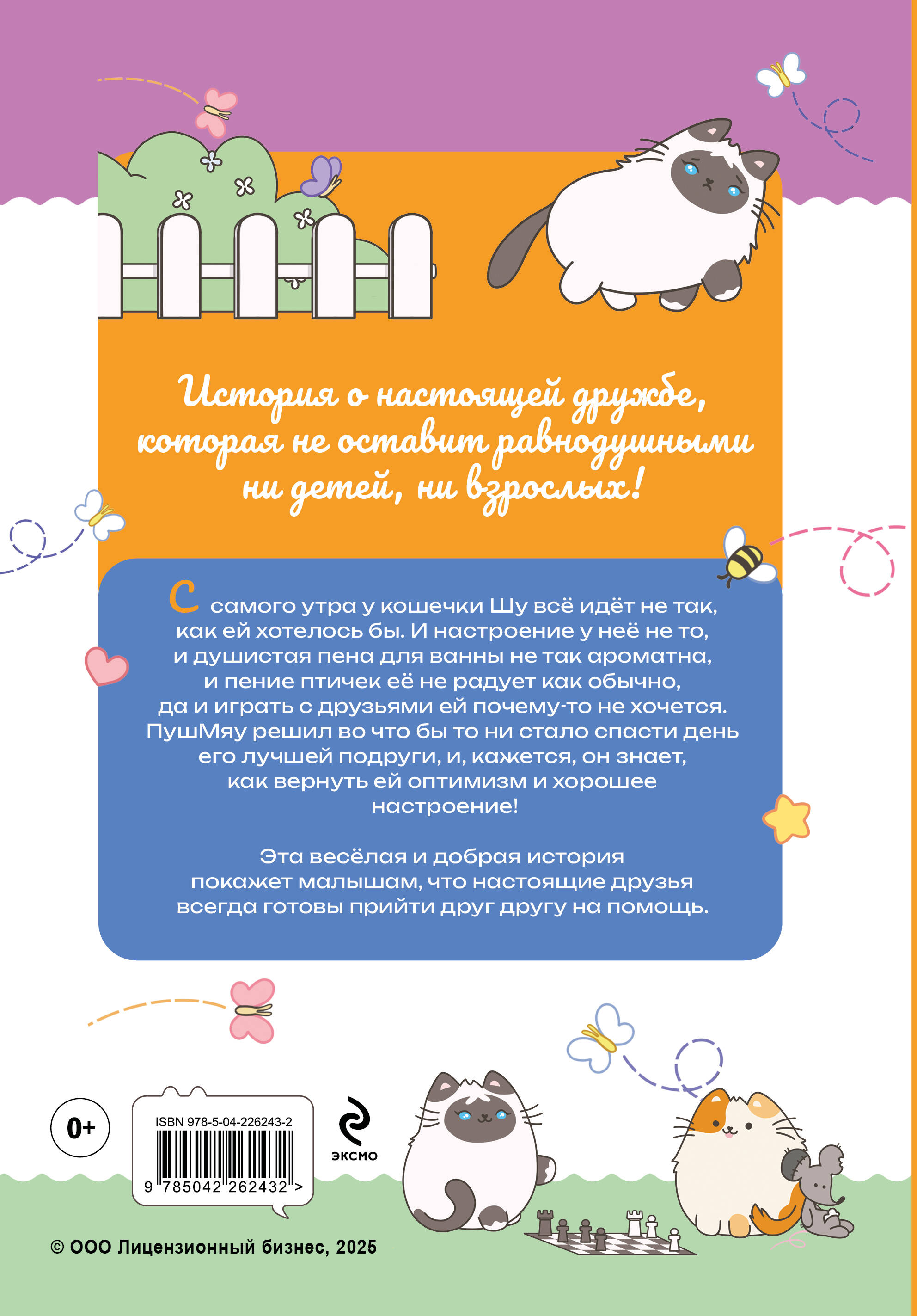 ИСТОРИЯ О НАСТОЯЩЕЙ ДРУЖБЕ, КОТОРАЯ НЕ ОСТАВИТ РАВНОДУШНЫМИ НИ ДЕТЕЙ, НИ ВЗРОСЛЫХ! С самого утра у кошечки Шу все идёт не так, как ей хотелось. И настроение у неё не то, и душистая пена для ванной не так ароматна, и пение птичек её не радует как обычно, да и играть с друзьями ей почему-то не хочется. ПушМяу решил во что бы то ни стало спасти день его лучшей подруги, и, кажется, он знает, как вернуть ей оптимизм и хорошее настроение! Эта весёлая и добрая история покажет малышам, что настоящие друзья всегда готовы прийти друг другу на помощь.| Издательство | ООО "Издательство "Эксмо" |