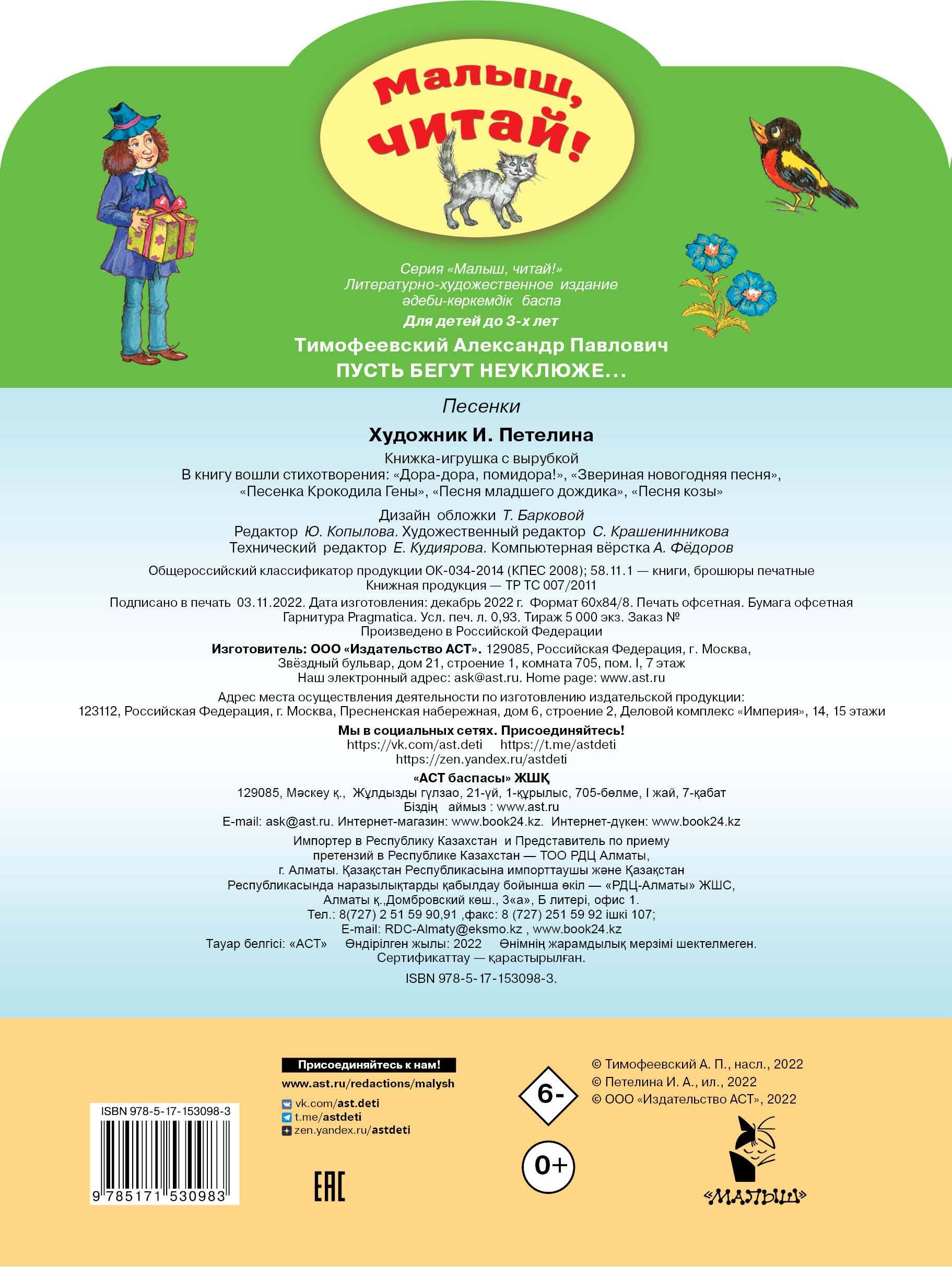 "Пусть бегут неуклюже пешеходы по лужам..." - строки песенки из мультфильма «Чебурашка», которые почти у каждого ассоциируются с приятными воспоминаниями. Слова этой песенки написал поэт, писатель и сценарист Александр Тимофеевский, а музыку - композитор В. Я. Шаинский. Кроме этой песенки в нашу книжку вошли и другие: «Дора-дора, помидора!», «Звериная новогодняя песня», «Песня младшего дождика», «Песня козы». Рисунки И. Петелиной.| Издательство | ИЗДАТЕЛЬСТВО "АСТ" |