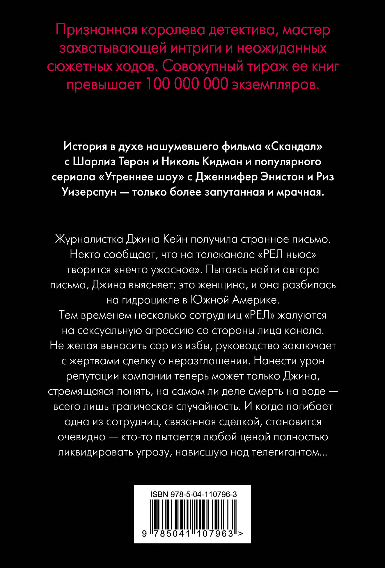 Признанная королева детектива, мастер захватывающей интриги и неожиданных сюжетных ходов. Совокупный тираж ее книг превышает 100 000 000 экземпляров. История в духе нашумевшего фильма «Скандал» с Шарлиз Терон и Николь Кидман и популярного сериала «Утреннее шоу» с Дженнифер Энистон и Риз Уизерспун - только более запутанная и мрачная. Журналистка Джина Кейн получила странное письмо. Некто сообщает, что на телеканале «РЕЛ ньюс» творится «нечто ужасное». Пытаясь найти автора письма, Джина выясняет: это женщина, и она разбилась на гидроцикле в Южной Америке. Тем временем несколько сотрудниц «РЕЛ» жалуются на сексуальную агрессию со стороны лица канала. Не желая выносить сор из избы, руководство заключает с жертвами сделку о неразглашении. Нанести урон репутации компании теперь может только Джина, стремящаяся понять, на самом ли деле смерть на воде - всего лишь трагическая случайность. И когда погибает одна из сотрудниц, связанная сделкой, становится очевидно - кто-то пытается любой ценой полностью ликвидировать угрозу, нависшую над телегигантом…| Издательство | ООО "Издательство "Эксмо" |