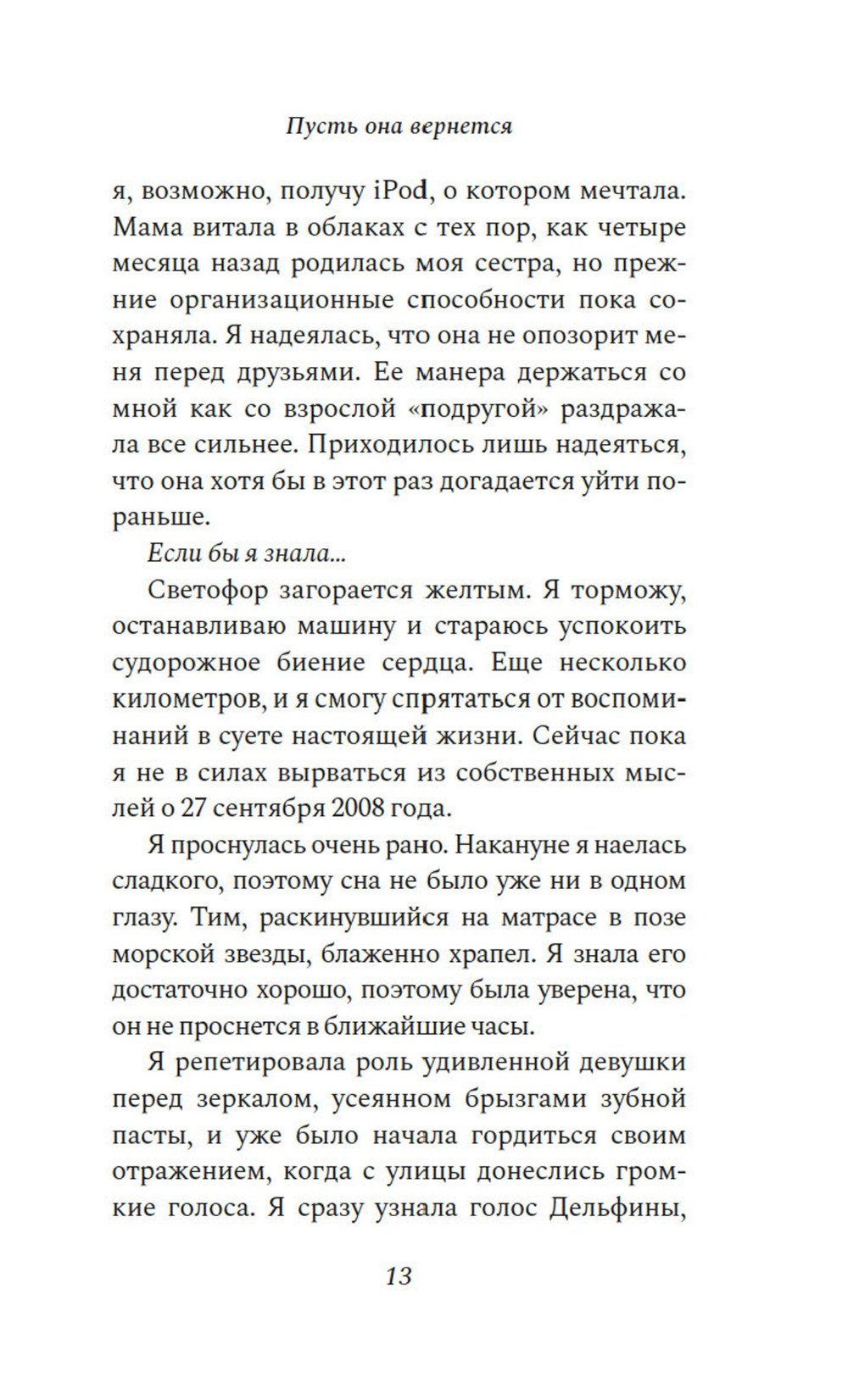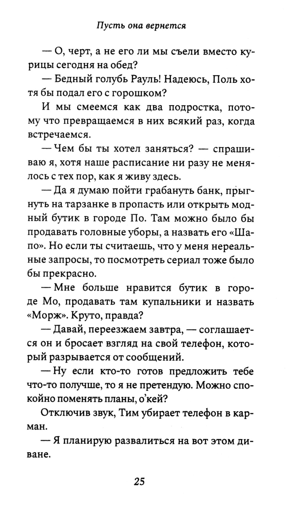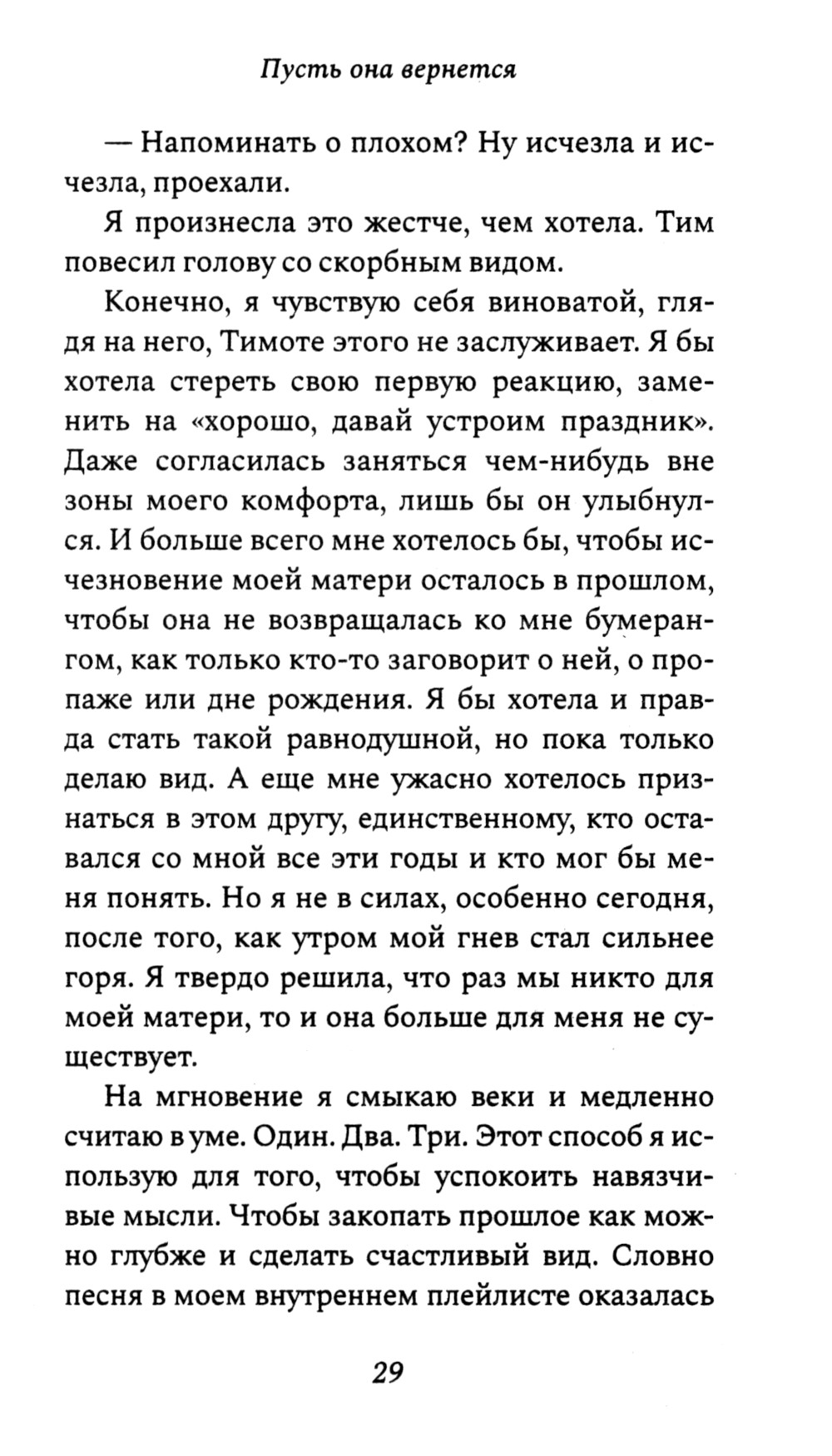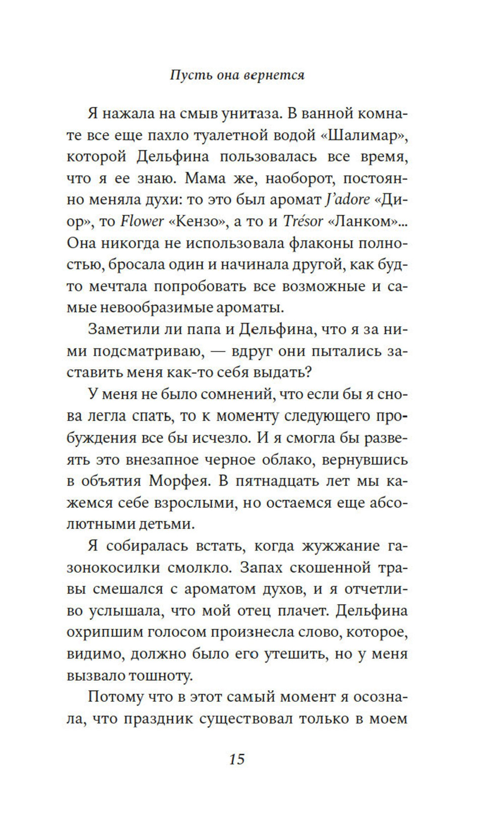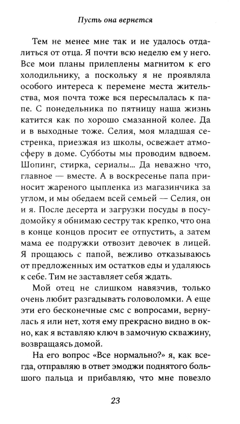 Когда-то давно мать Марго мать ушла из дома, оставив мужа и двух дочерей. Куда она уехала? Почему так поступила? Как сложилась ее дальнейшая судьба? Много лет Марго мучили эти вопросы, пока в один прекрасный день она не увидела портрет матери по телевизору, в репортаже о художественной выставке на Корсике. Решение она приняла спонтанно: взяв за компанию друга детства, Тимоте, купила билеты на солнечный остров в надежде узнать всю правду о своей матери. Но эта поездка откроет ей больше, чем просто семейные тайны. Наконец Марго вспомнит, каково это: жить для себя. «Пусть она вернется» - история о семье, любви, душевных травмах и прощении; теплая и солнечная, как побережье Корсики.| Издательство | Азбука |