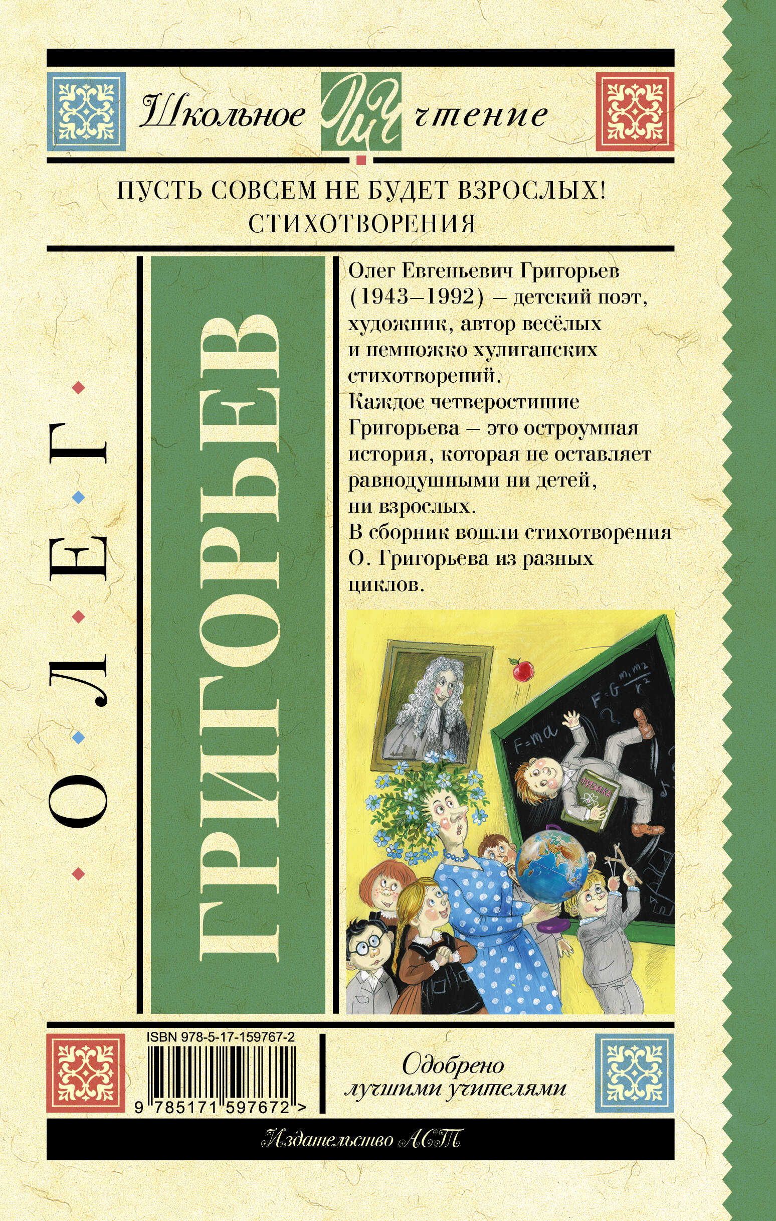 Олег Евгеньевич Григорьев (1943-1992) - детский поэт, художник, автор весёлых и немножко хулиганских стихотворений. Каждое четверостишие Григорьева - это остроумная история, которая не оставляет равнодушными ни детей, ни взрослых. В сборник вошли стихотворения Григорьева из разных циклов.| Издательство | Издательство "АСТ" |