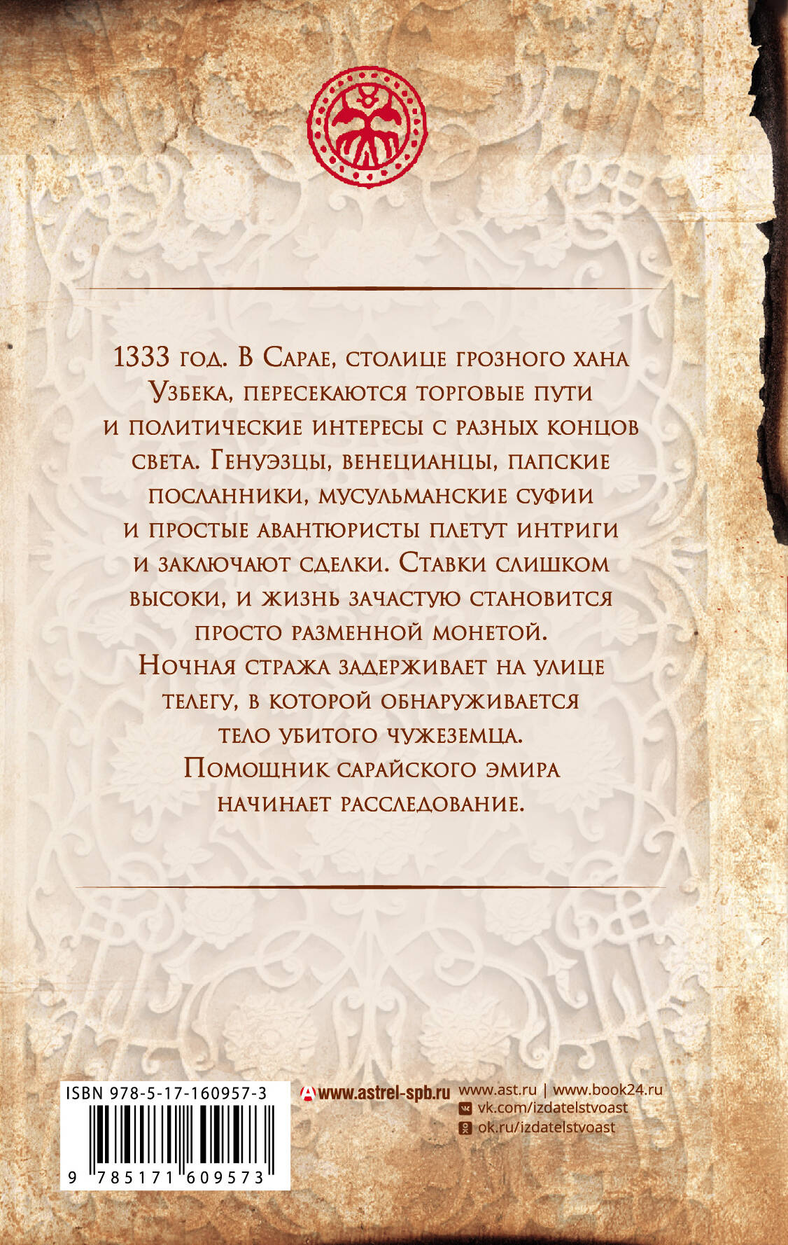 1333 год. В Сарае, столице грозного хана Узбека, пересекаются торговые пути и политические интересы с разных концов света. Генуэзцы, венецианцы, папские посланники, мусульманские суфии и простые авантюристы плетут интриги и заключают сделки. Ставки слишком высоки, и жизнь зачастую становится просто разменной монетой. Ночная стража задерживает на улице телегу, в которой обнаруживается тело убитого чужеземца. Помощник сарайского эмира начинает расследование.| Издательство | Издательство "АСТ" |