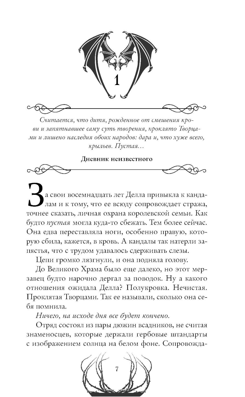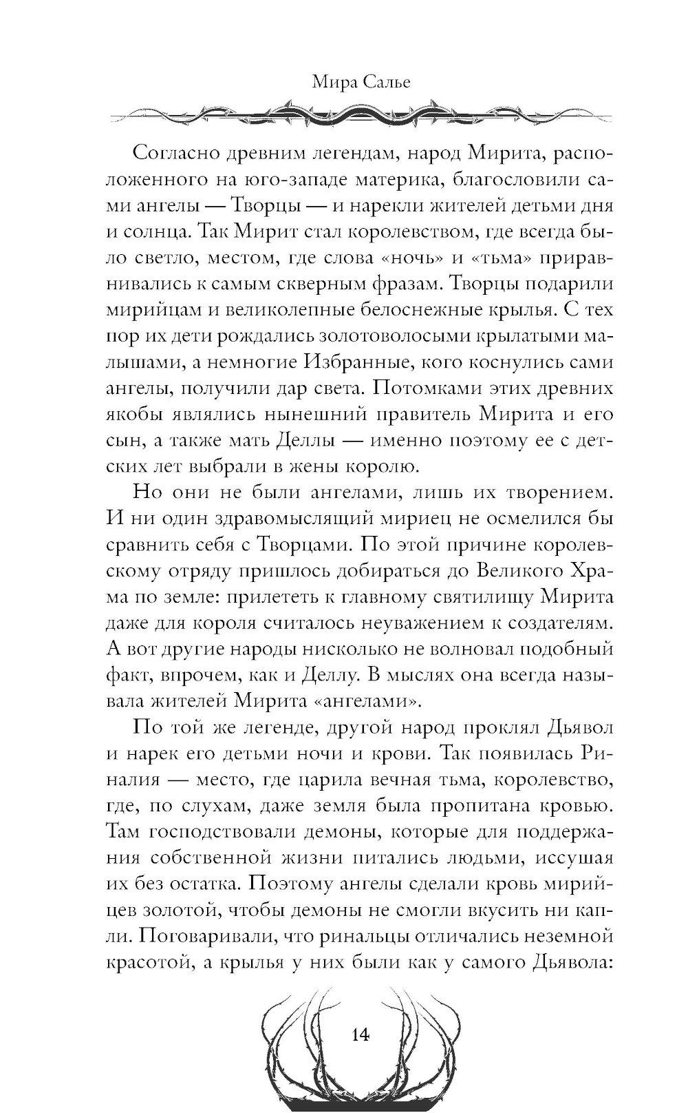 Мирийцы, которых зовут детьми дня и солнца, стражами света - творение самих ангелов. У них могучие белоснежные крылья, а в их жилах течет золотая кровь. Испокон веков они охраняют поднебесный мир от ринальцев, которых зовут детьми ночи и крови, творением самого дьявола... Делла - девушка, которую клеймят проклятой Творцами. Всю жизнь она была пленницей короля Мирита, орудием в руках избранного, чтобы однажды тот покончил с истинным врагом. В день обряда Деллу похищает таинственный незнакомец, и она вынуждена отправиться в Риналию, в земли жестокости и порока, где демоны жаждут лишь крови. Что на самом деле нужно ее спасителю?| Издательство | Эксмо |
