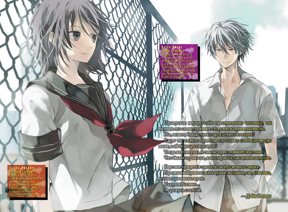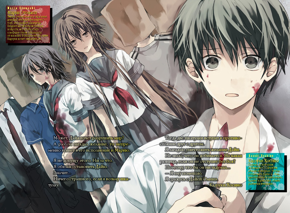 После "Бесцельной игры" Кадзуки и Мария не сразу пришли в себя, и, увы, их покой продлился недолго. Дайя Оминэ вознамерился с помощью шкатулки "Тень преступления и наказание" во что бы то ни стало перекроить мир, избавив его от грешников. Кадзуки не мог позволить Оминэ вовлечь Марию в свои гнусные планы. И не придумал ничего лучше, как воспользоваться шкатулкой "Лента разбитых желаний", заперев в ней бывшего лучшего друга. Но сможет ли Кадзуки остаться собой, пойдя на такие крайние меры? Дайя Оминэ получил шкатулку "Тень преступления и наказание", которая позволяет ему видеть и поглощать чужие грехи, - так Дайя порабощает людей. Его цель - очистить общество, и он не отступит от намеченного. Кто победит?