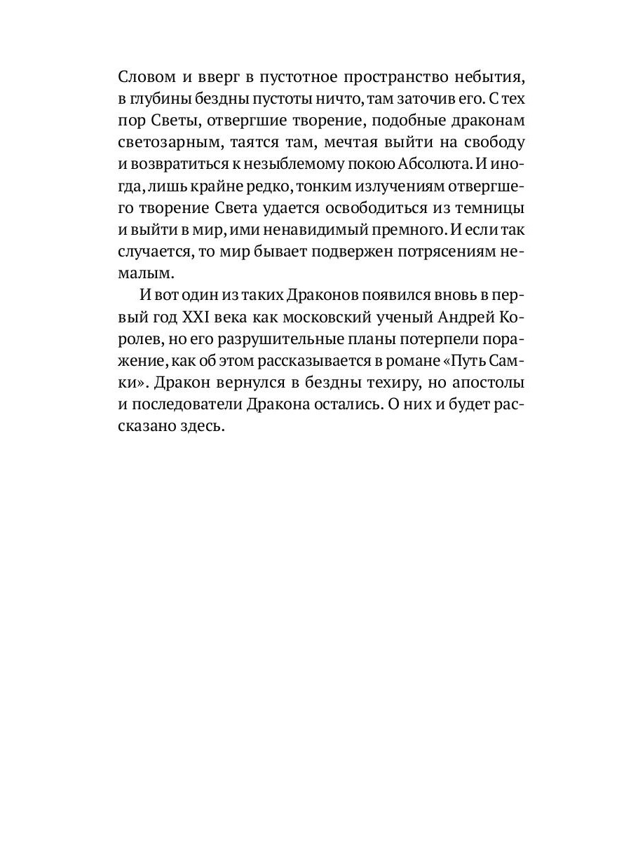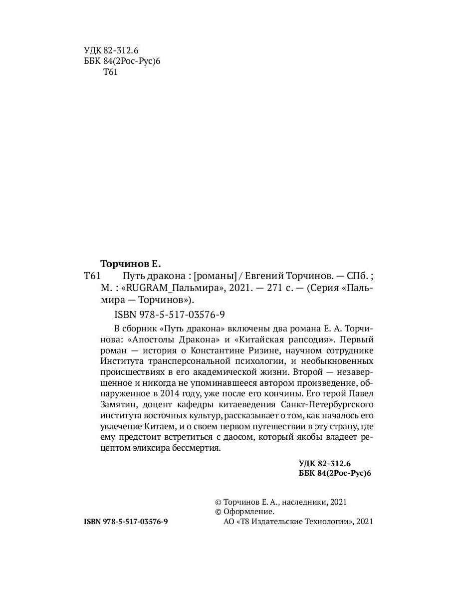 В сборник «Путь дракона» включены два романа Е. А. Торчинова: «Апостолы Дракона» и «Китайская рапсодия». Первый роман - история о Константине Ризине, научном сотруднике Института трансперсональной психологии, и необыкновенных происшествиях в его академической жизни. Второй - незавершенное и никогда не упоминавшееся автором произведение, обнаруженное в 2014 году, уже после его кончины. Его герой Павел Замятин, доцент кафедры китаеведения Санкт-Петербургского института восточных культур, рассказывает о том, как началось его увлечение Китаем, и о своем первом путешествии в эту страну, где ему предстоит встретиться с даосом, который якобы владеет рецептом эликсира бессмертия.| Издательство | Т8 RUGRAM |