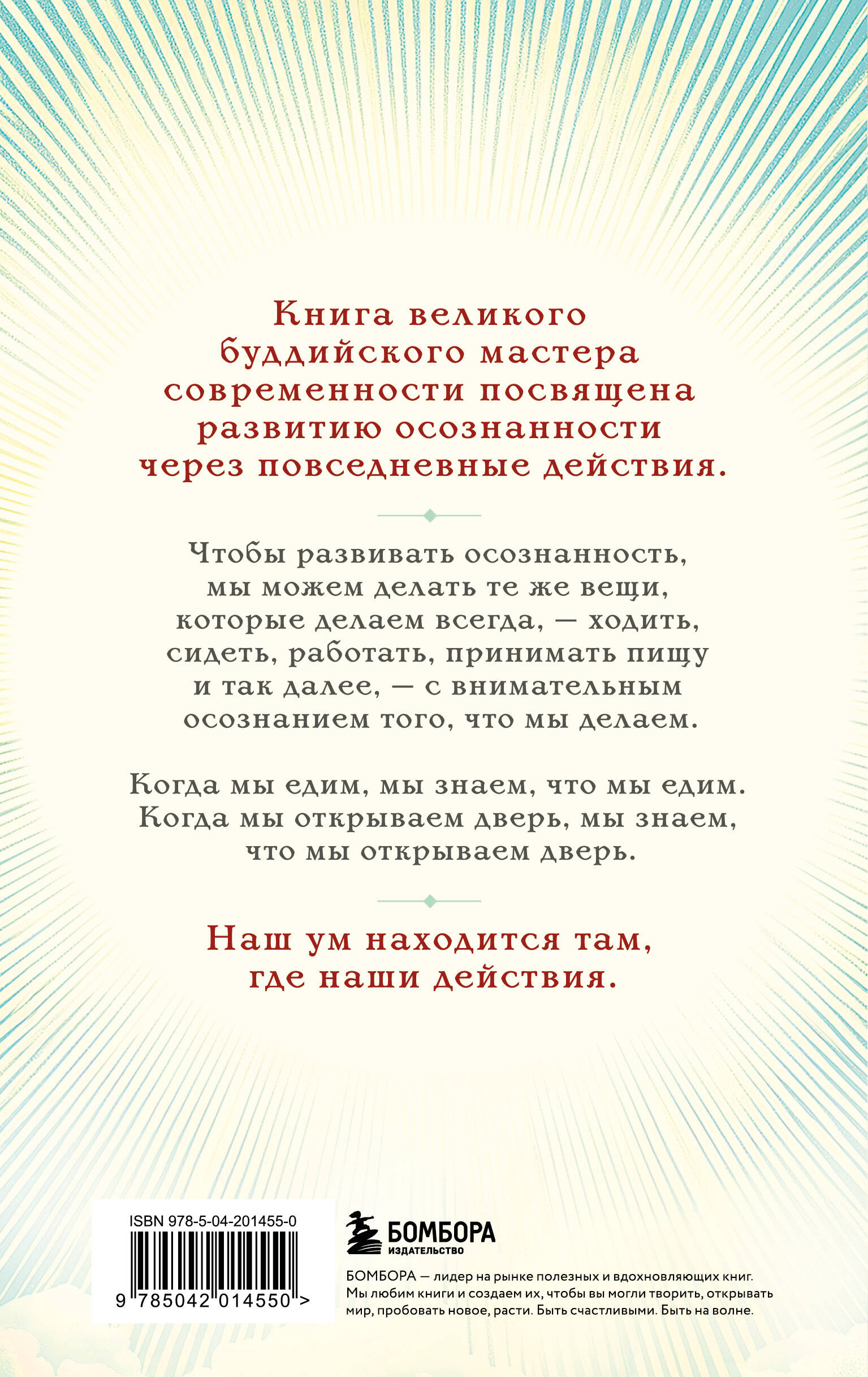 Книга великого буддийского мастера современности посвящена развитию осознанности в повседневной жизни. Чтобы развивать осознанность, мы можем делать те же вещи, которые делаем всегда, - ходить, сидеть, работать, принимать пищу и так далее, - с внимательным осознанием того, что мы делаем. Когда мы едим, мы знаем, что мы едим. Когда мы открываем дверь, мы знаем, что мы открываем дверь. Наш ум находится там, где наши действия.| Издательство | ООО "Издательство "Эксмо" |