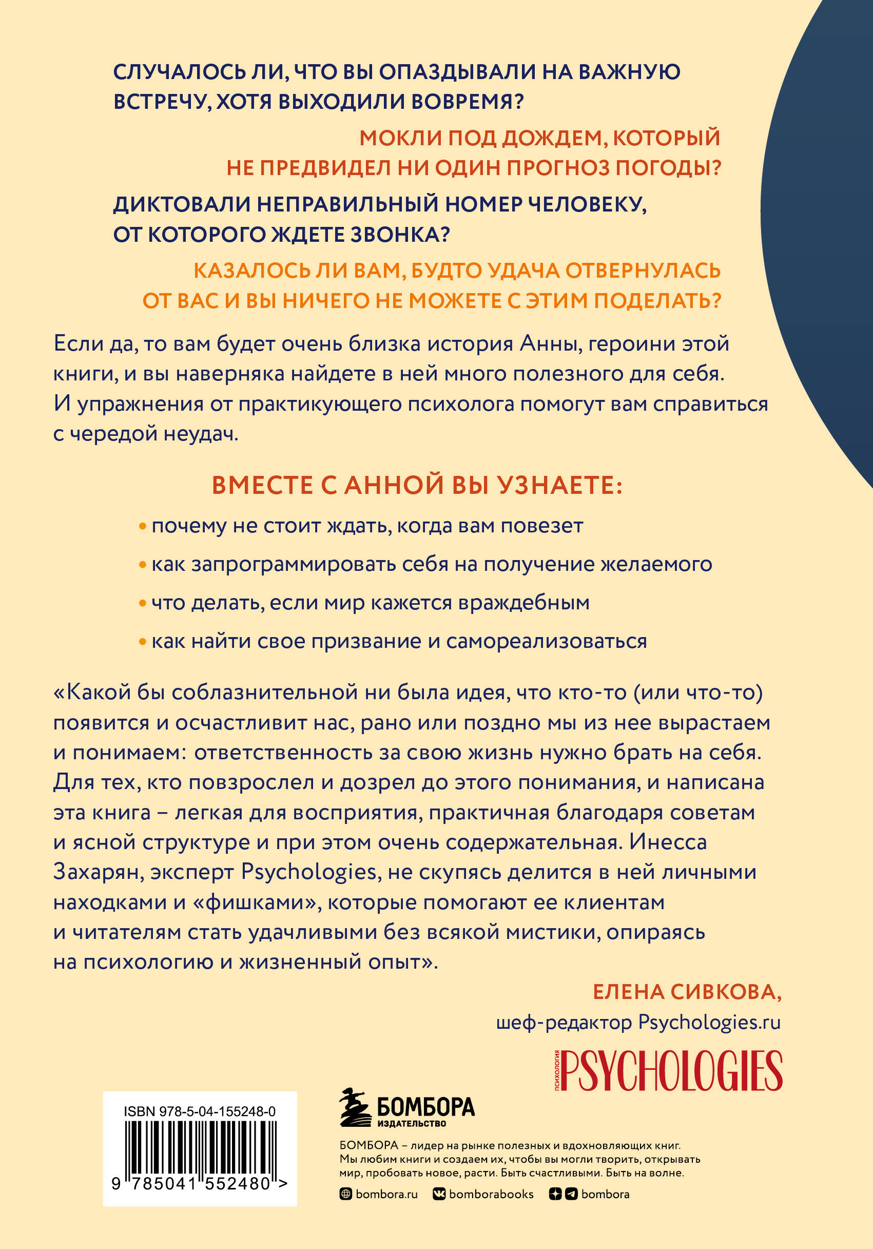 Случалось ли, что вы опаздывали на важную встречу, хотя выходили вовремя? Мокли под дождем, который не предвидел ни один прогноз погоды? Диктовали неправильный номер человеку, от которого ждете звонка? И казалось, будто удача отвернулась от вас и вы ничего не можете с этим поделать? Если да, то вам будет очень близка история Анны, героини этой книги, и вы наверняка найдете в ней много полезного для себя. И упражнения от практикующего психолога помогут вам справиться с чередой неудач. Эта книга - увлекательный роман и психологический тренинг под одной обложкой. Здесь вы найдете истории, в которых наверняка узнаете себя и найдете советы, проверенные временем. А упражнения, разработанные практикующим психологом, помогут вам применить эти советы на практике. Вместе с Анной вы узнаете: - почему не стоит ждать, когда вам повезет; - как запрограммировать себя на получение желаемого; что делать, если мир кажется враждебным; - как найти свое призвание и самореализоваться.| Издательство | ООО "Издательство "Эксмо" |
