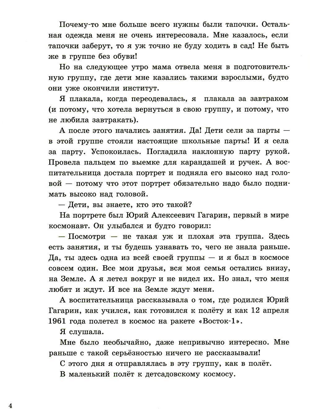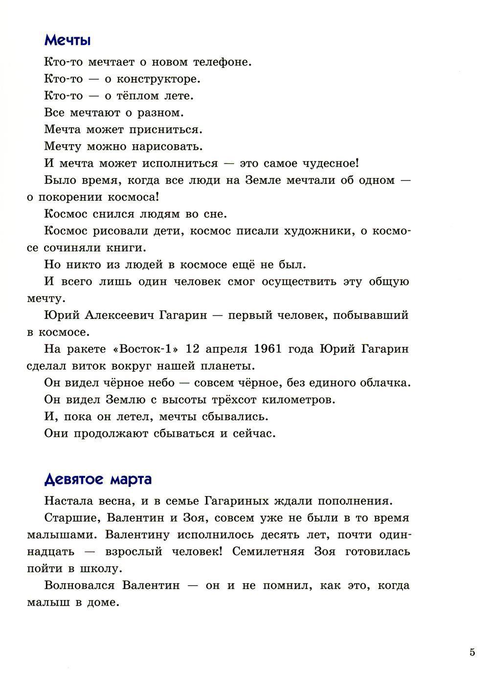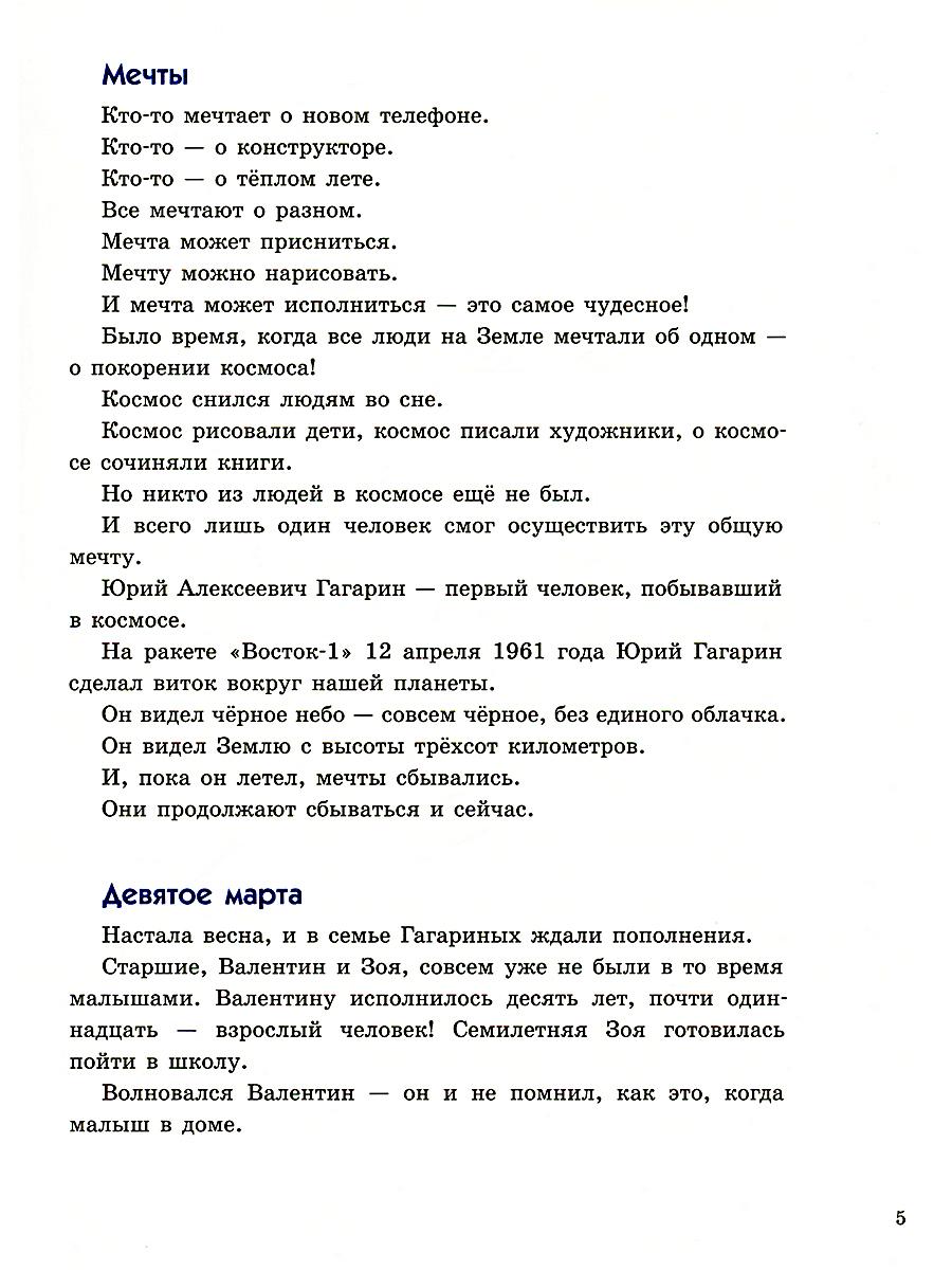 Книга представляет собой сборник художественных биографий известных российских космонавтов, написанных современными детскими писателями специально для детей. Самыми первыми отправились в путешествие к звёздам… мечтатели. А космонавты? А космонавты вначале тоже были мечтателями. И маленький Юра Гагарин, и Паша Попович, и Володя Джанибеков, и Юра Усачёв, и Саша Лазуткин, и Серёжа Рязанский - все они много-много раз отправлялись в космос на крыльях мечты. Книга повествует о детстве самых знаменитых космонавтов, о том, как зарождалась мечта дотянуться до звезд и конечно о том, какой путь пришлось проделать каждому, чтобы эта мечта стала реальностью. Здесь читатель найдёт множество забавных и трогательных фактов о каждом из героев. Наверное, мало кто знает, что Юрий Гагарин любил очень громко играть на трубе, а Павел Попович летал и пел. Кроме того, книга познакомит с космическим бытом, расскажет о работе на международной космической станции и о том, какие необычные задачи и поручения порой выполняют космонавты. К примеру, Сергею Рязанскому однажды поручили сфотографировать Эльбрус. Благодаря сделанной фотографии удалось найти и спасти пропавших туристов. В книге много иллюстраций, все биографии написаны живым и проникновенным языком. По сути это книга об отечественных мирных героях на кого можно ровняться и с кого брать пример трудолюбия и упорства, веры в свою мечту. Ну и, конечно это книга о мире во всем мире и о том, что в космосе нет границ и все мы: русские, американцы, итальянцы, китайцы на самом деле земляне.